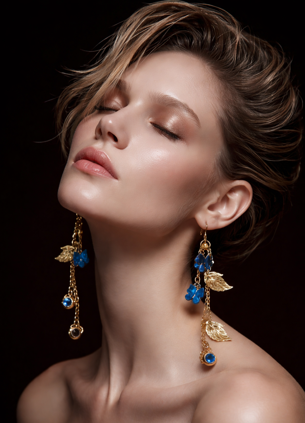 Leur design fin associe une délicate chaîne dorée, de subtils détails lumineux et de charmants papillons bleus qui semblent virevolter à vos oreilles.