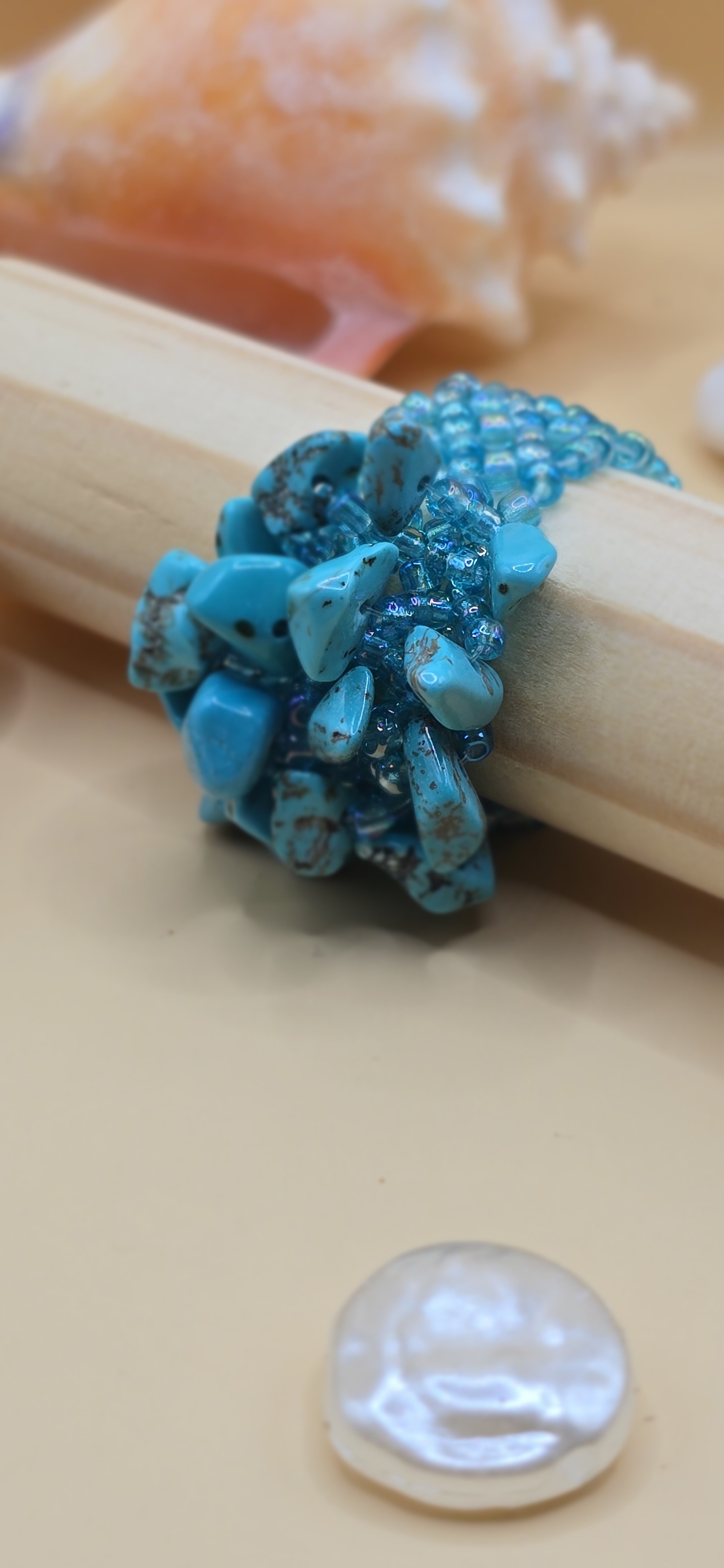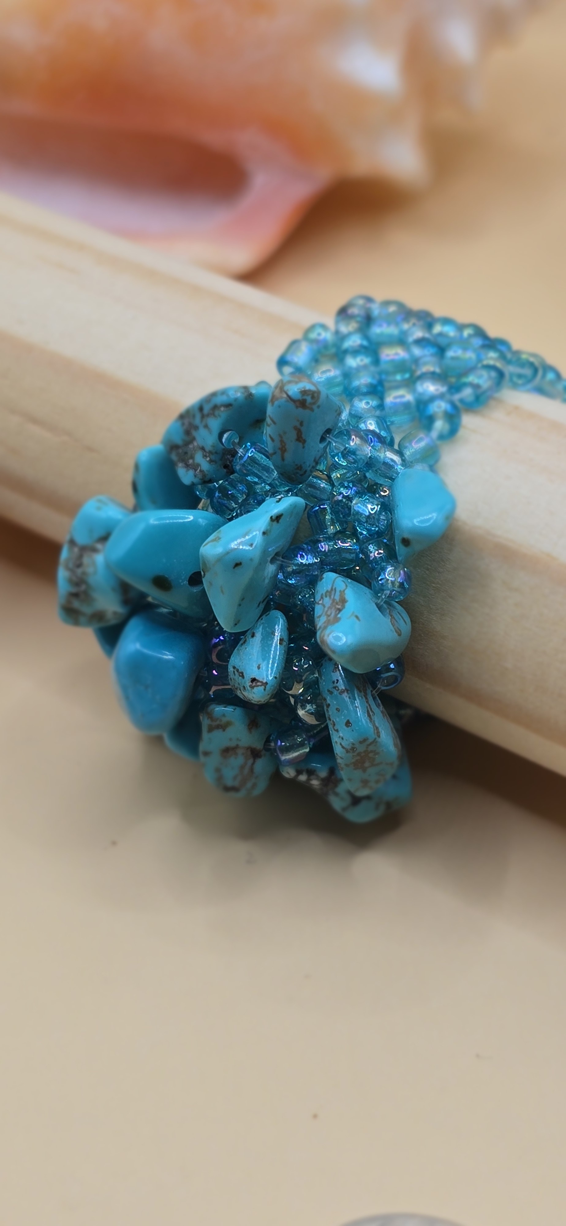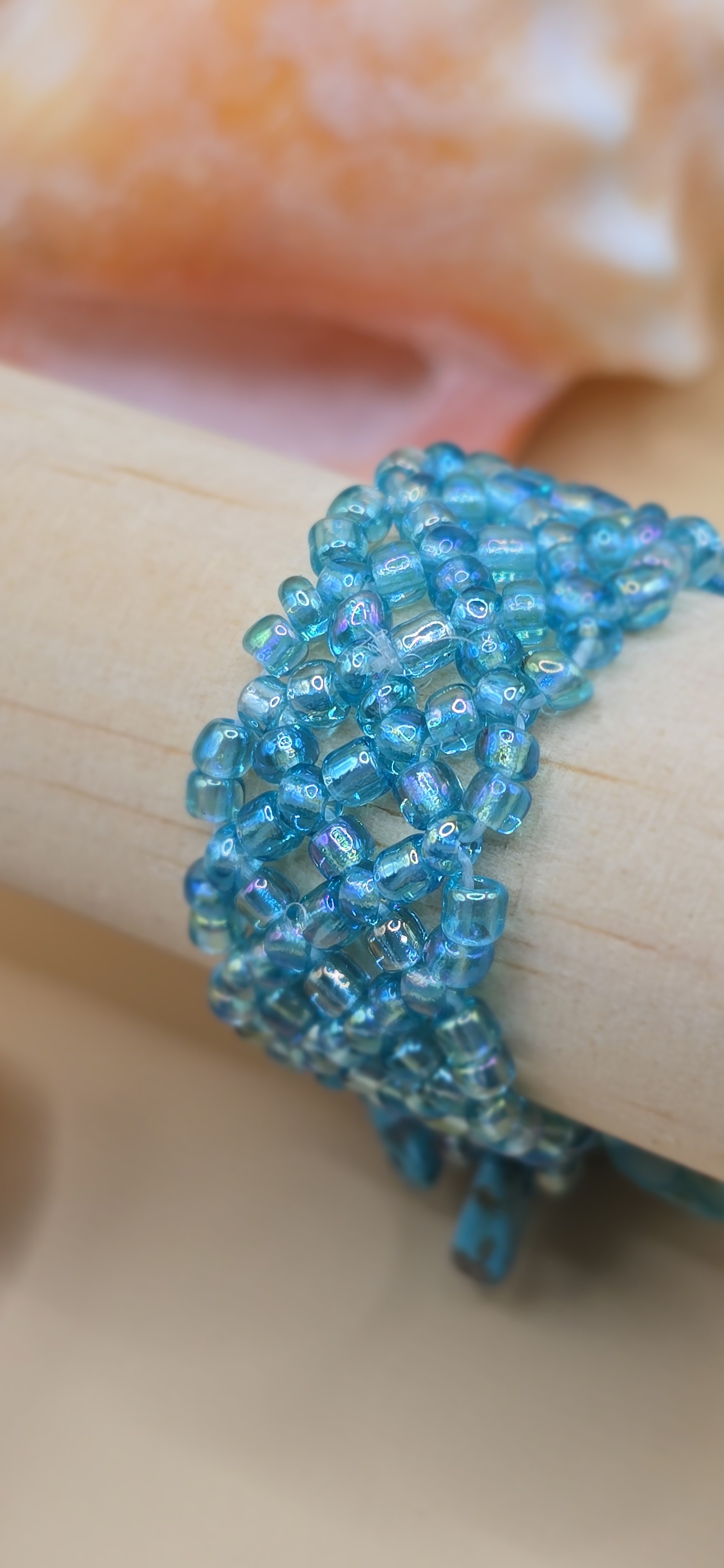 Bague tressée à la main avec de petites perles de rocaille bleu turquoise aux reflets dorés, rappelant les lucioles de nuit ou les reflets de l’océan.