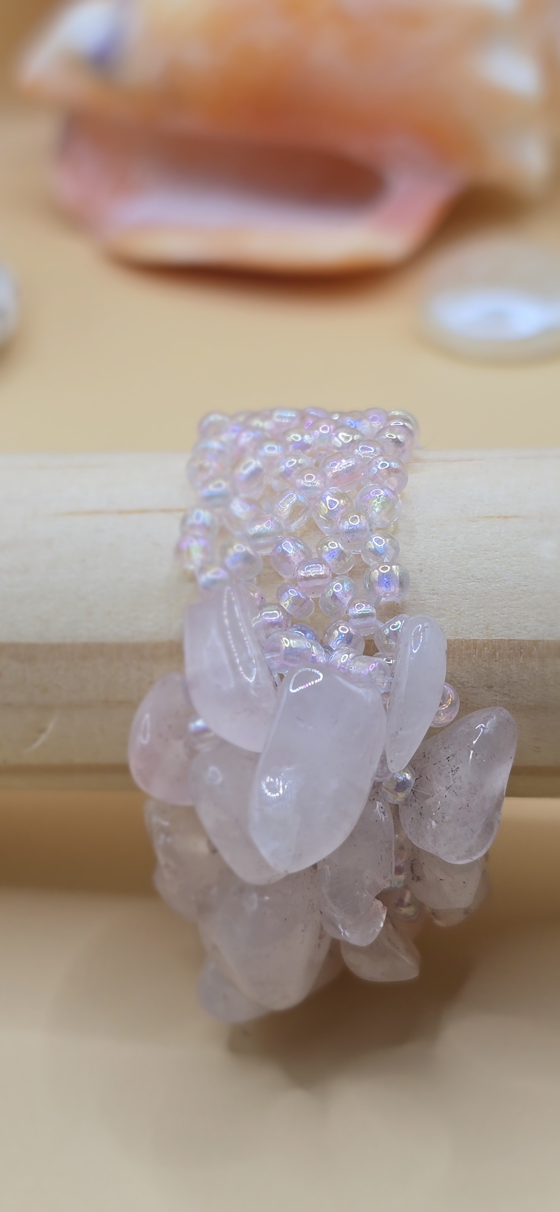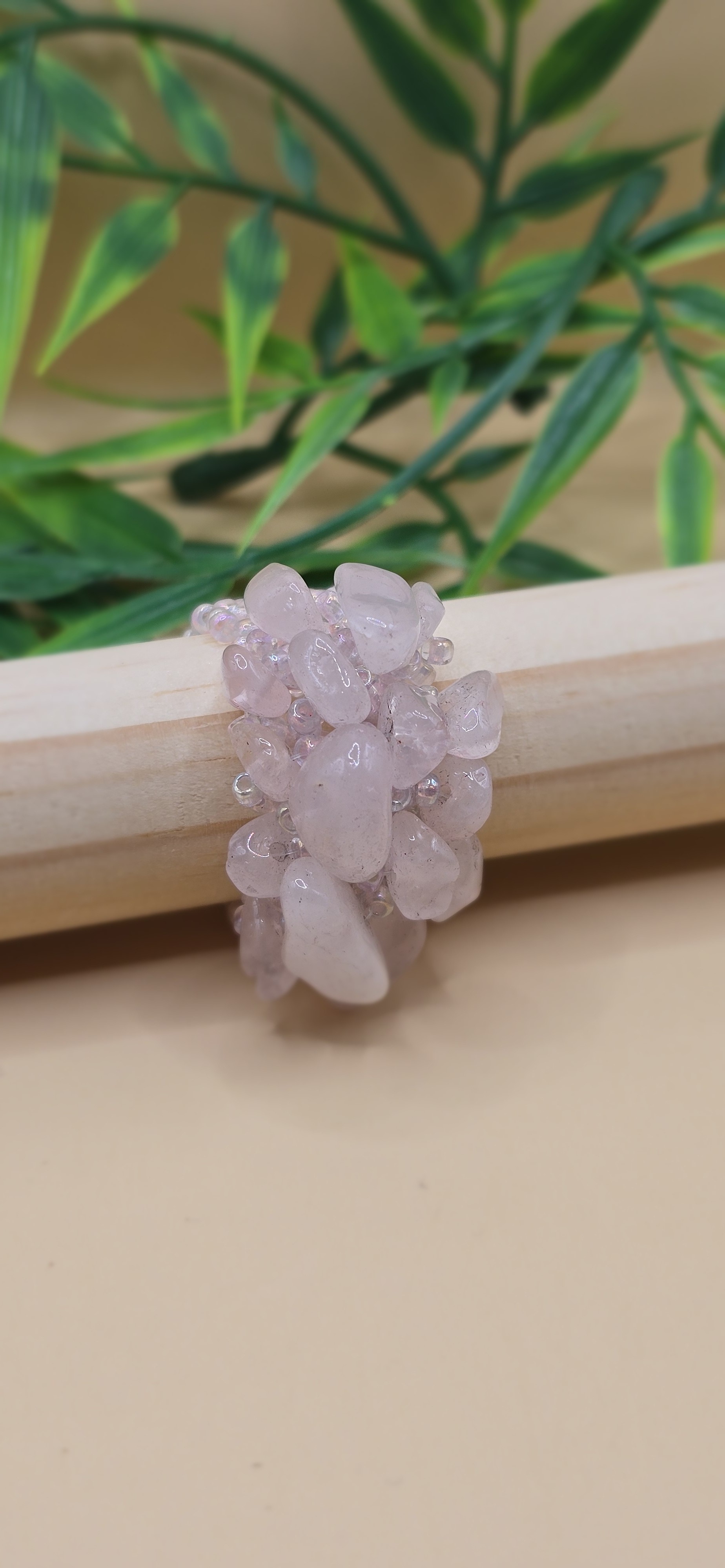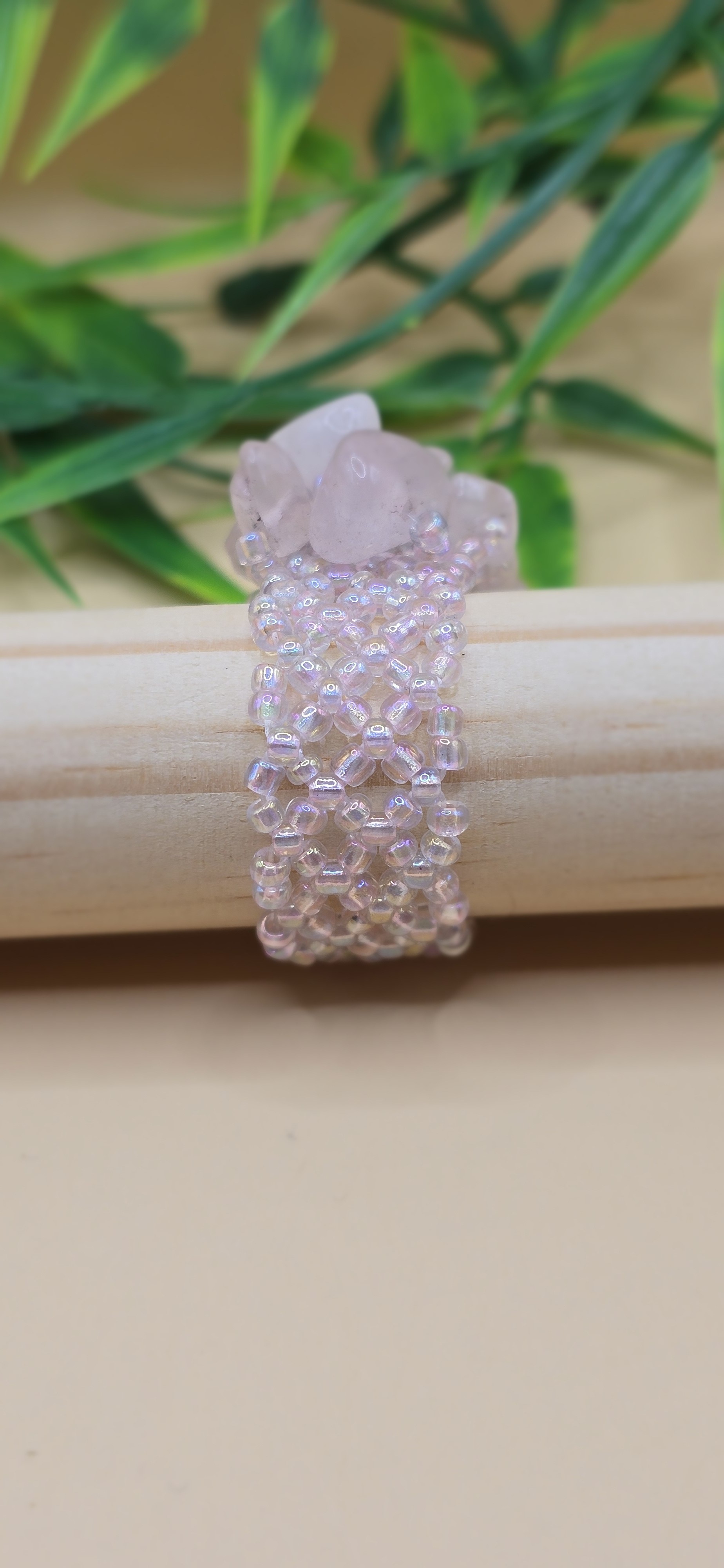 Bague tressée à la main avec de petites perles de rocaille roses, pourpres et translucides, rappelant la douceur des fleurs et la lumière tendre d’un soir poétique.