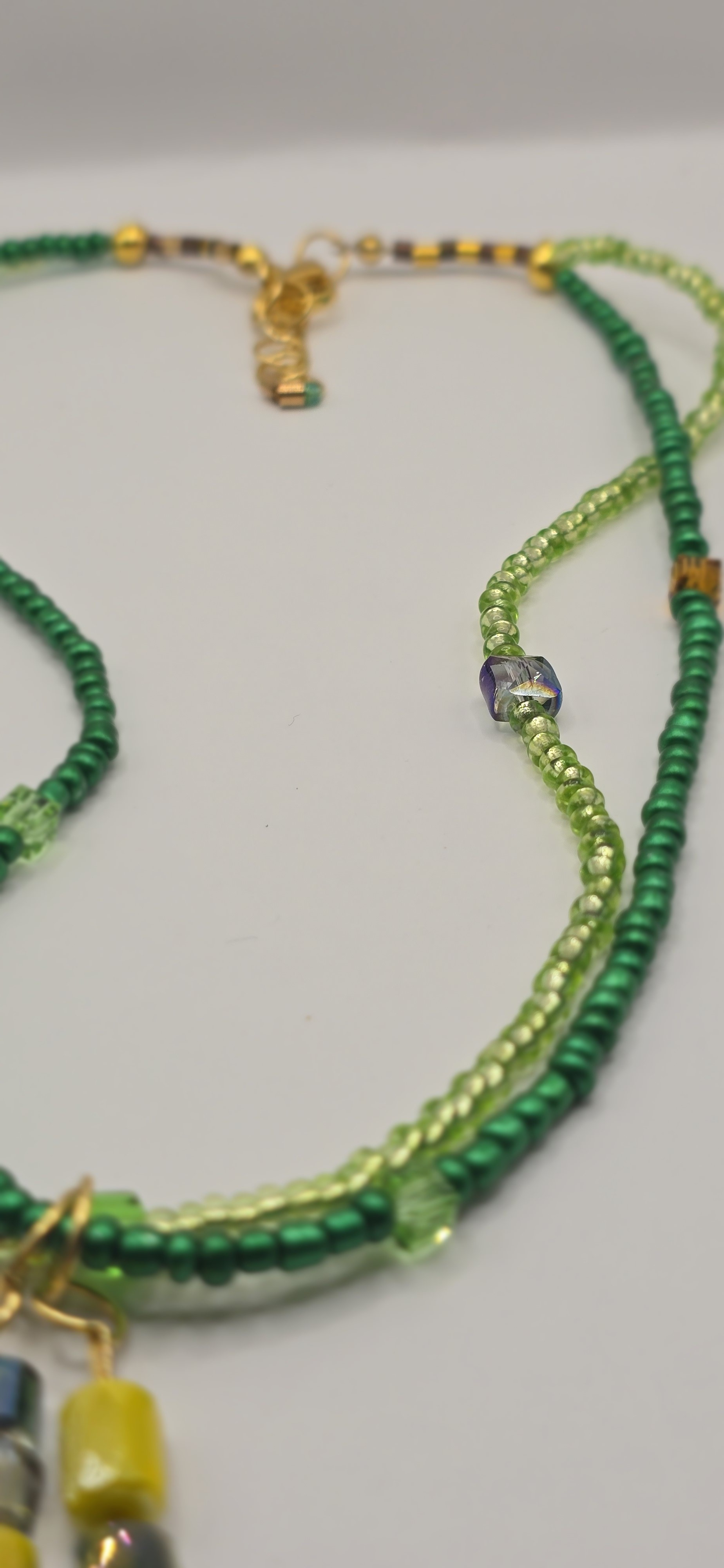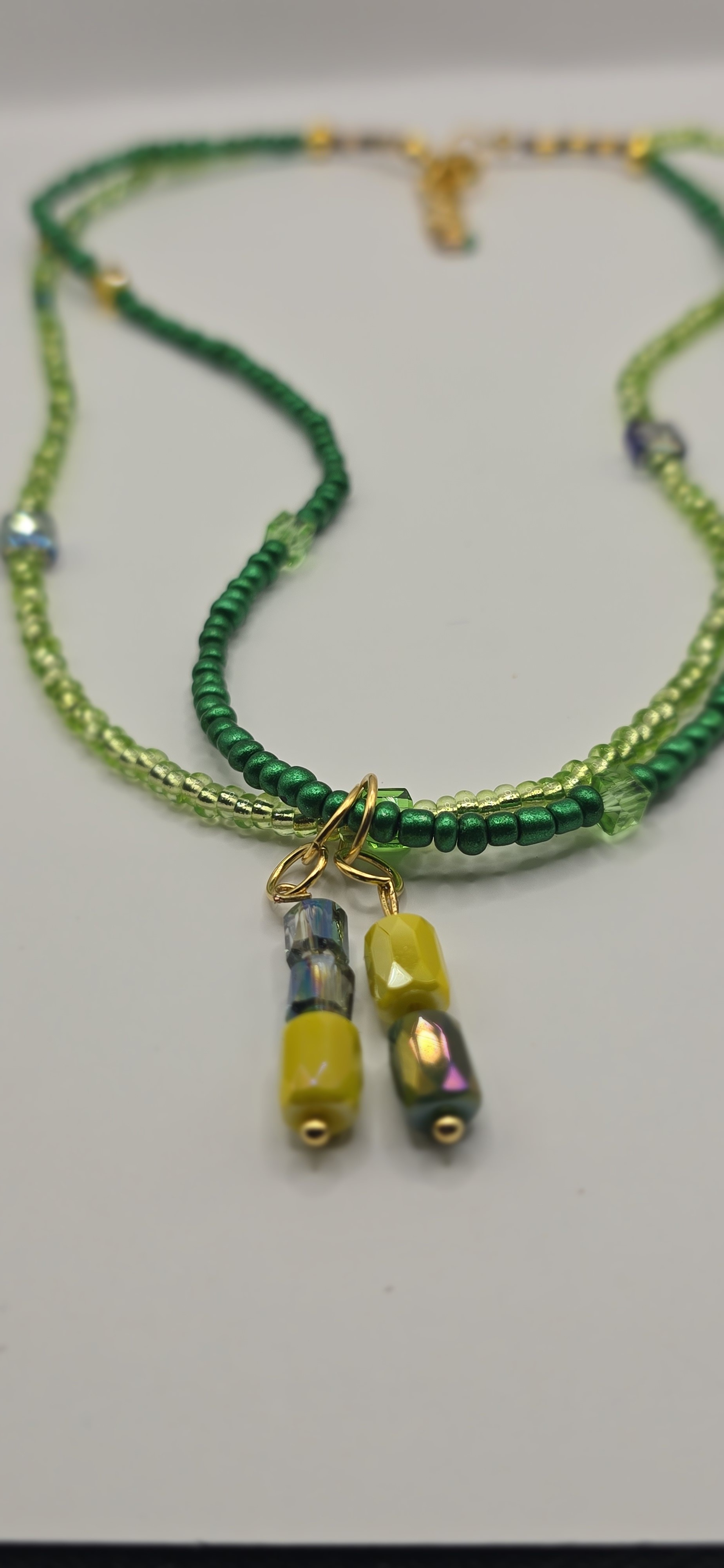 Cette pièce unique, faite main avec soin, allie des perles aux tons jaune, vert et doré avec de subtils reflets qui captent la lumière à chaque mouvement.