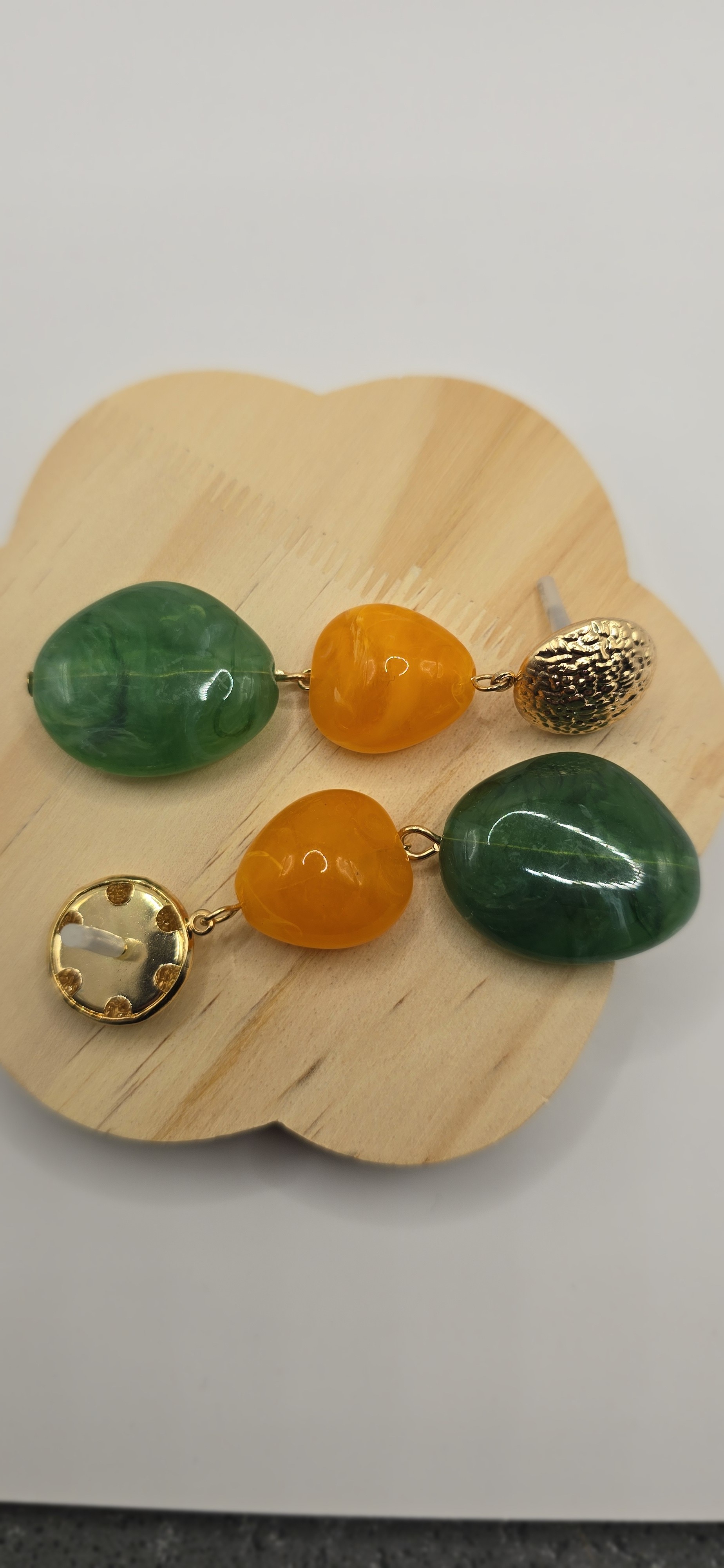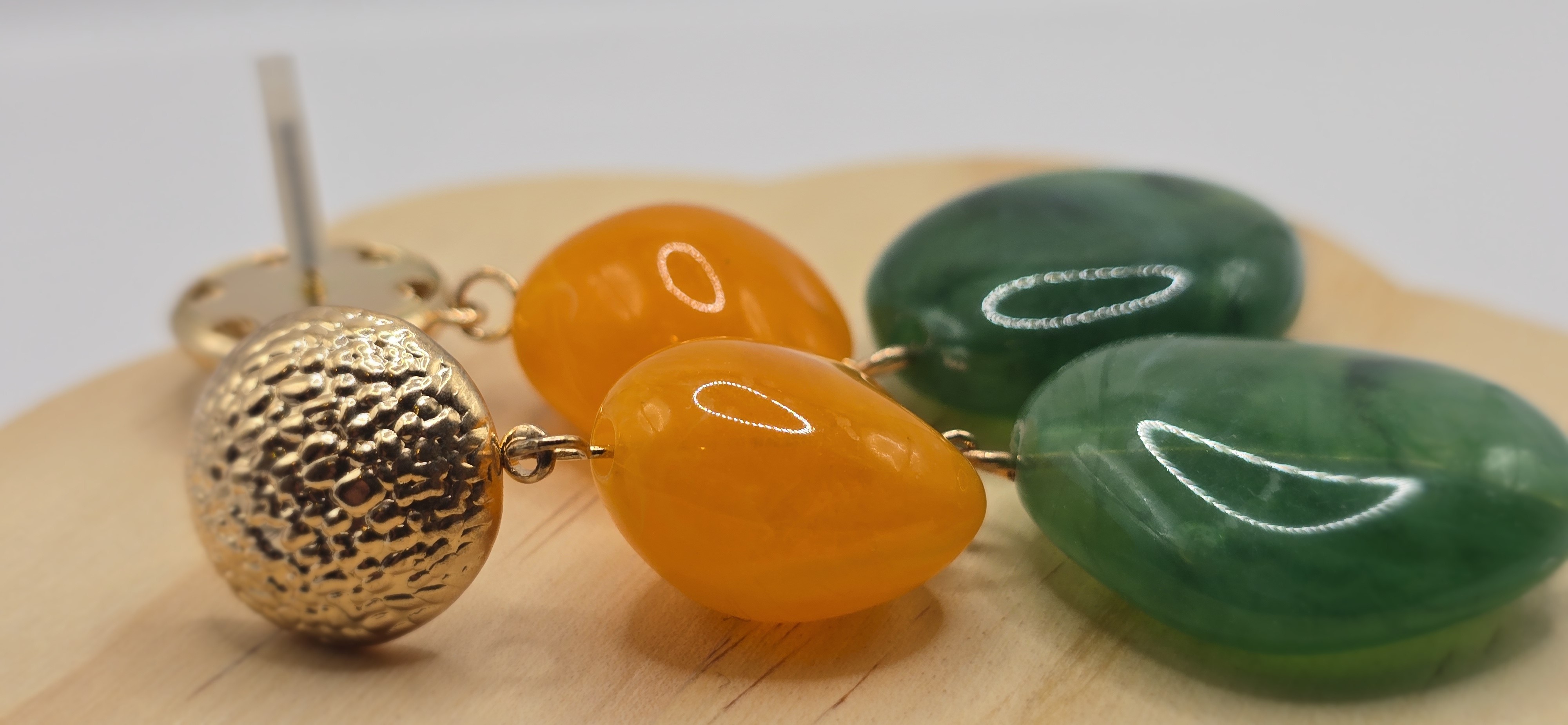 Inspirée de notre modèle Ambre de Bois, cette version lumineuse d’Ambre de Soleil associe de grosses perles orange et vertes pour un contraste chaleureux et élégant. Le fermoir doré apporte une touche raffinée et complète parfaitement le design.