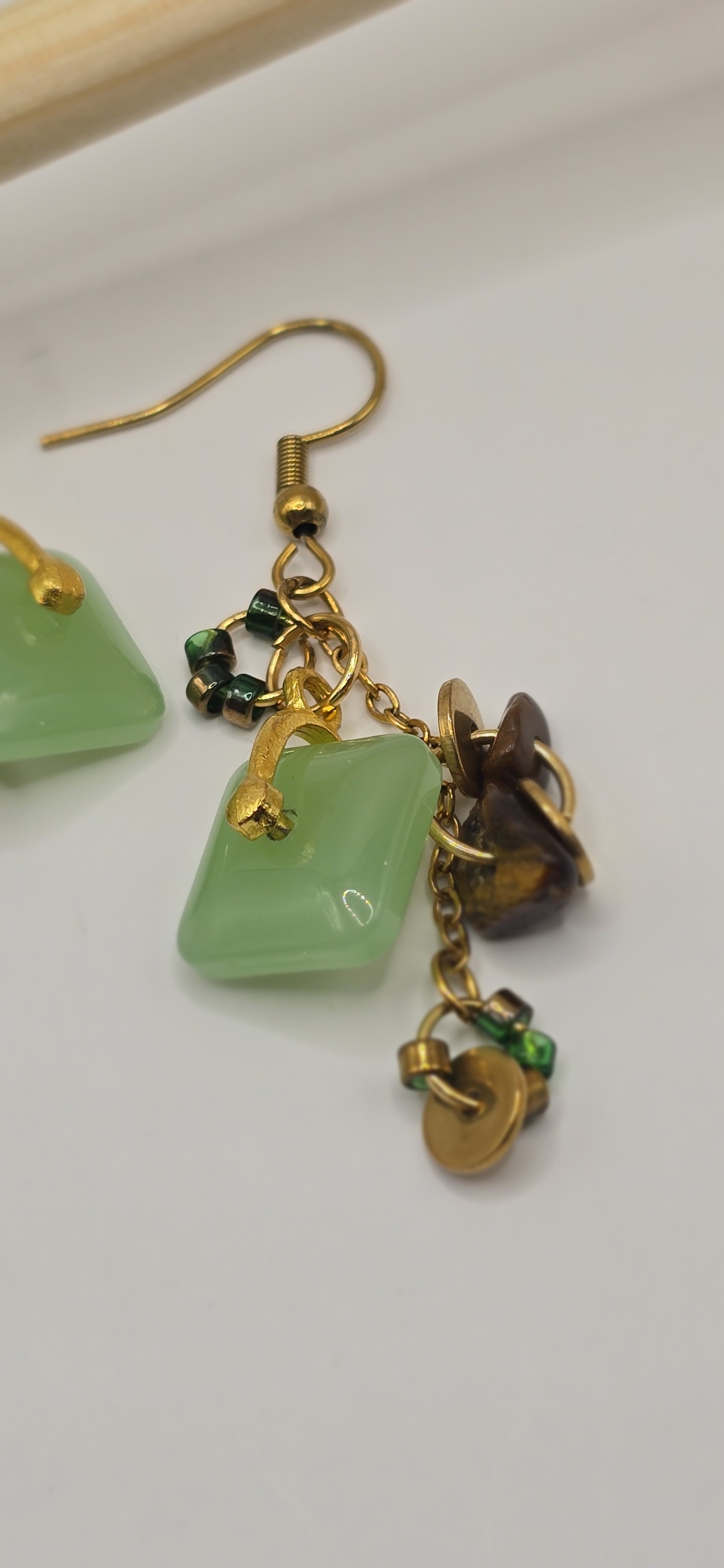 cette boucle d’oreille associe de délicates perles de jade et de rocaille, agrémentées de petits charmes ronds dorés. Le fermoir et la petite chaînette dorée apportent une finition élégante et raffinée.