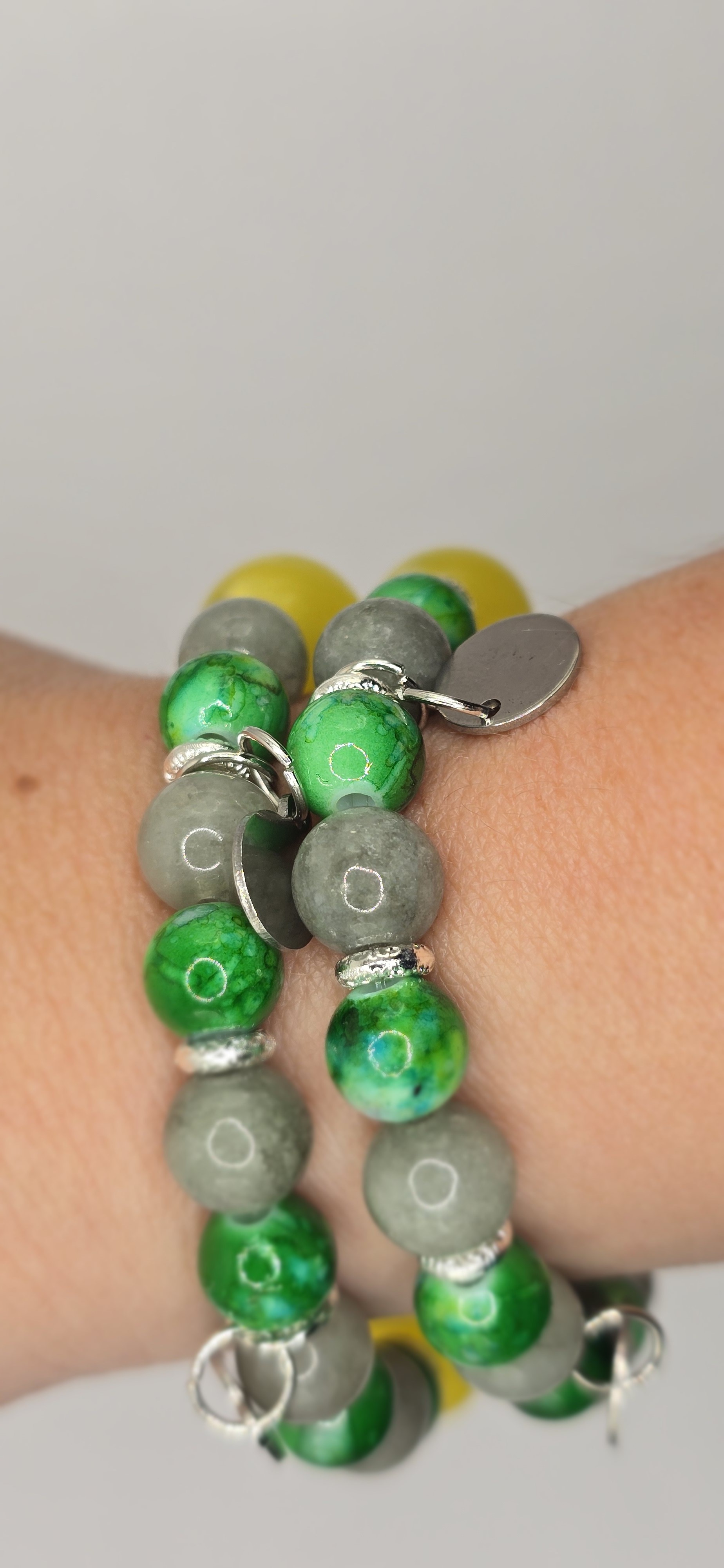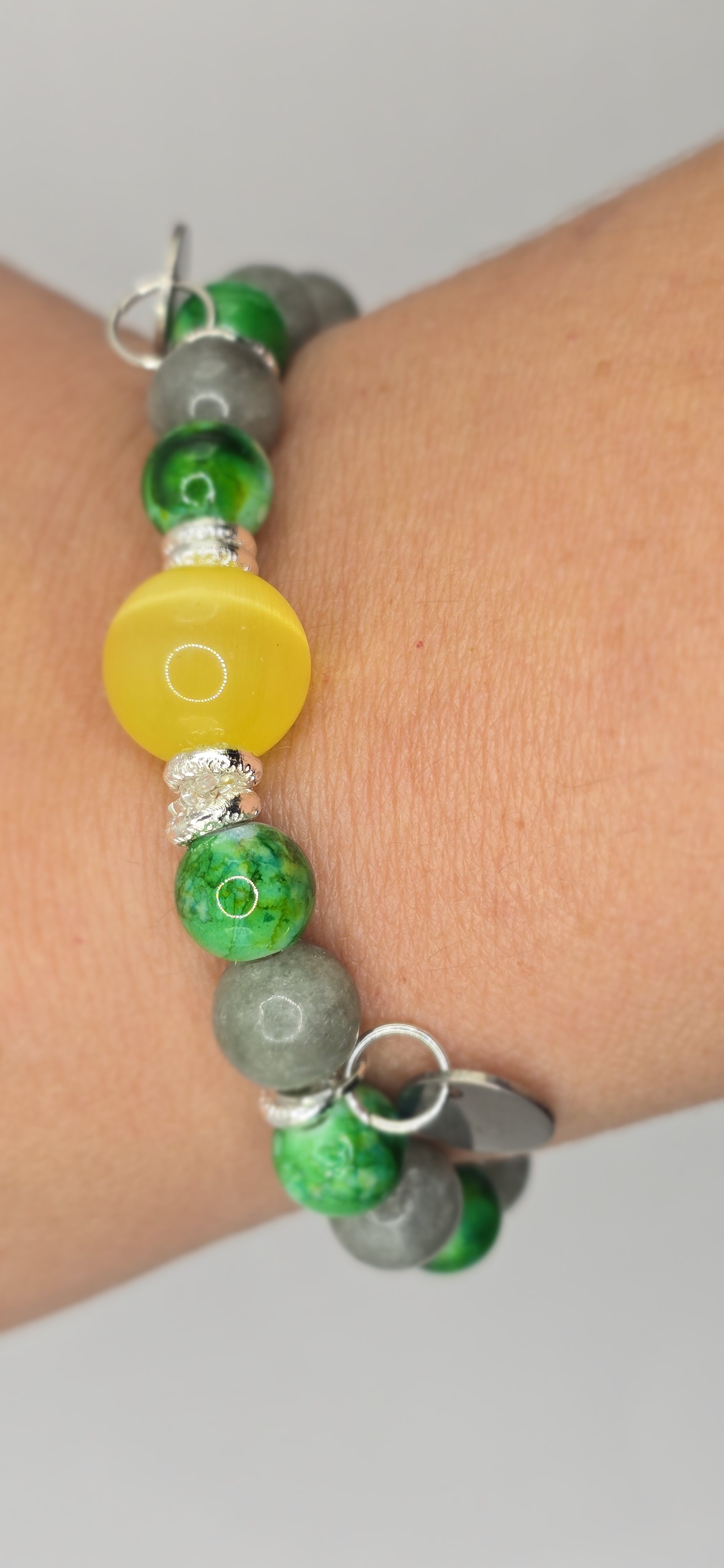Ce bracelet s’associe harmonieusement de perles grises de jaspe, vertes Malachites et jaunes Oeil du Tigre, ponctuées de séparateurs délicats et de deux petits charmes pour une touche raffinée. Sa composition colorée et subtile en fait un accessoire facile à porter au quotidien, pour apporter une note originale à vos tenues.