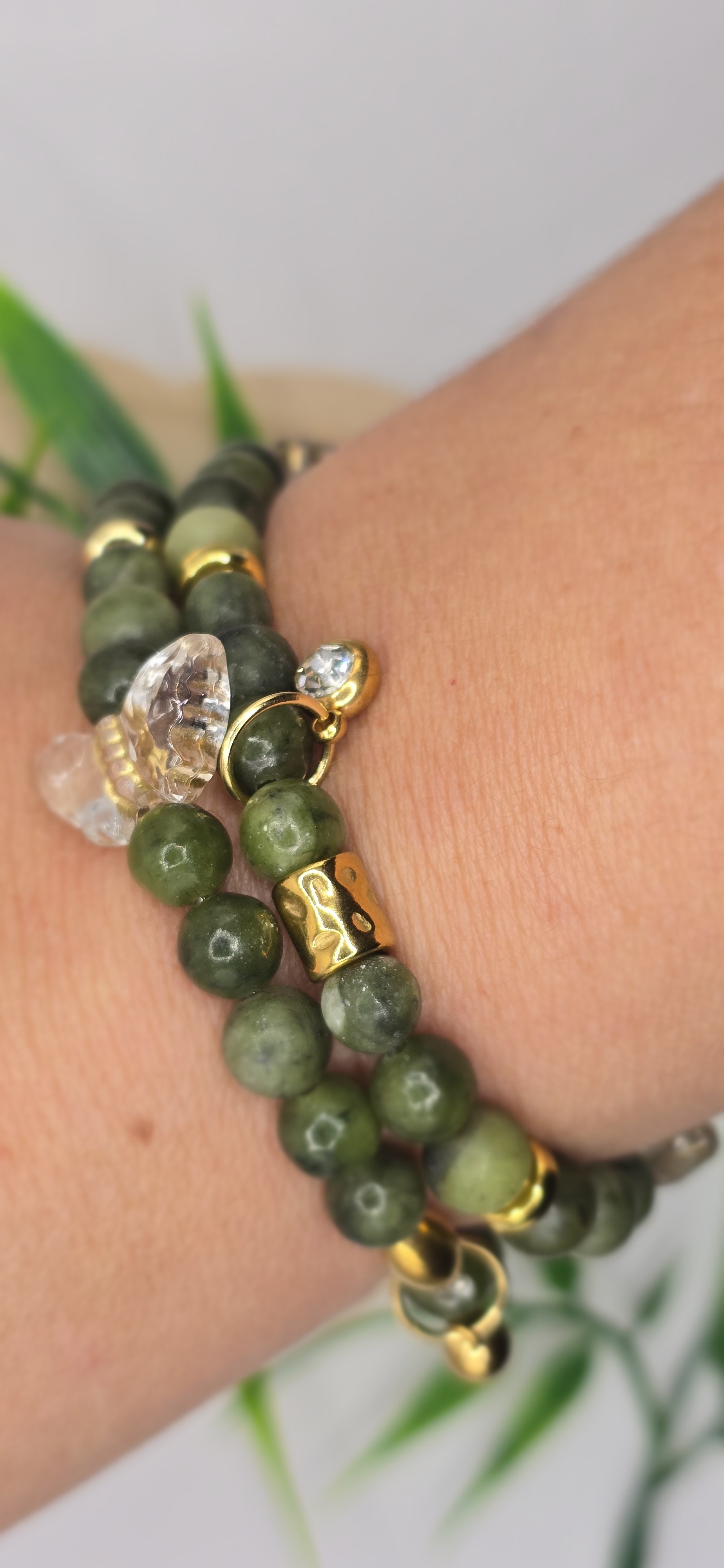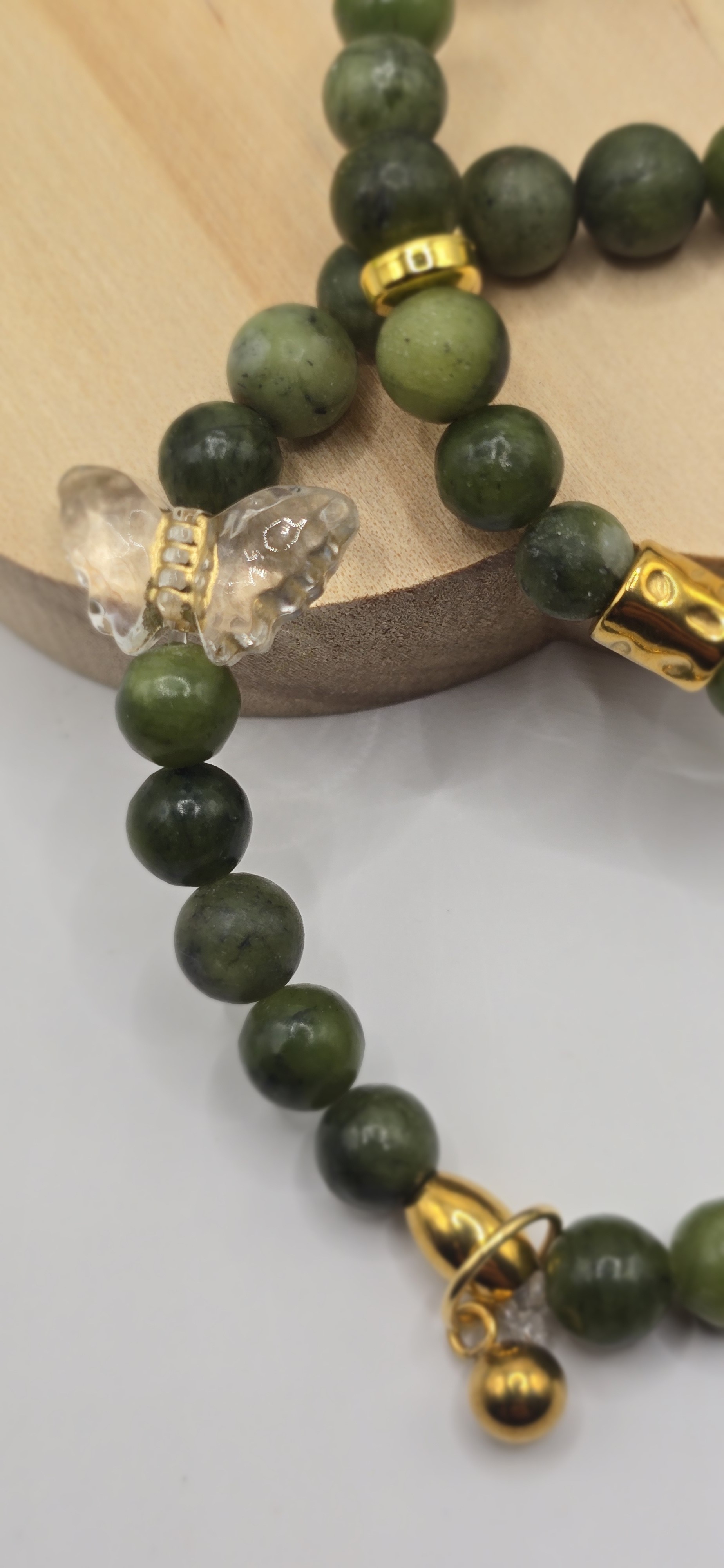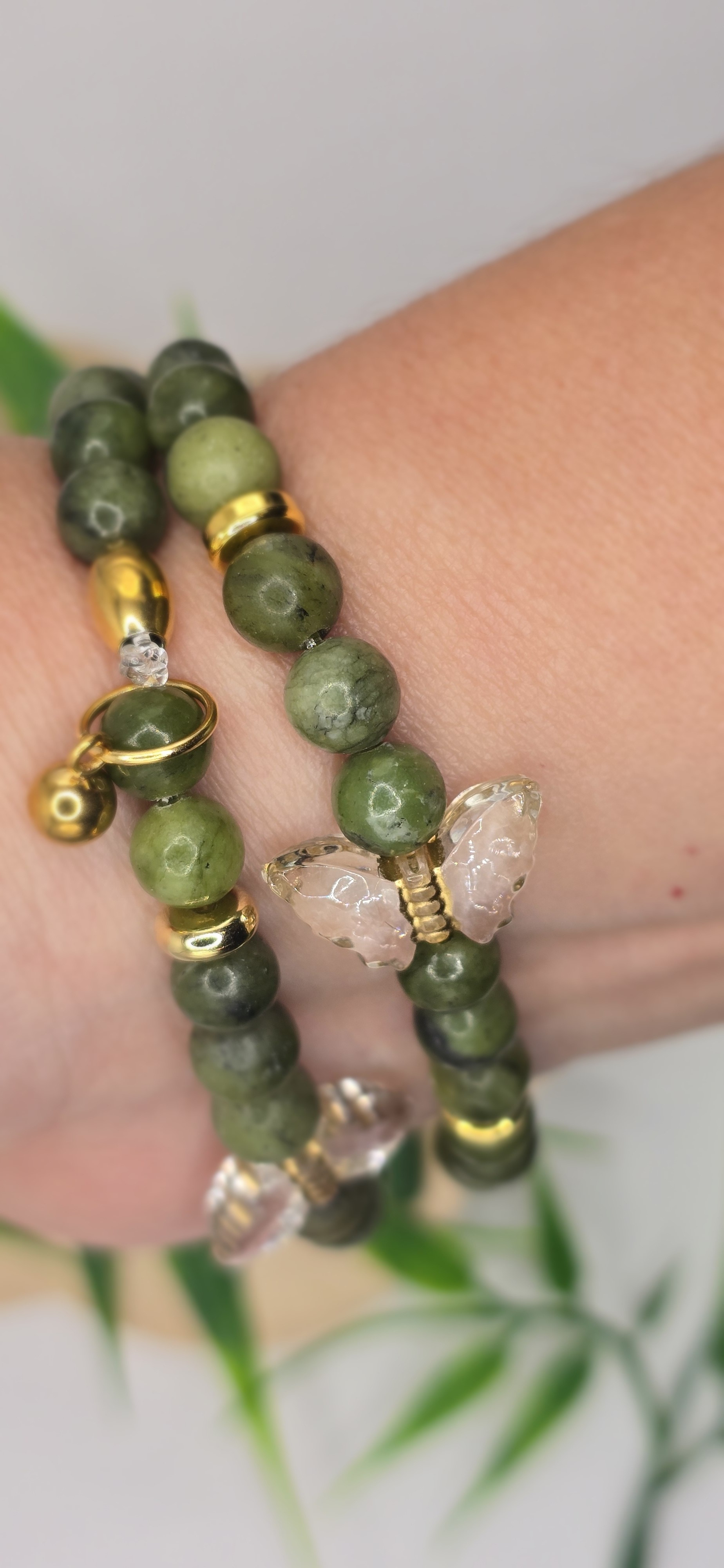 Duo de bracelets en véritables perles de jade verte, ponctués de séparateurs raffinés et de charmes délicats. L’un des bracelets présente un charm papillon transparent avec des nervures dorées, et l’autre un rond doré serti d’un strass transparent. De petites perles dorées en acier ajoutent une touche sophistiquée et lumineuse.