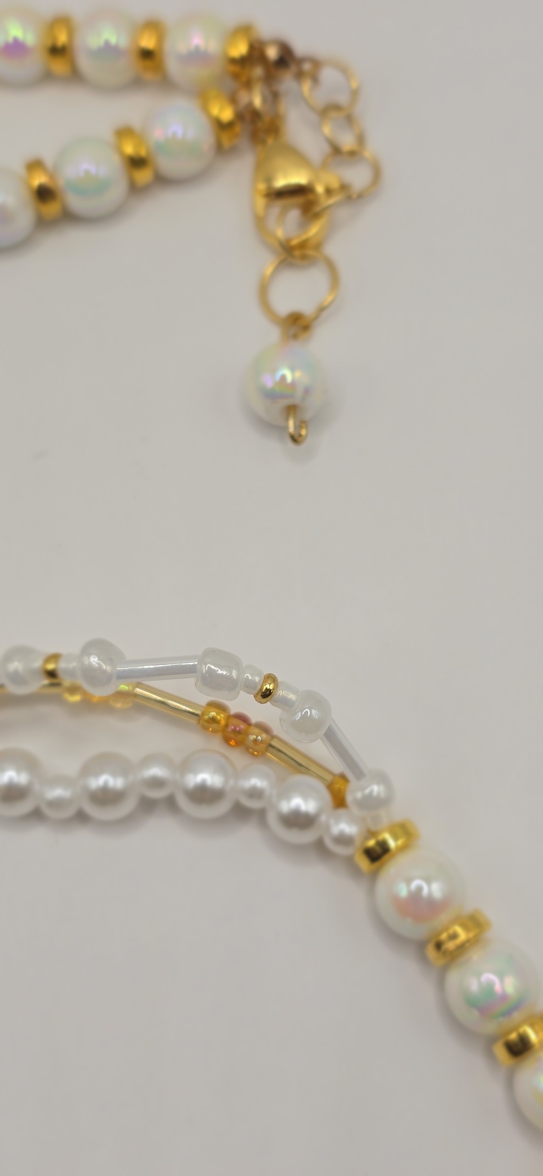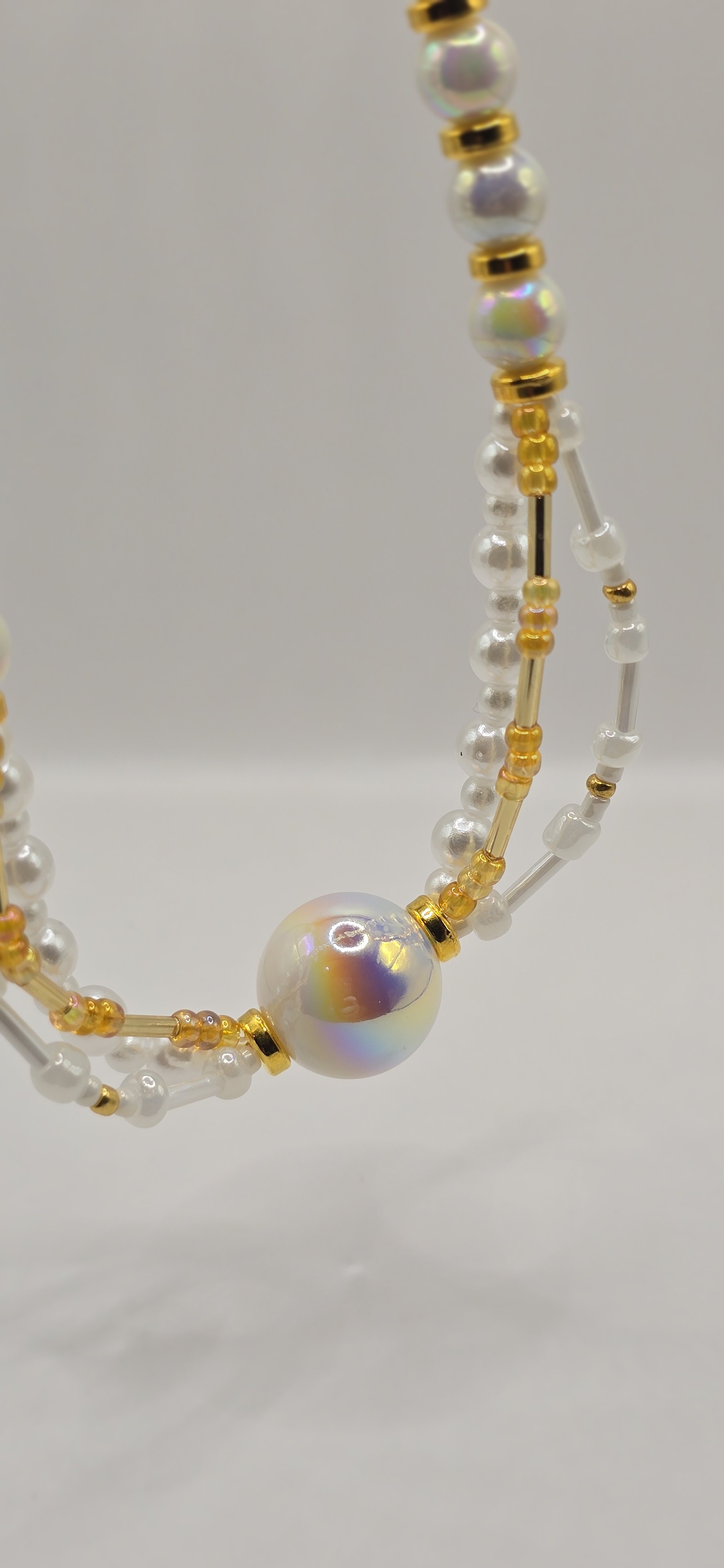 Ce collier à trois rangs croisés se compose de perles blanches nacrées de taille moyenne, offrant un éclat subtil et intemporel. Sa structure entrelacée apporte du volume et une touche de raffinement à toutes les tenues, qu’elles soient élégantes ou décontractées.