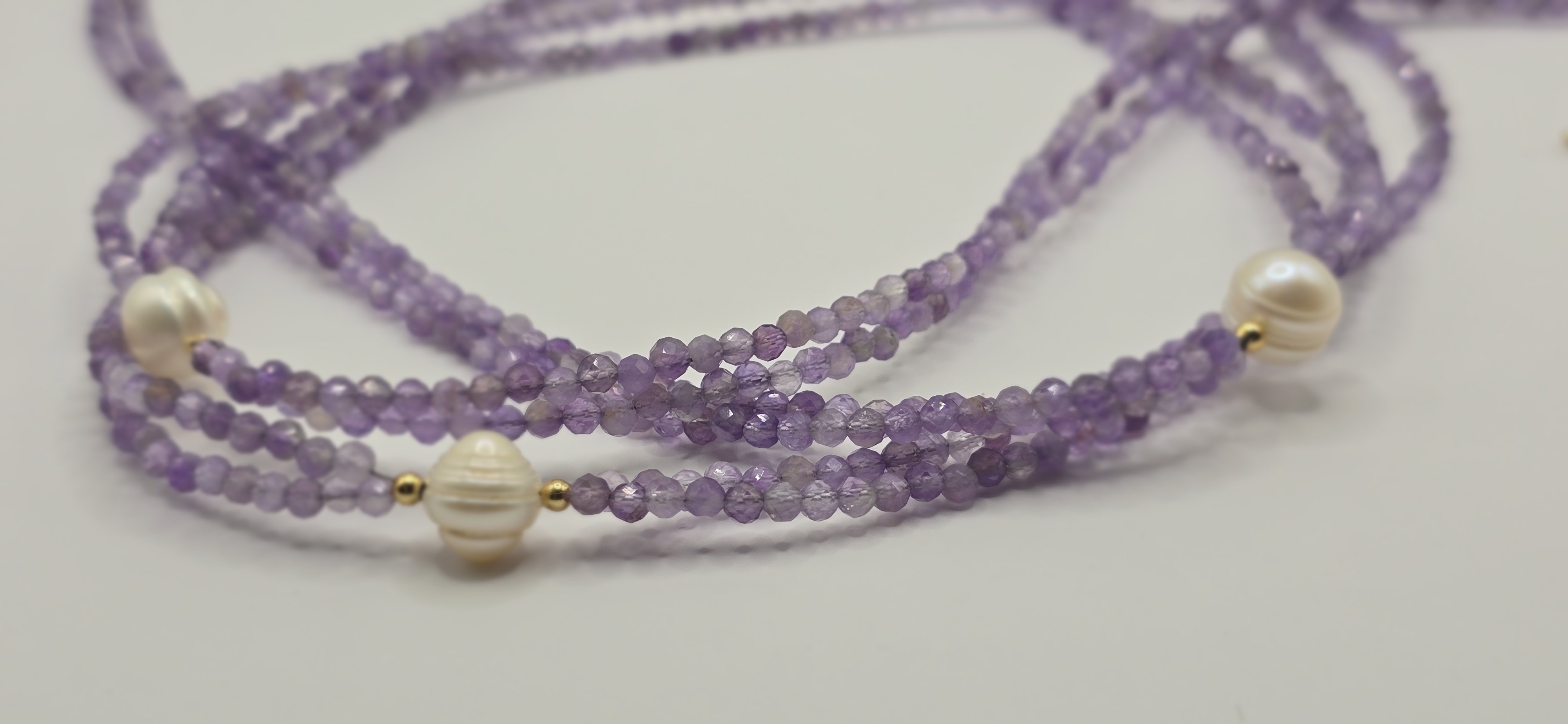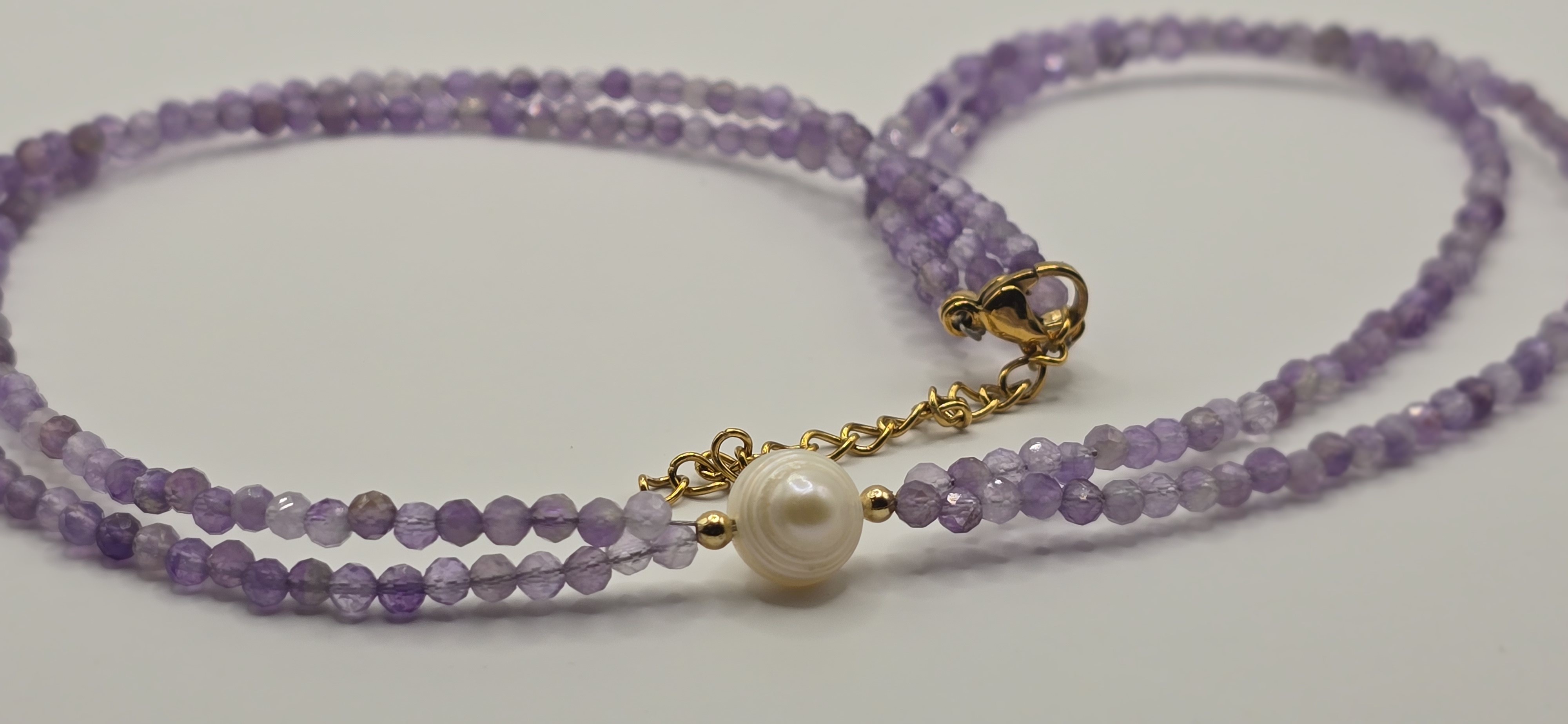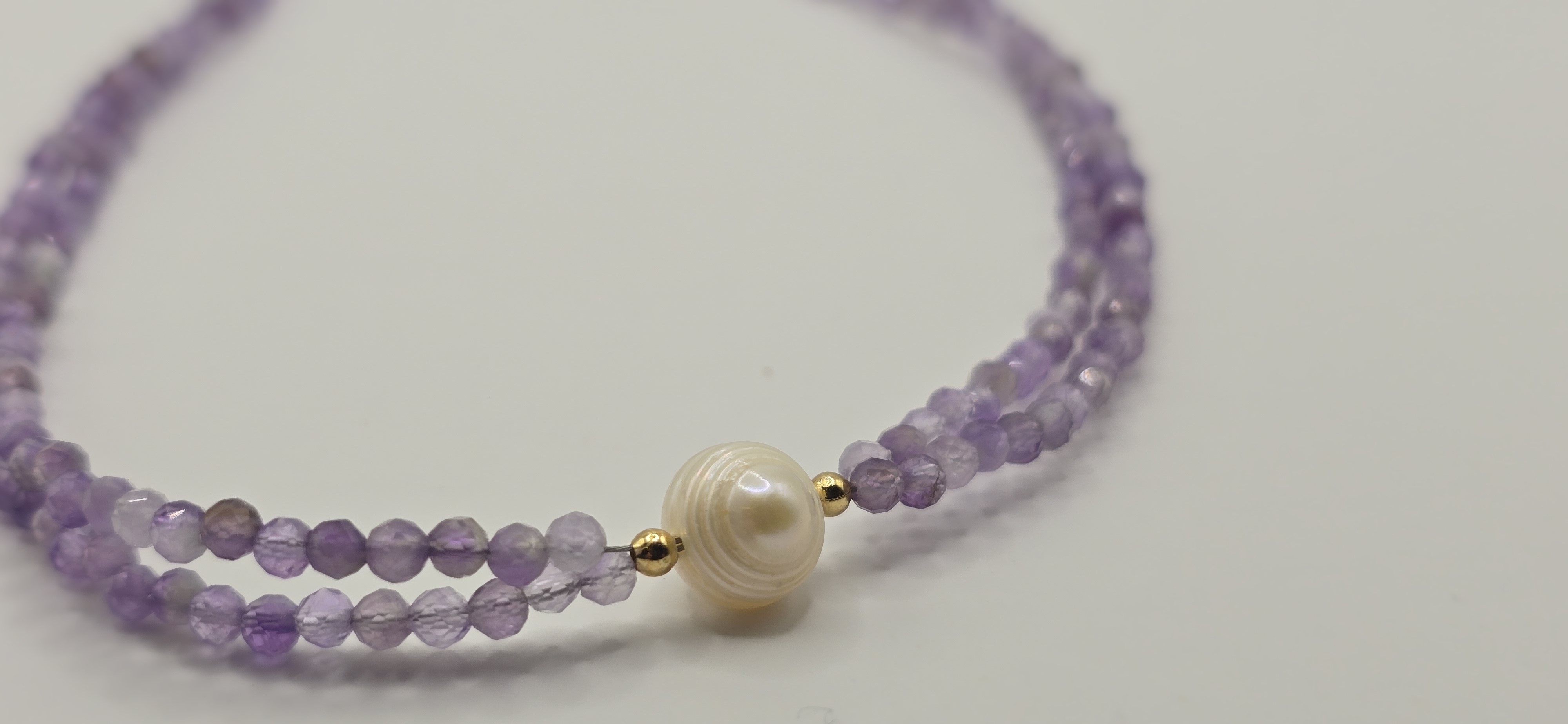 Un collier à deux rangs délicatement composés de perles de rocaille violettes transparentes, aux reflets doux et lumineux. Au centre, une perle de nacre naturelle attire la lumière et sublime la beauté du bijou.