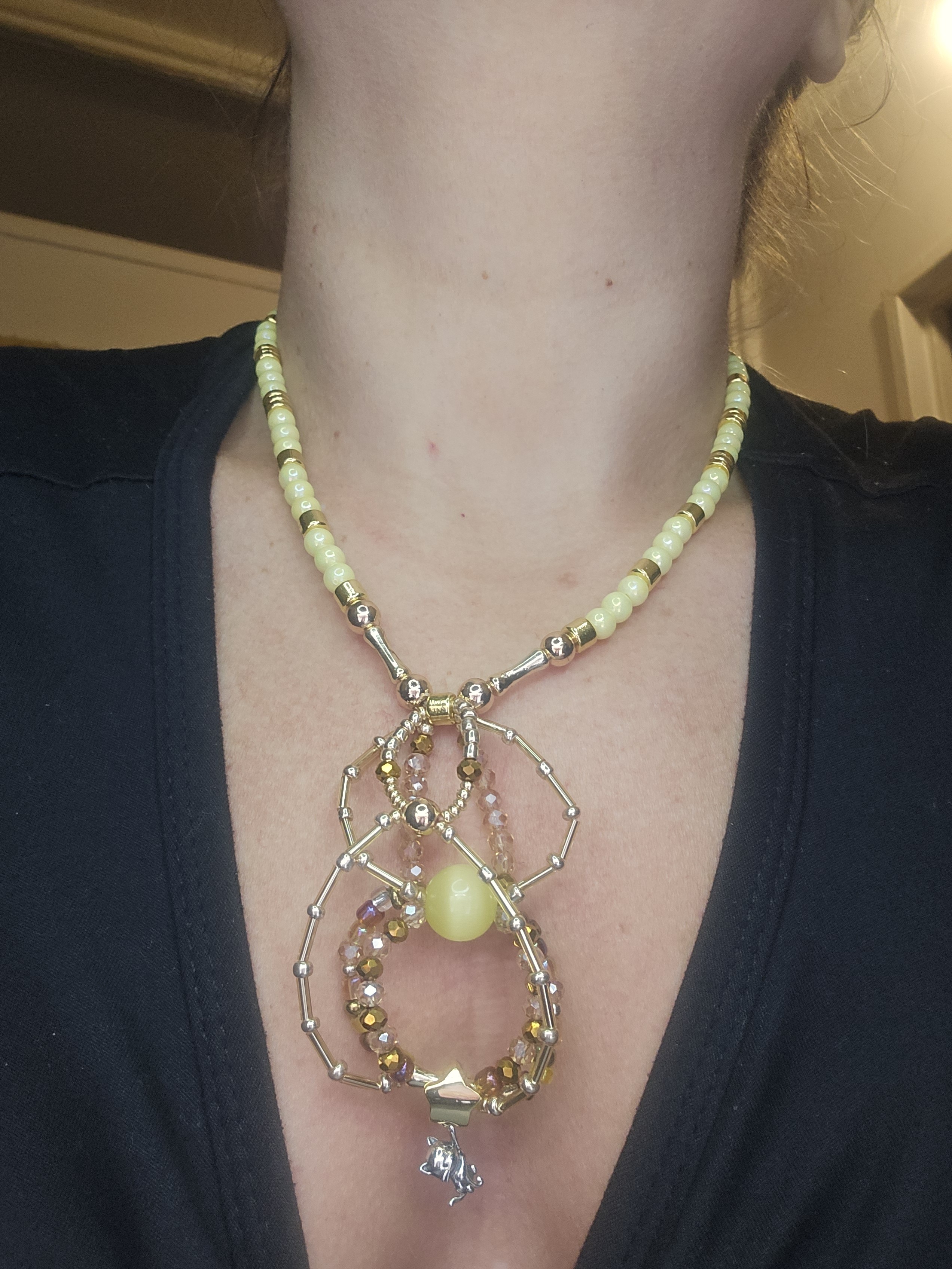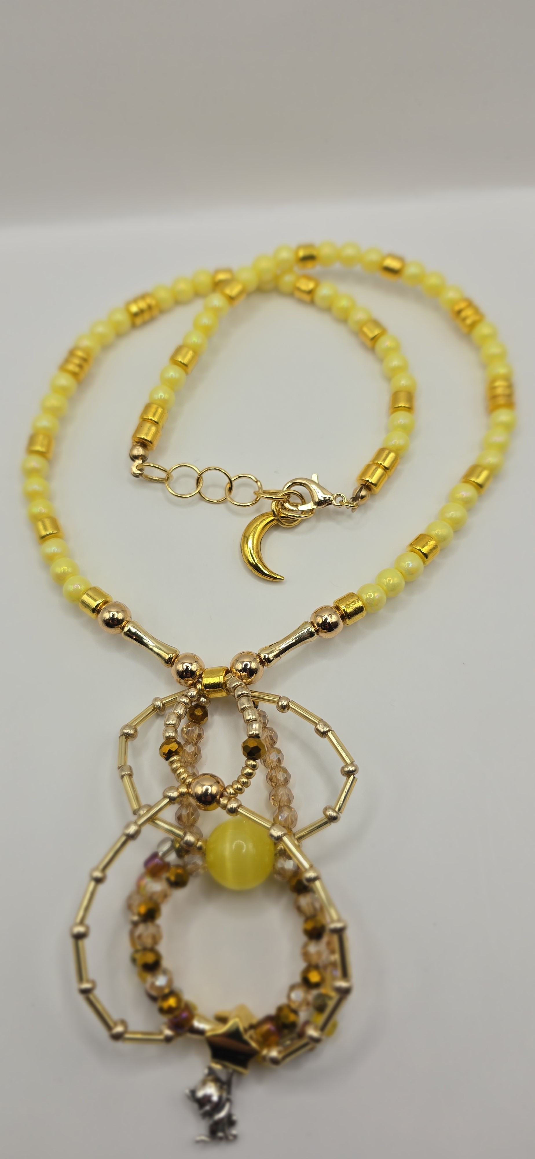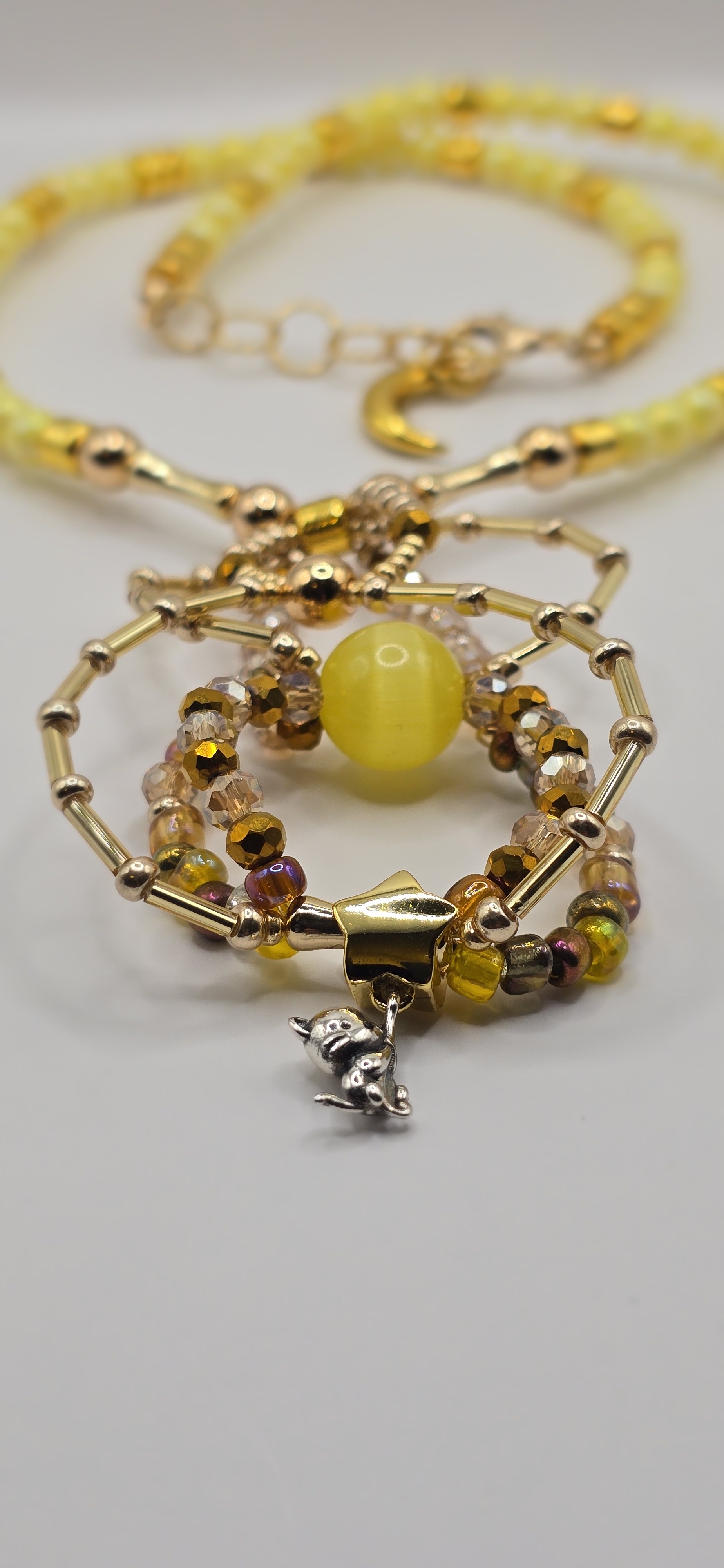 Contour en perles jaunes nacrées avec séparateurs dorés, pendentif cerf-moire doré orné d’une petite lune, pressage unique en perles de rocaille et tubulaires dorées en forme de 8, et charm chat tenant une étoile. 🐱⭐