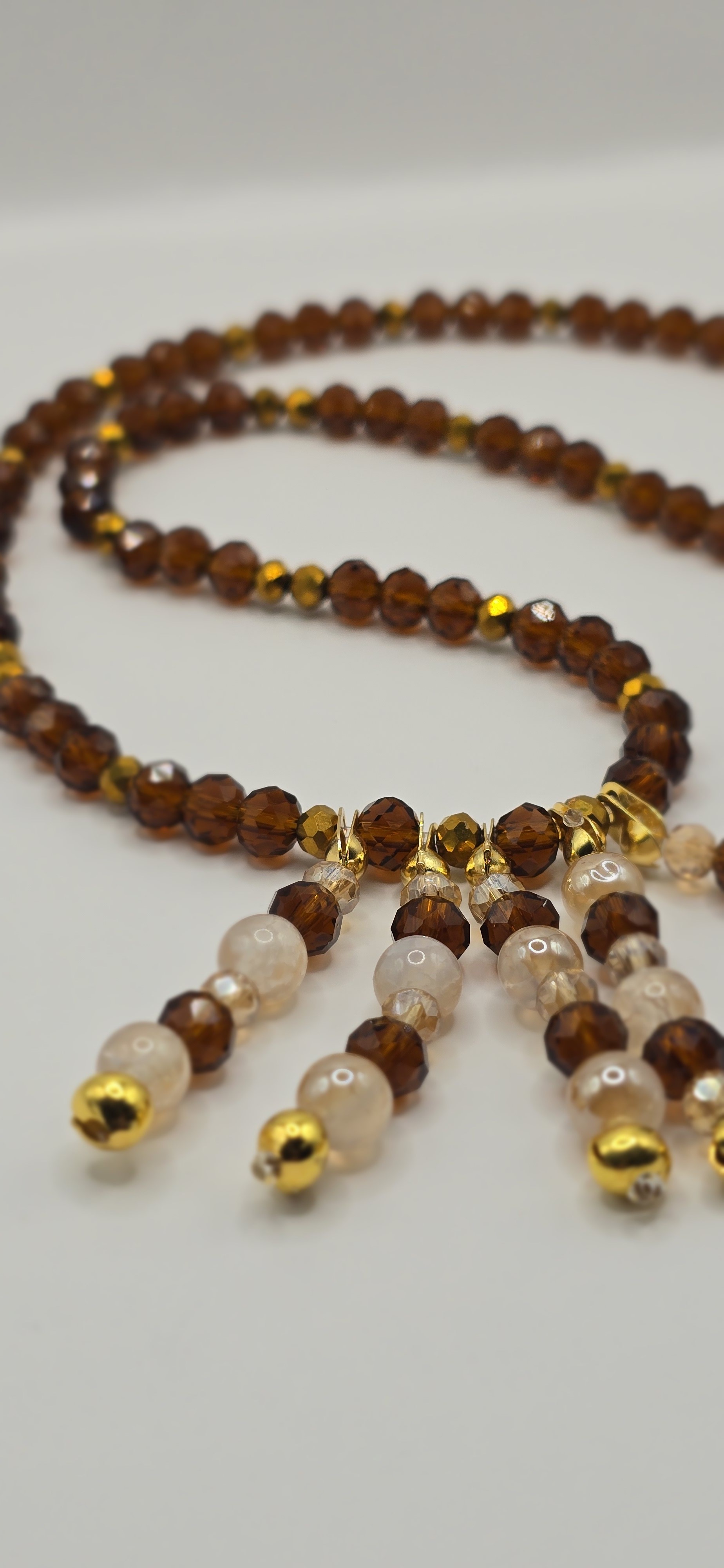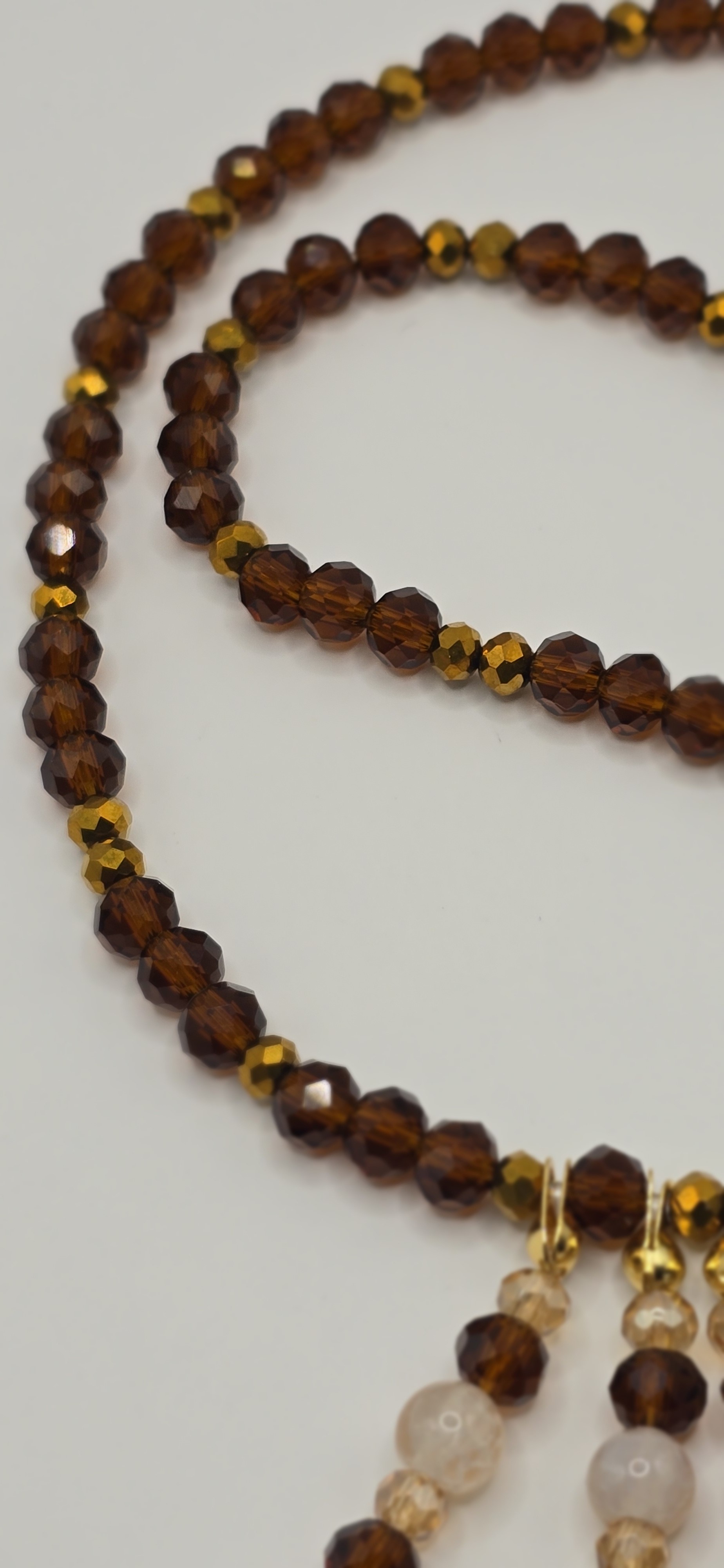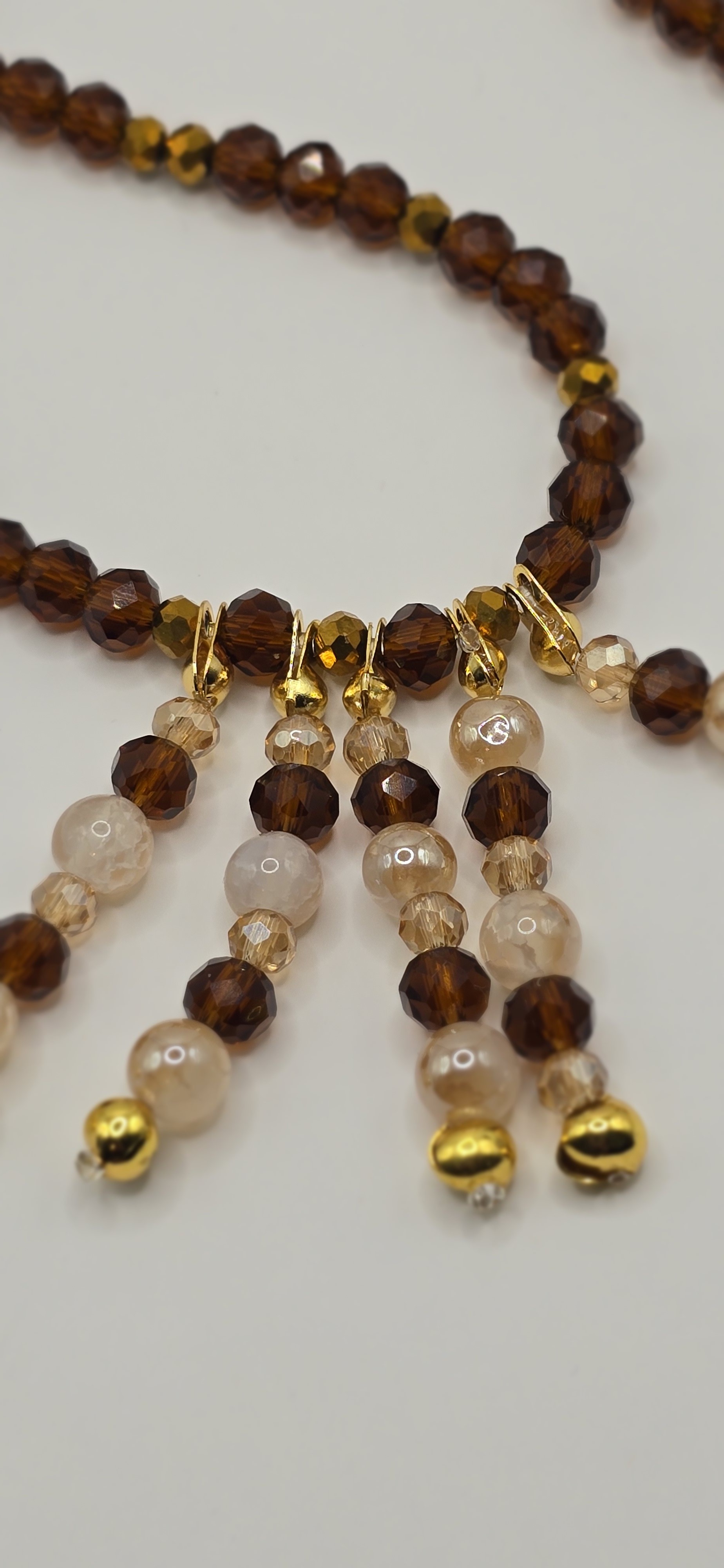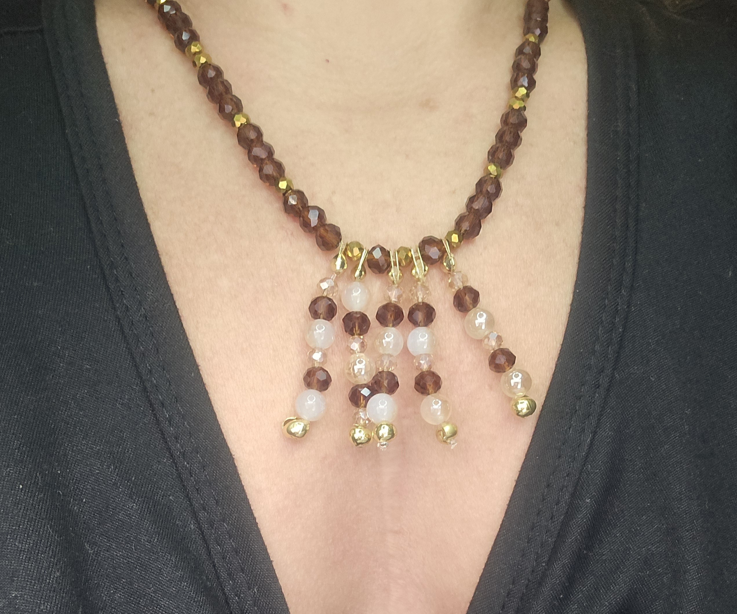 Collier rétro et lumineux, composé d’un rang unique de perles marron brillantes rehaussées de touches dorées façon boules à facettes.