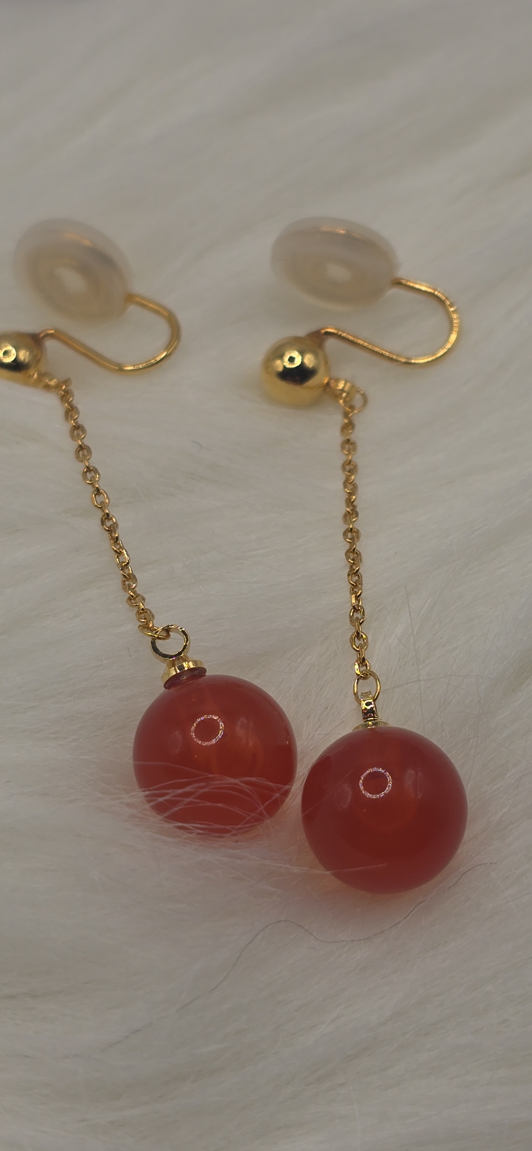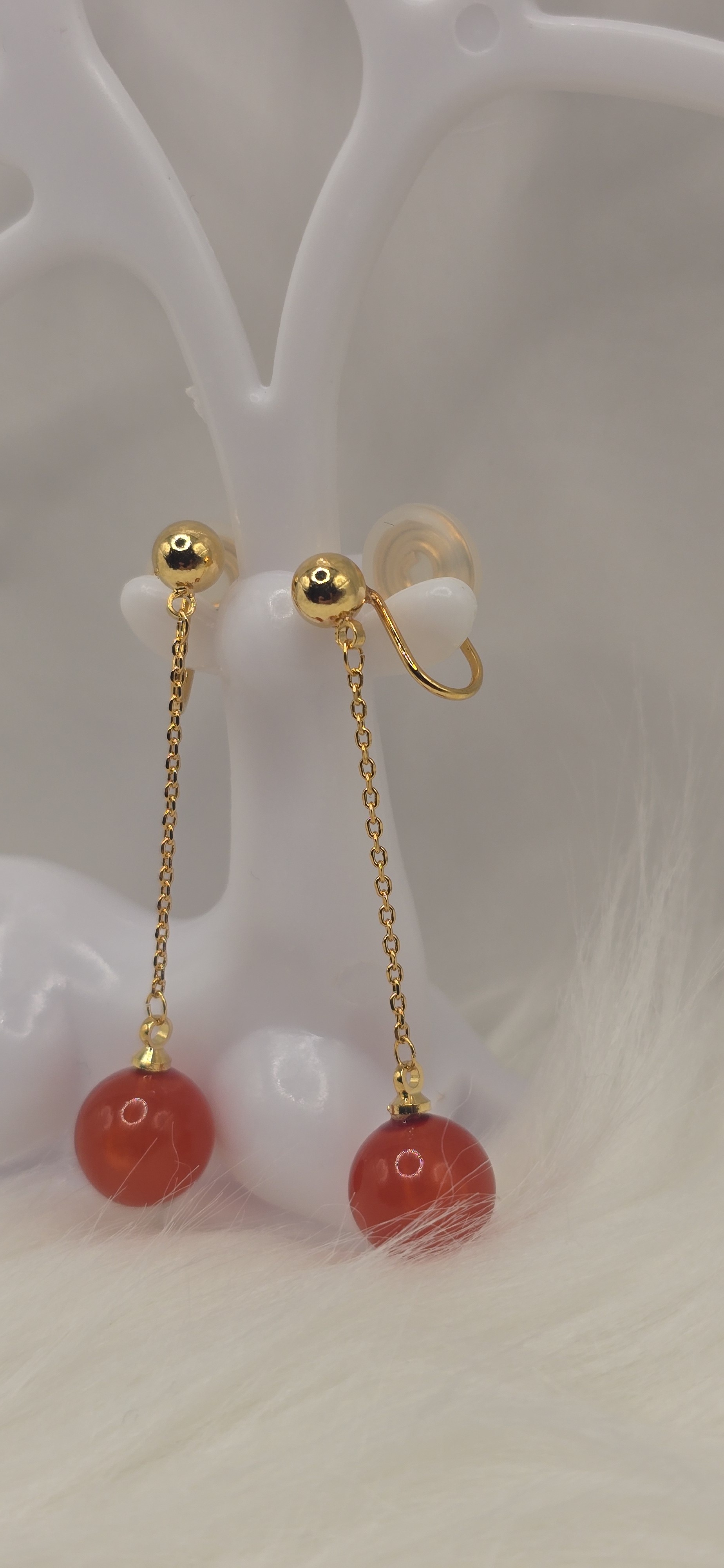 Boucles d’oreilles à clips en laiton doré, ornées d’une perle rouge façon cerise.