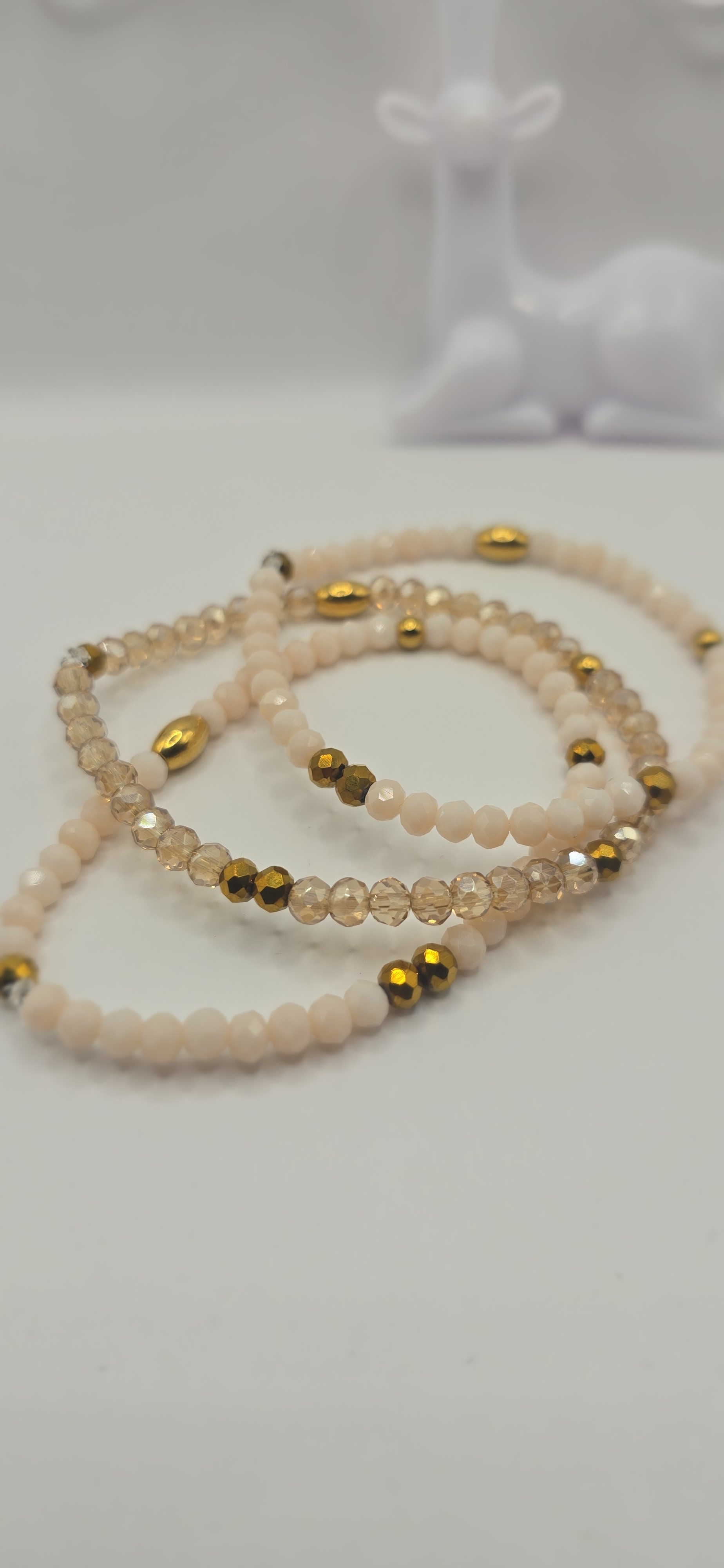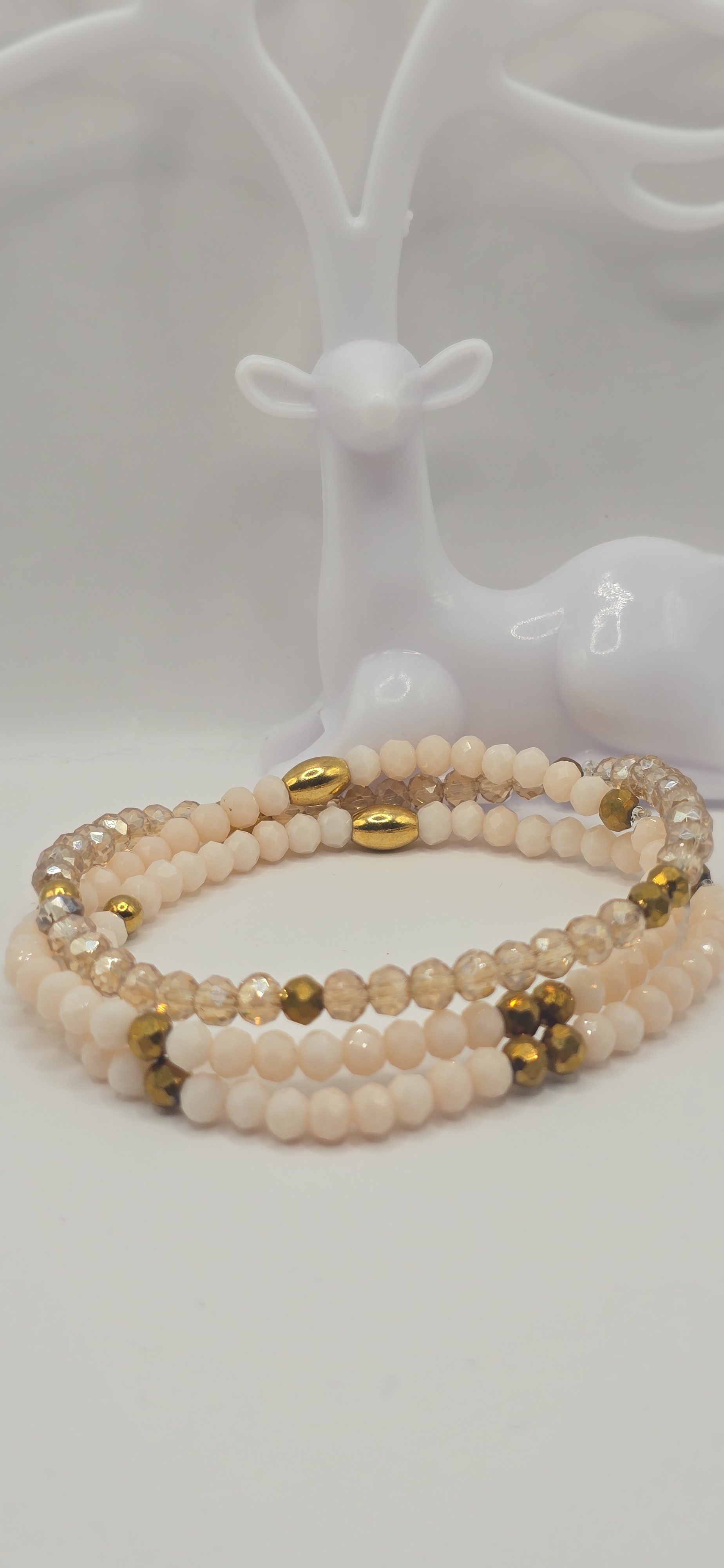 Ensemble de trois bracelets : deux en perles nude/rose pâle taillées à facettes et un central en cristaux couleur champagne/doré clair brillant. L'ensemble est magnifié par des accents dorés chics et mats (perles intercalaires et connecteur ovale). Un bijou lumineux, élégant et facile à assortir.