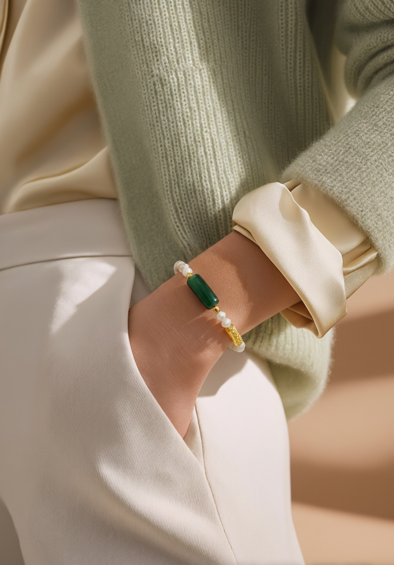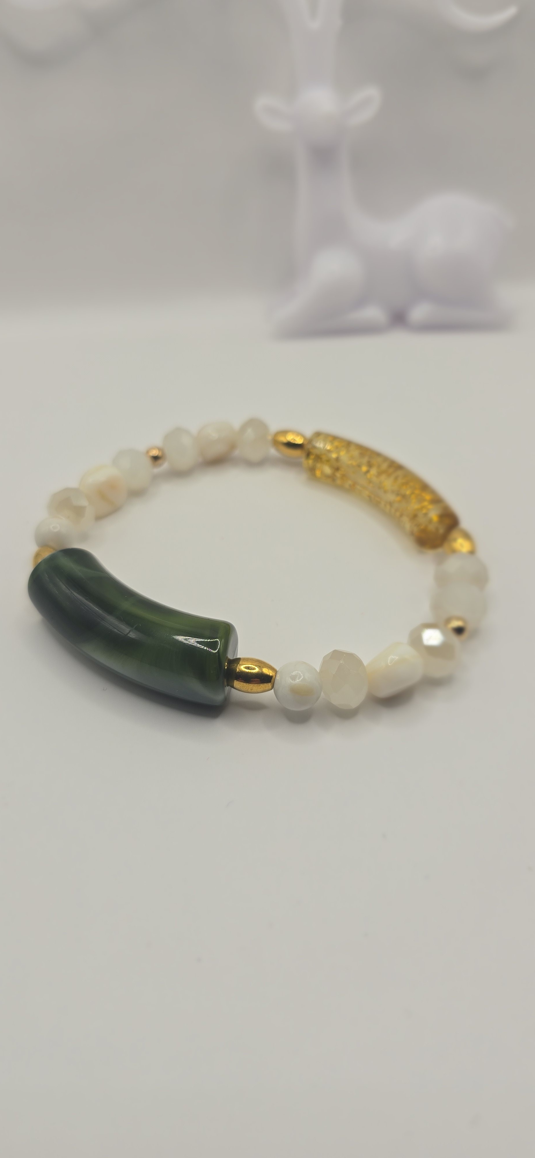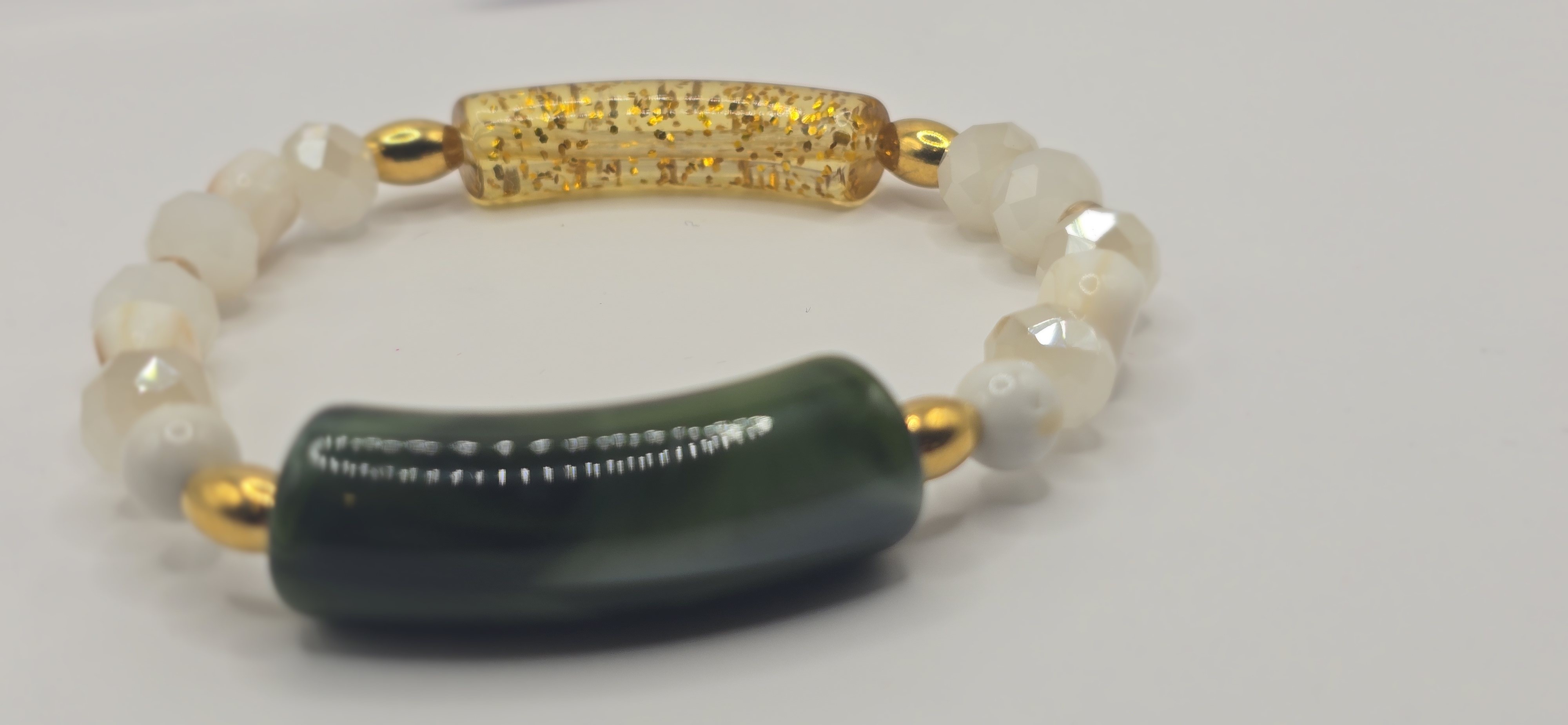 âDesign Unique : Un mélange audacieux de tube vert poli, de résine dorée pailletée, et de perles de Nacre ou Pierre de Lune.