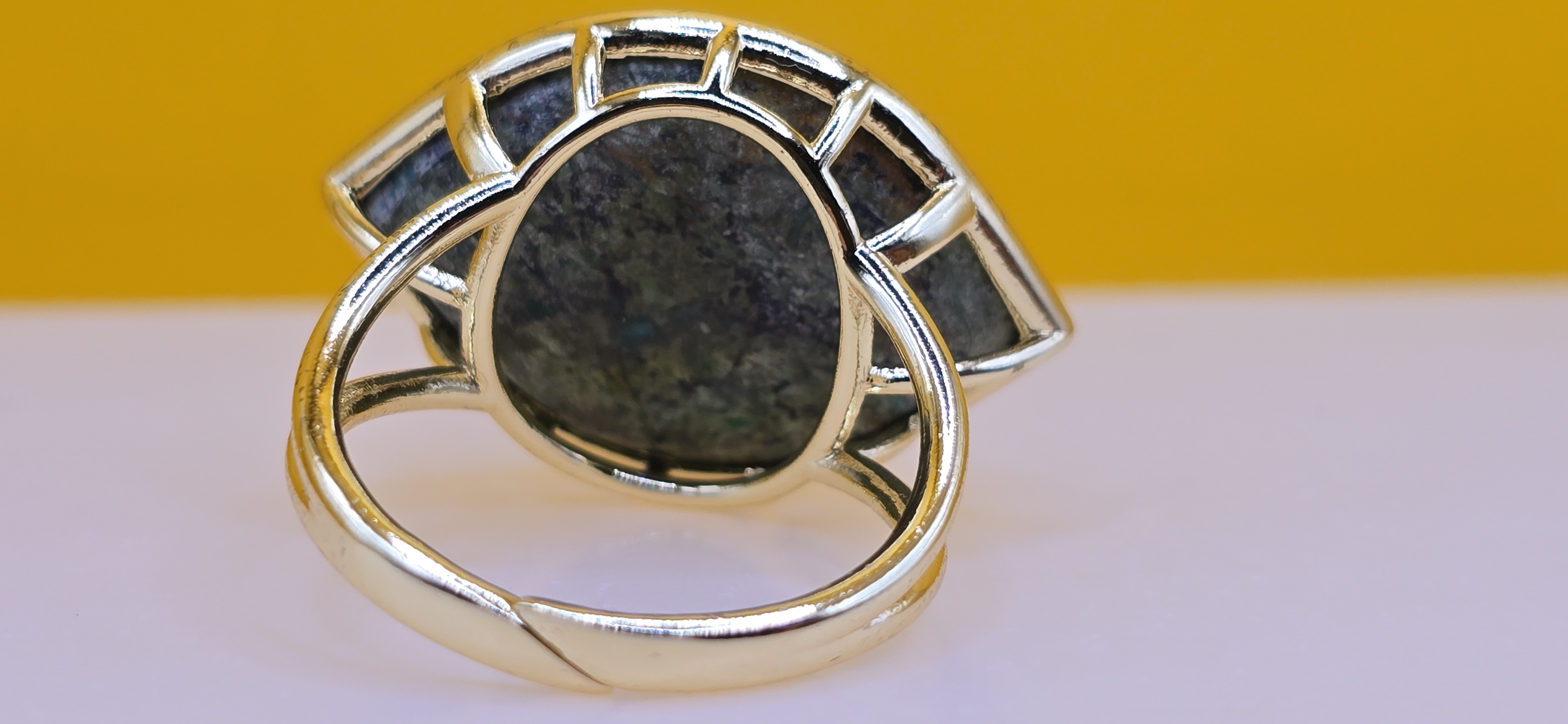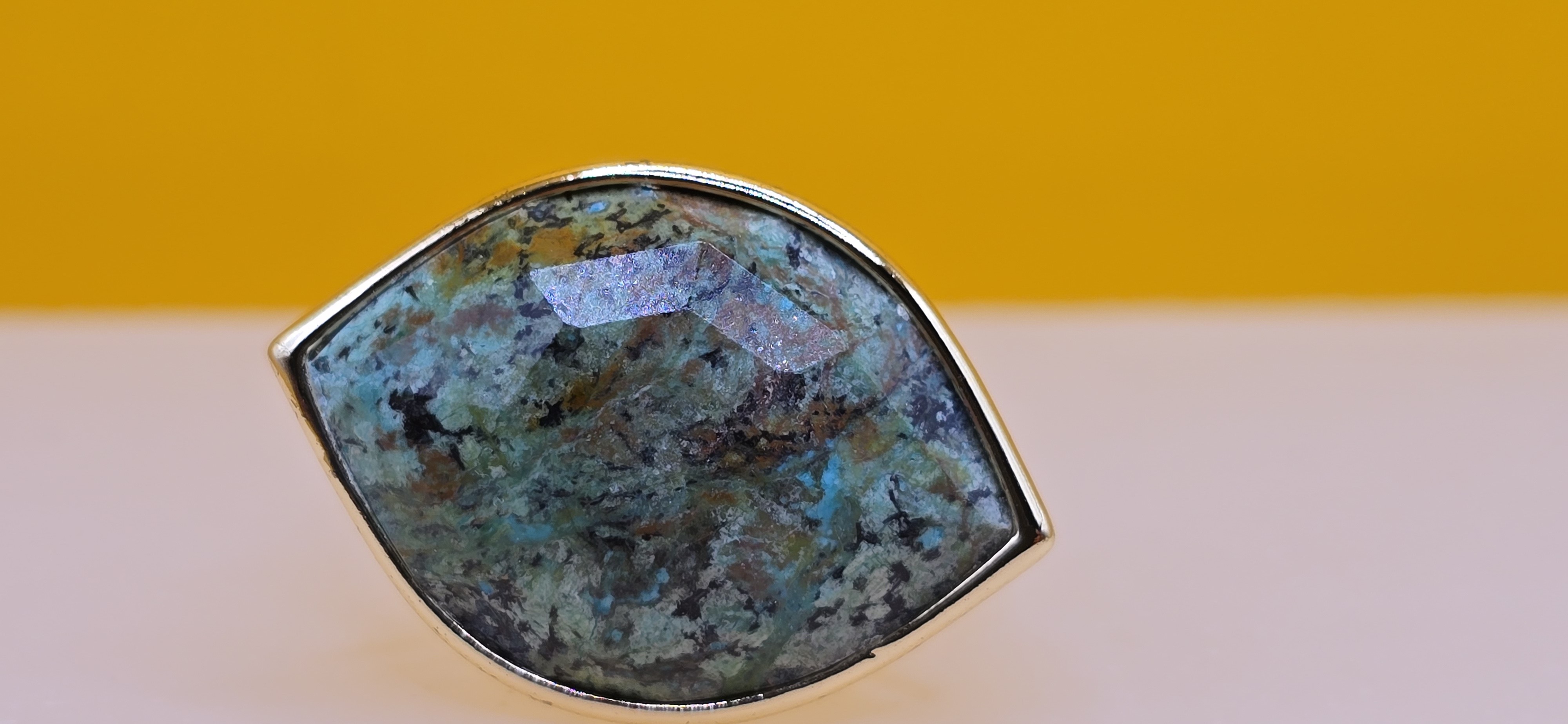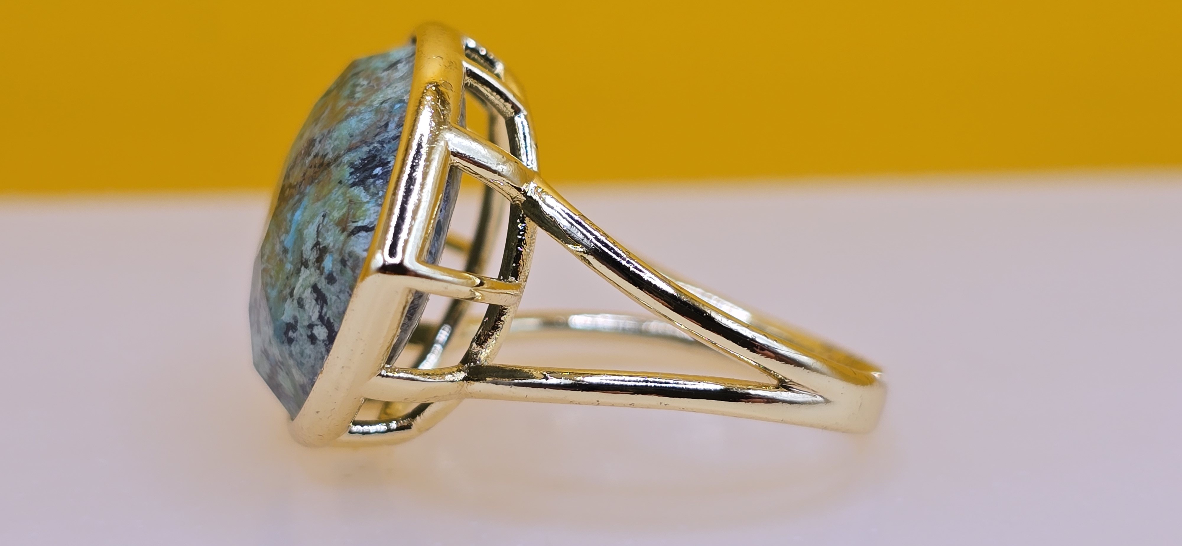 Laissez-vous transporter par la Bague Aëla, une pièce maîtresse en laiton doré arborant une splendide Turquoise Africaine (Jaspe) naturelle. Sa forme audacieuse et ses nuances de bleu et vert en font un bijou qui raconte une histoire d'aventure et de liberté.