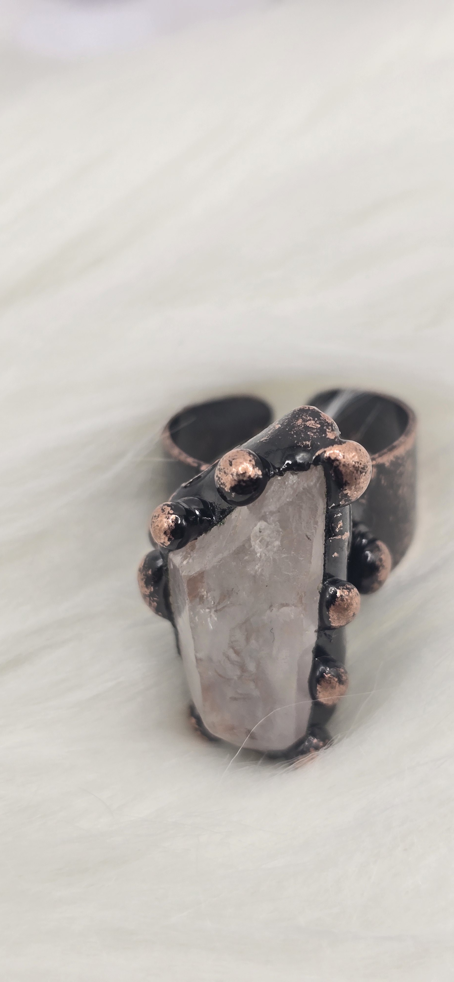 La Bague Sélène incarne l'élégance sombre avec son style gothique-mystique. Chaque bague est une pièce unique, mettant en vedette la beauté brute et non polie du quartz.