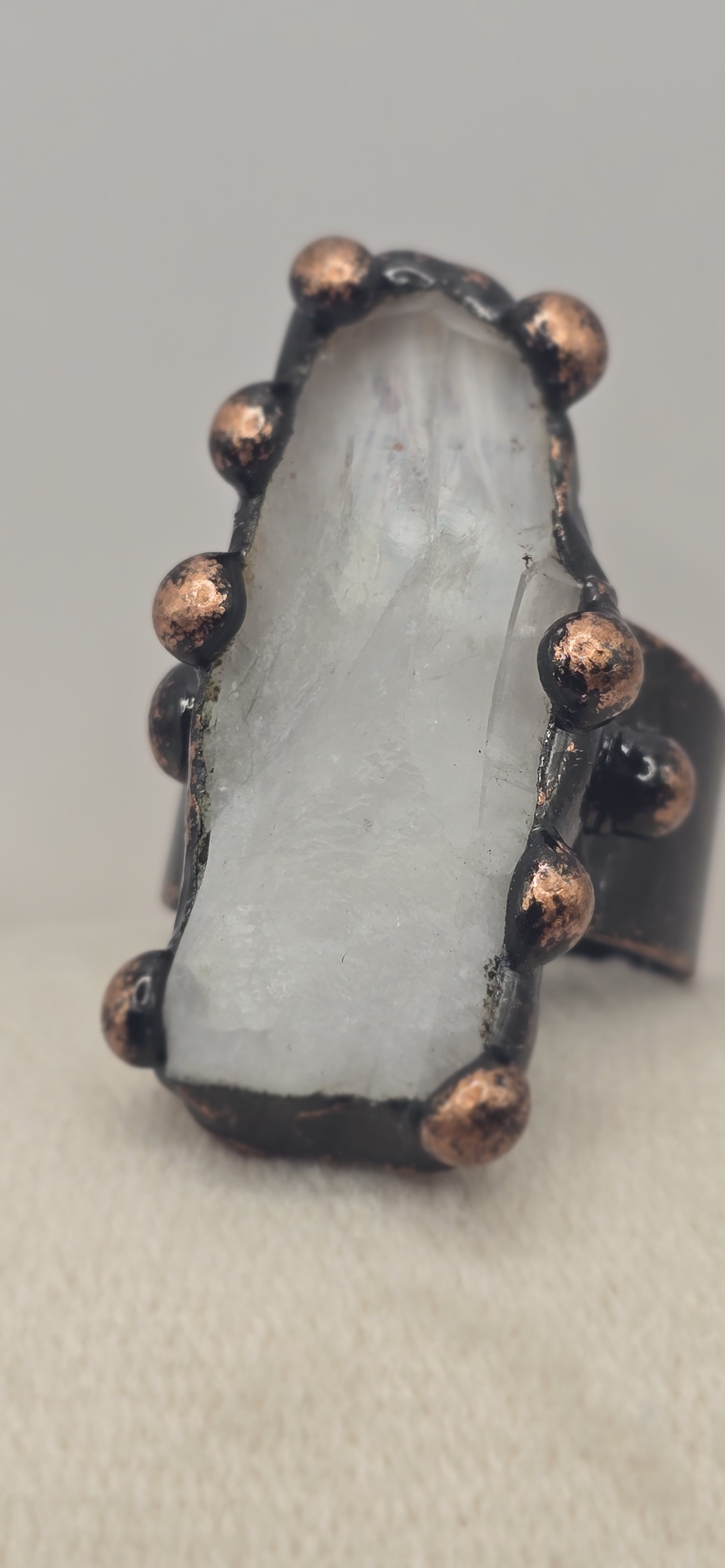 Style Mystique : Design Gothique-Brut soulignant l'éclat unique du quartz brut et la chaleur du cuivre vieilli.