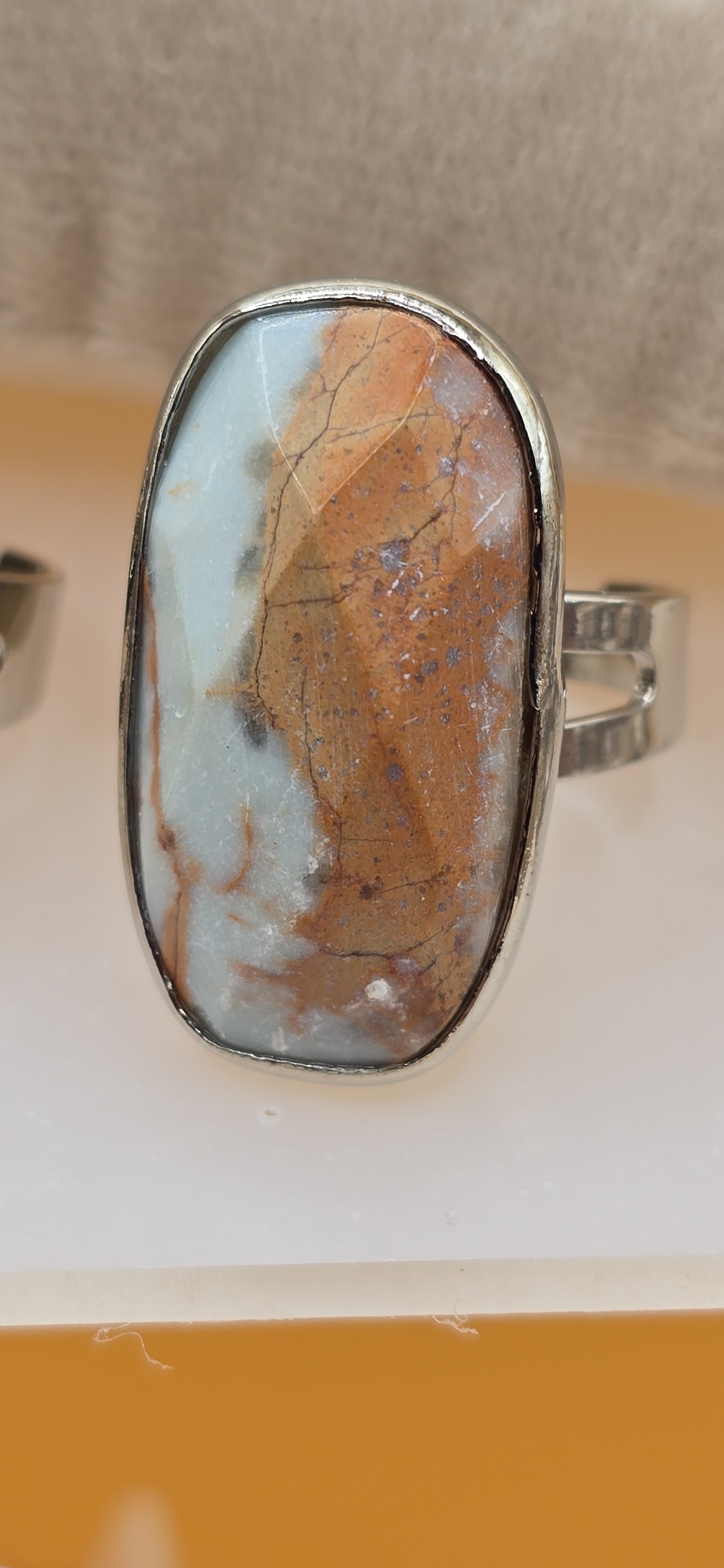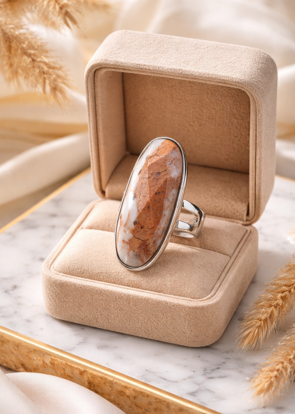La Bague Shylla est une pièce de caractère, mettant en lumière le motif unique du Jaspe Aqua Terra dans un style élégant et épuré.