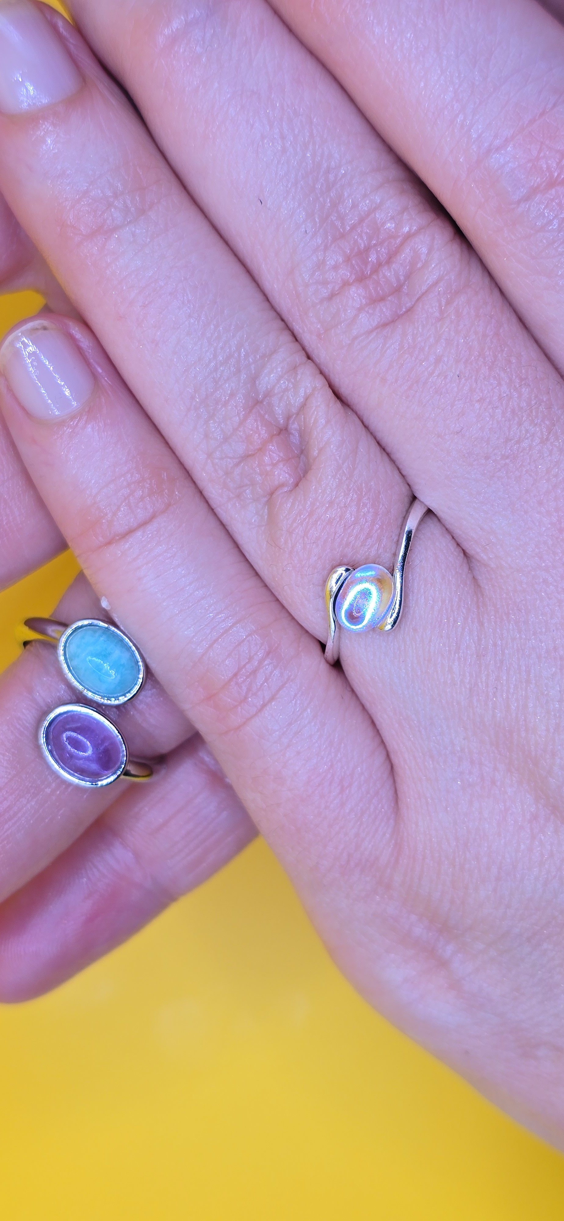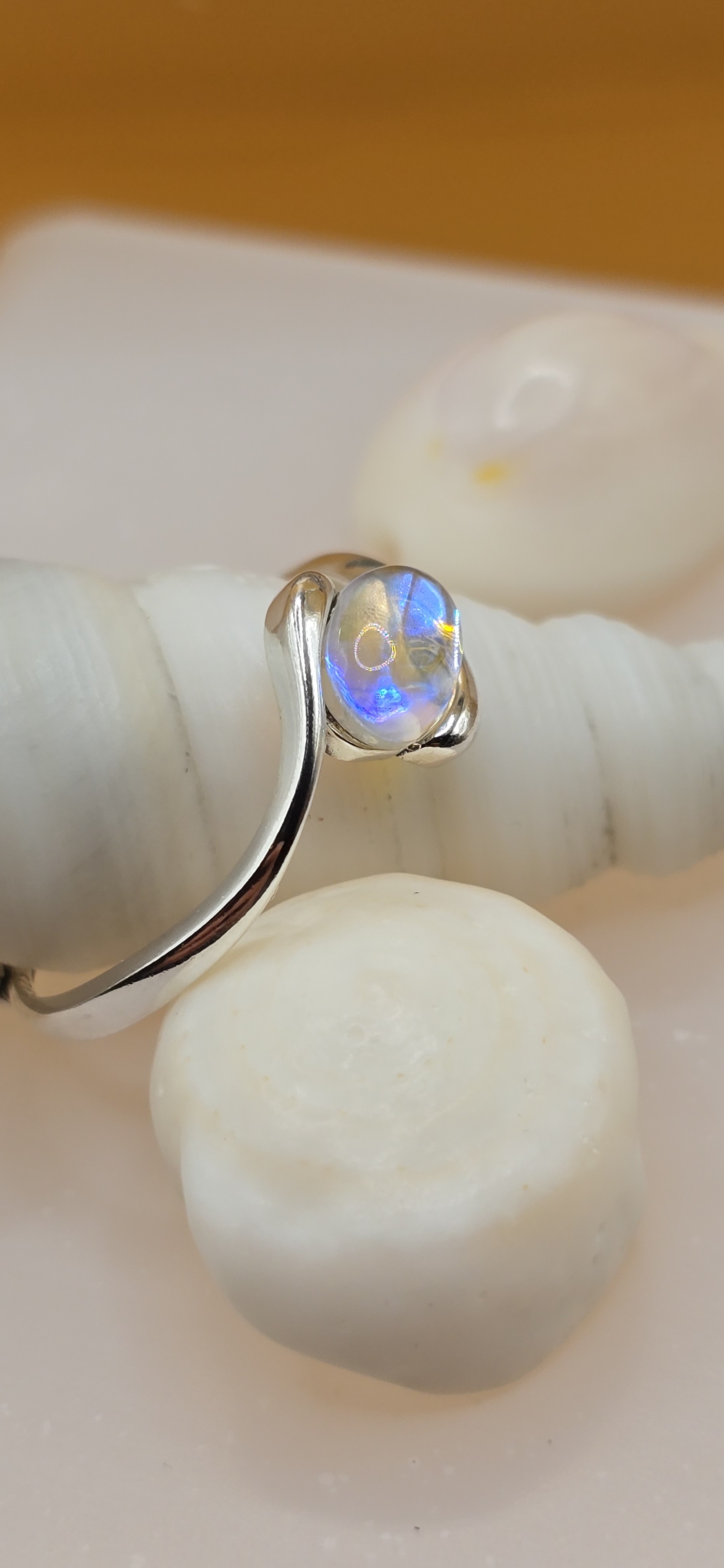 Délicatesse et mystère se rencontrent avec la bague "Opaline". Elle arbore une véritable Pierre de Lune naturelle (cabochon ovale) dont les reflets irisés rappellent l'opale.