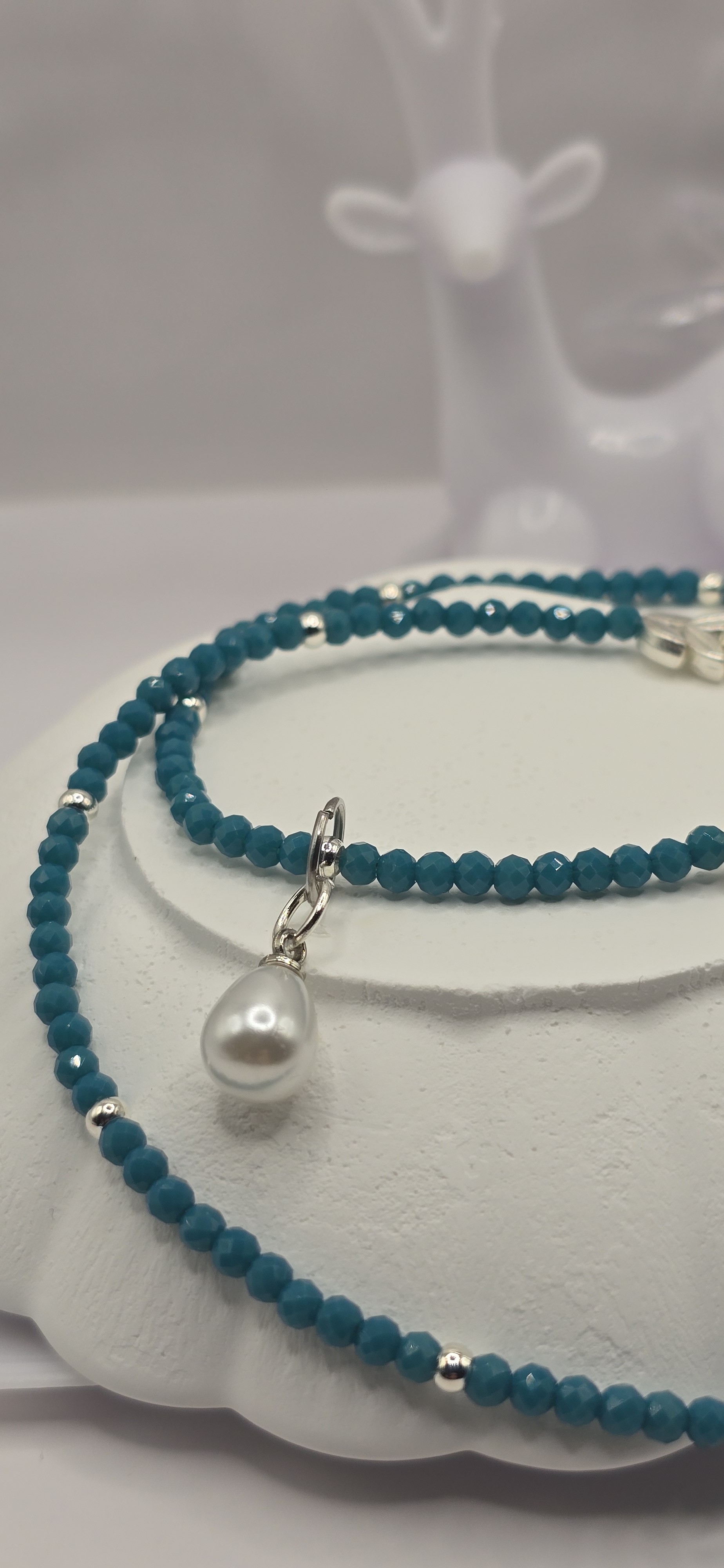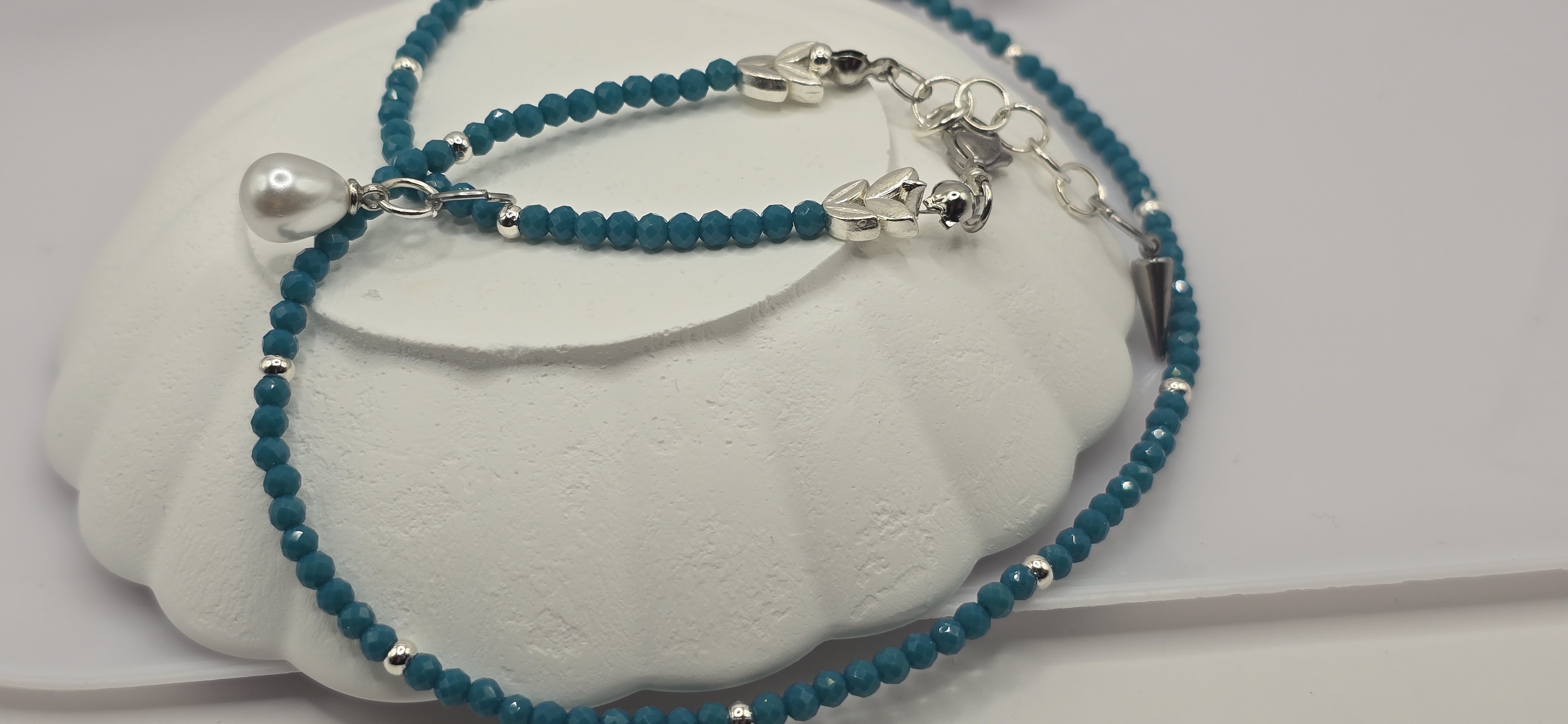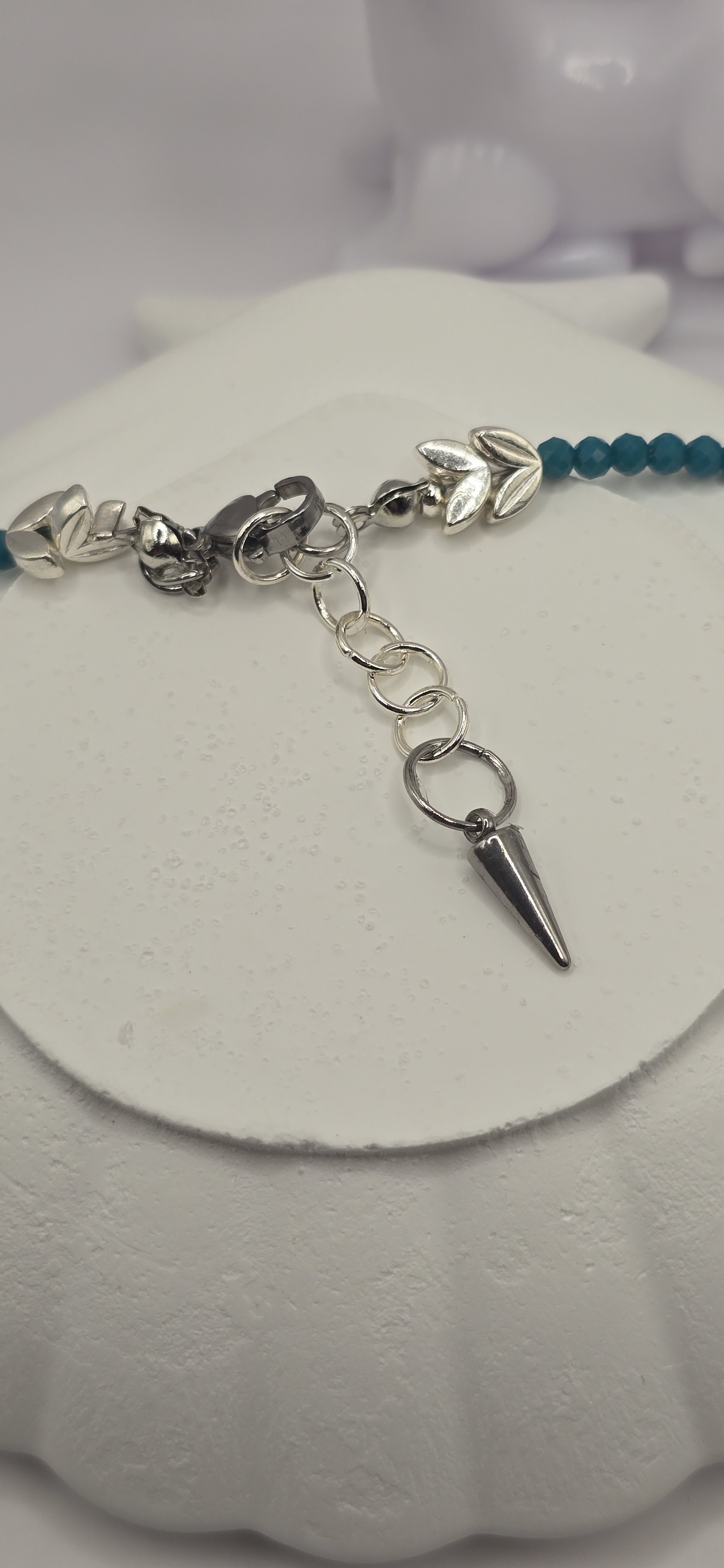 Détails : Effet Fil Délicat, perles facettées, breloque Pointe Argentée.