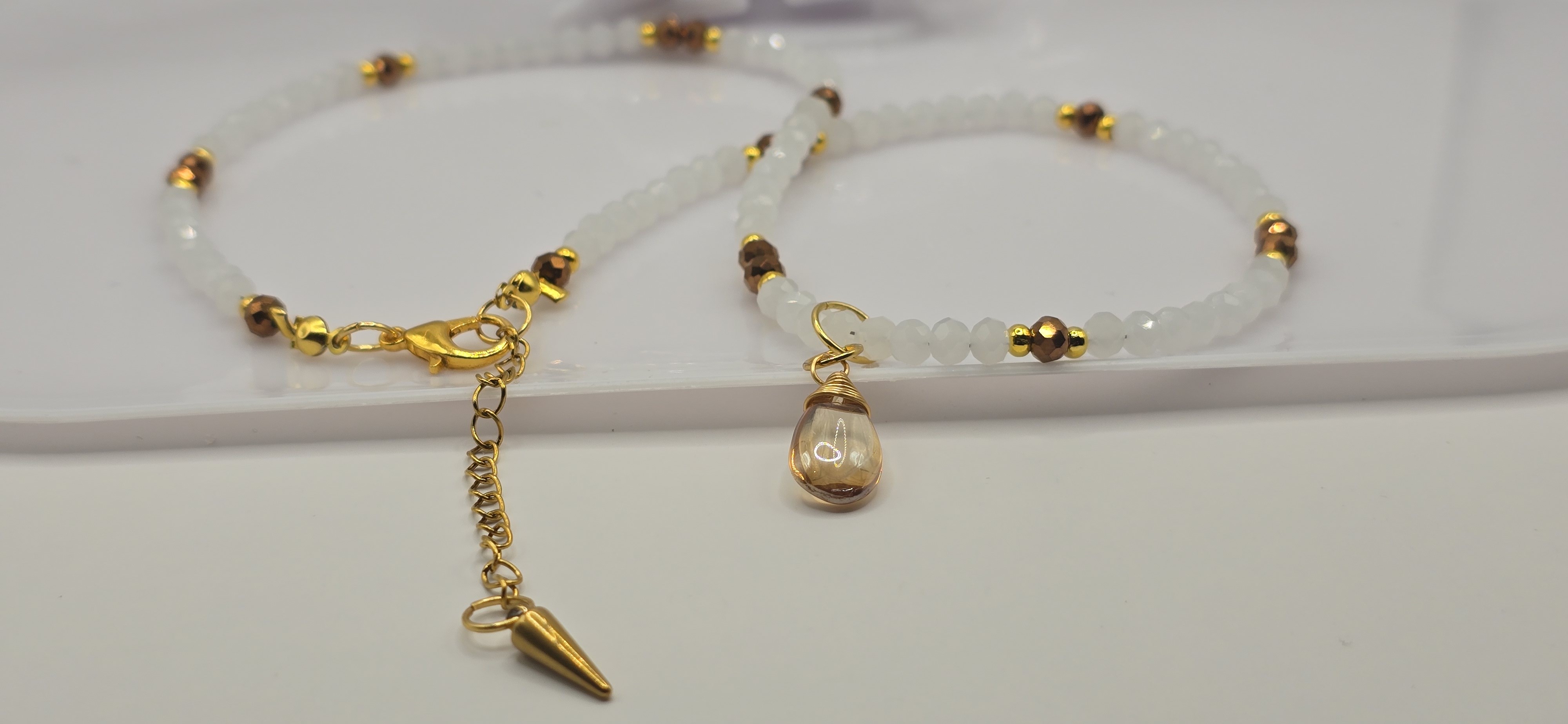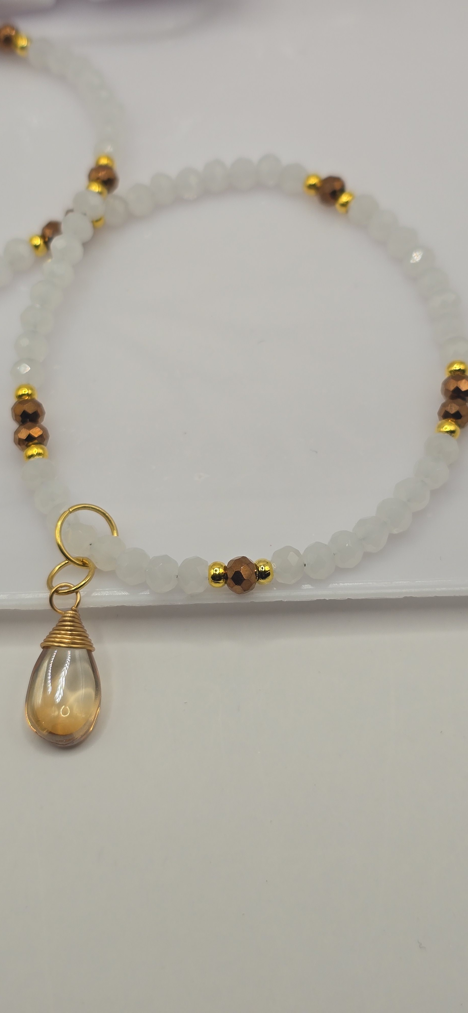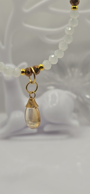 Montage : Fines perles blanches et marron/doré, Pendentif goutte translucide marron, Éléments, chaînes et fermoir dorés.