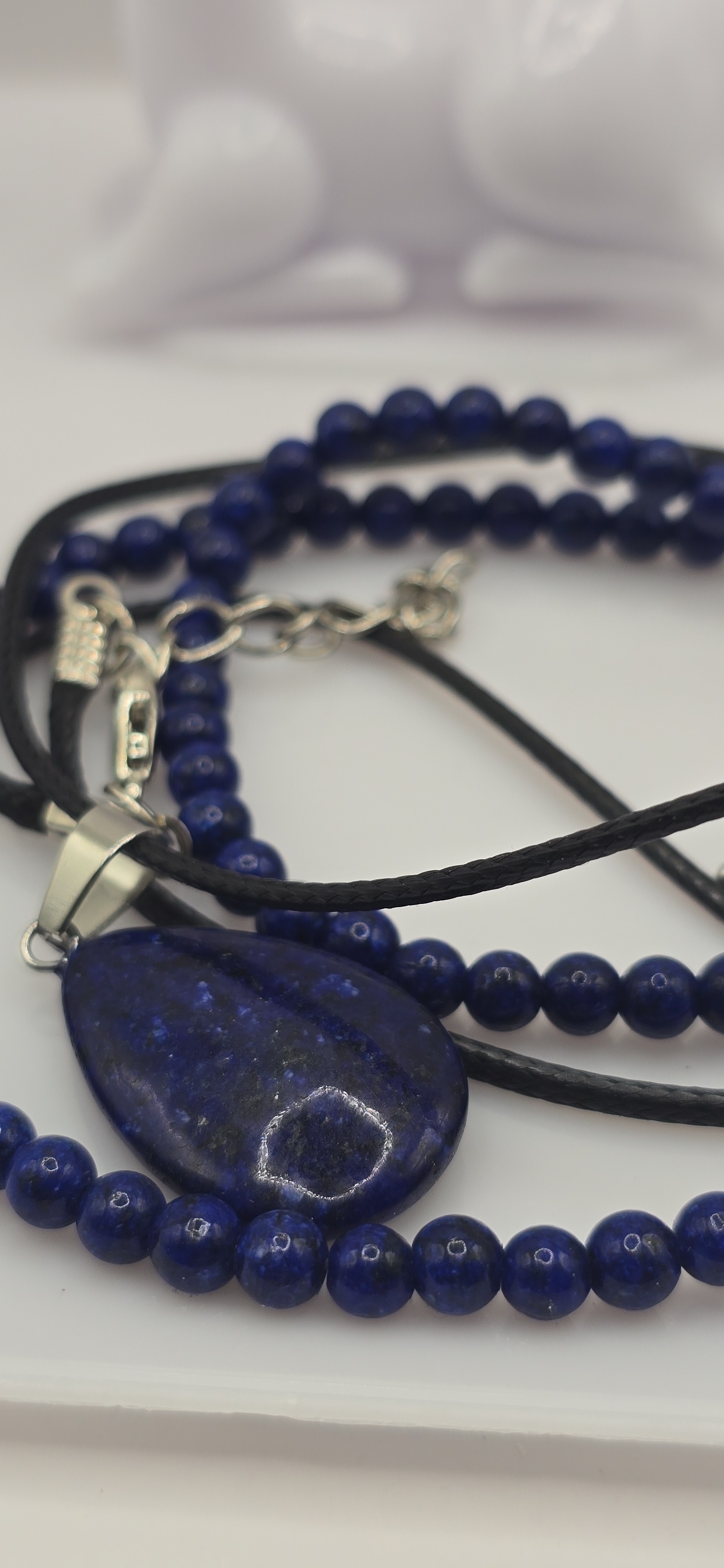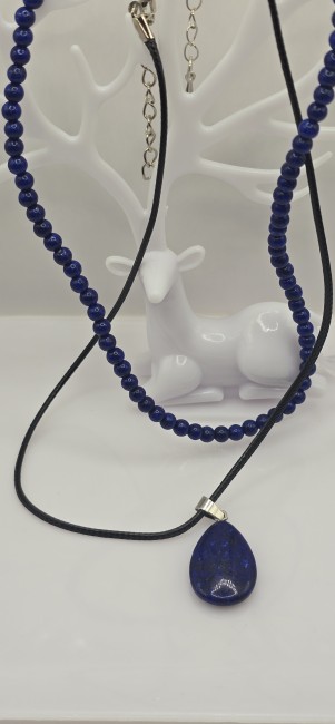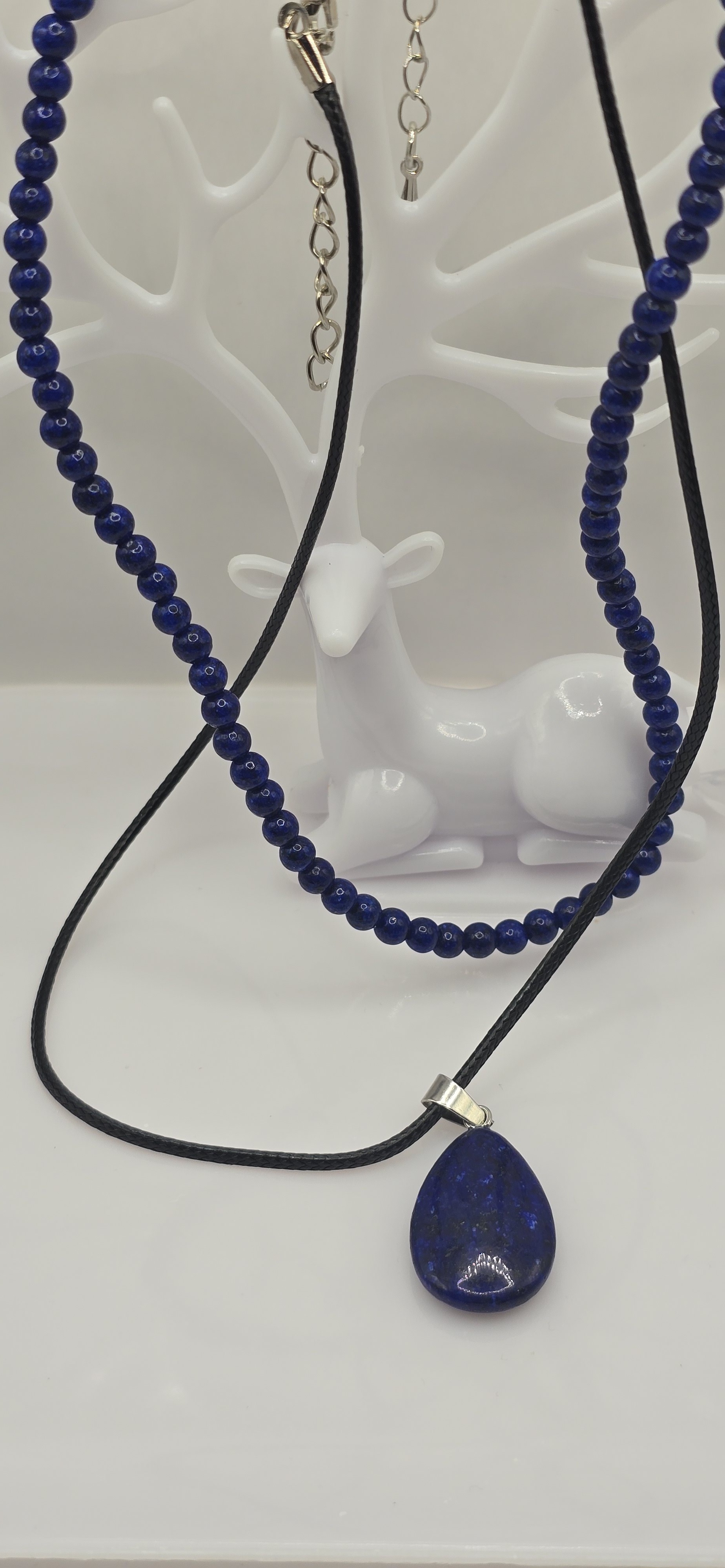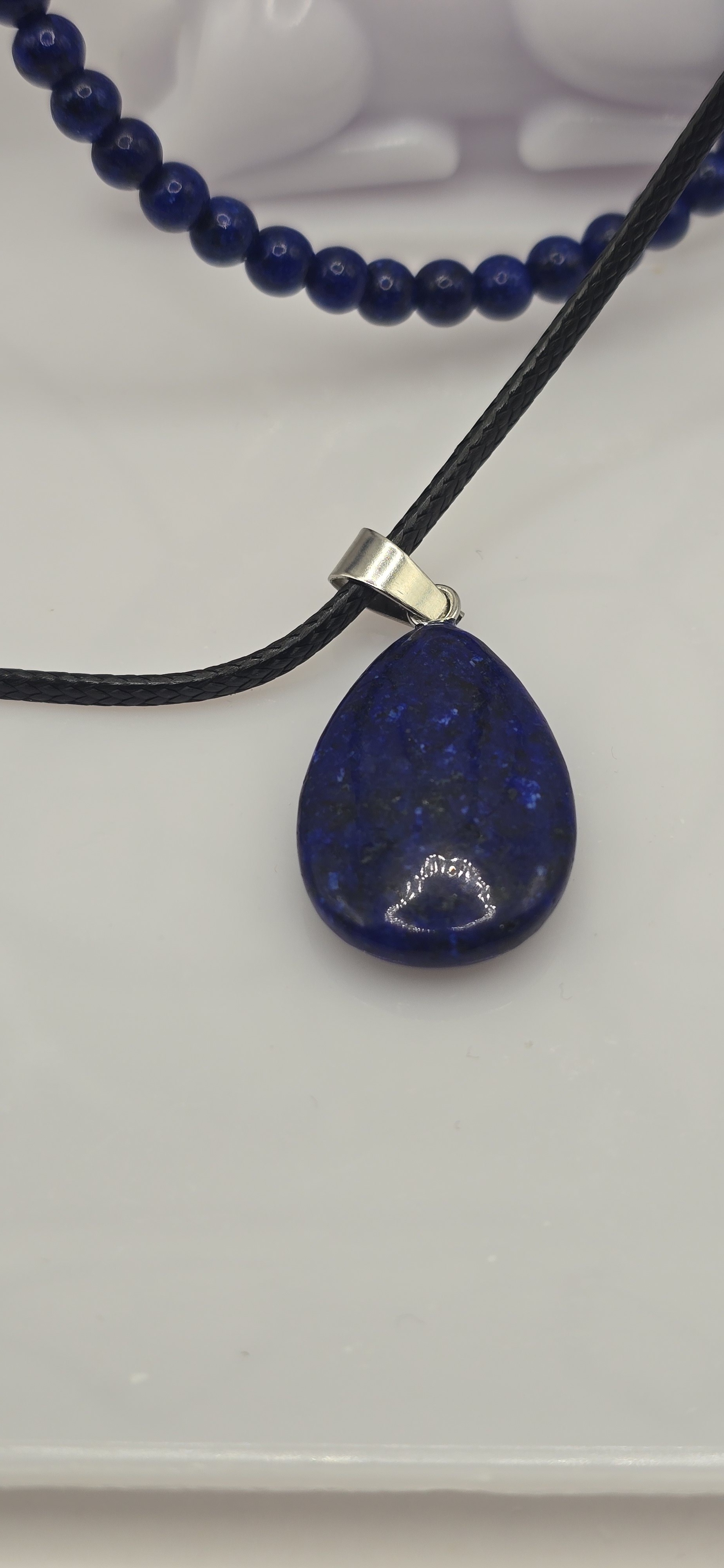 âLe second est un pendentif goutte en Lapis-Lazuli monté sur un cordon noir souple.