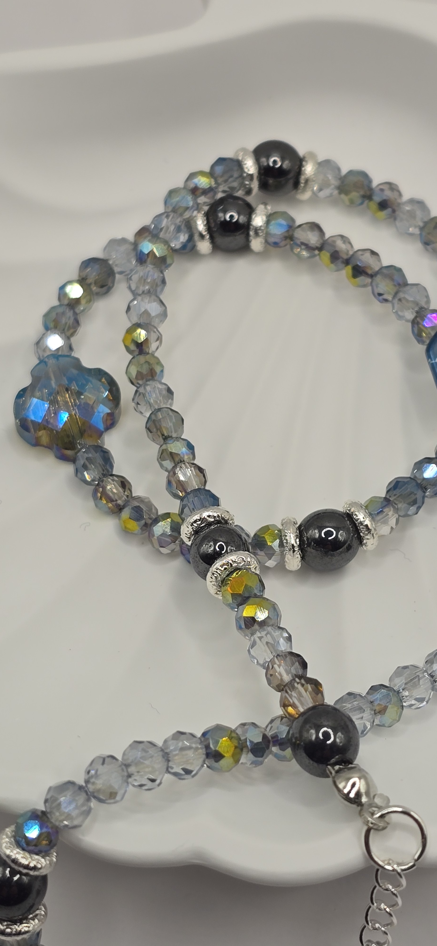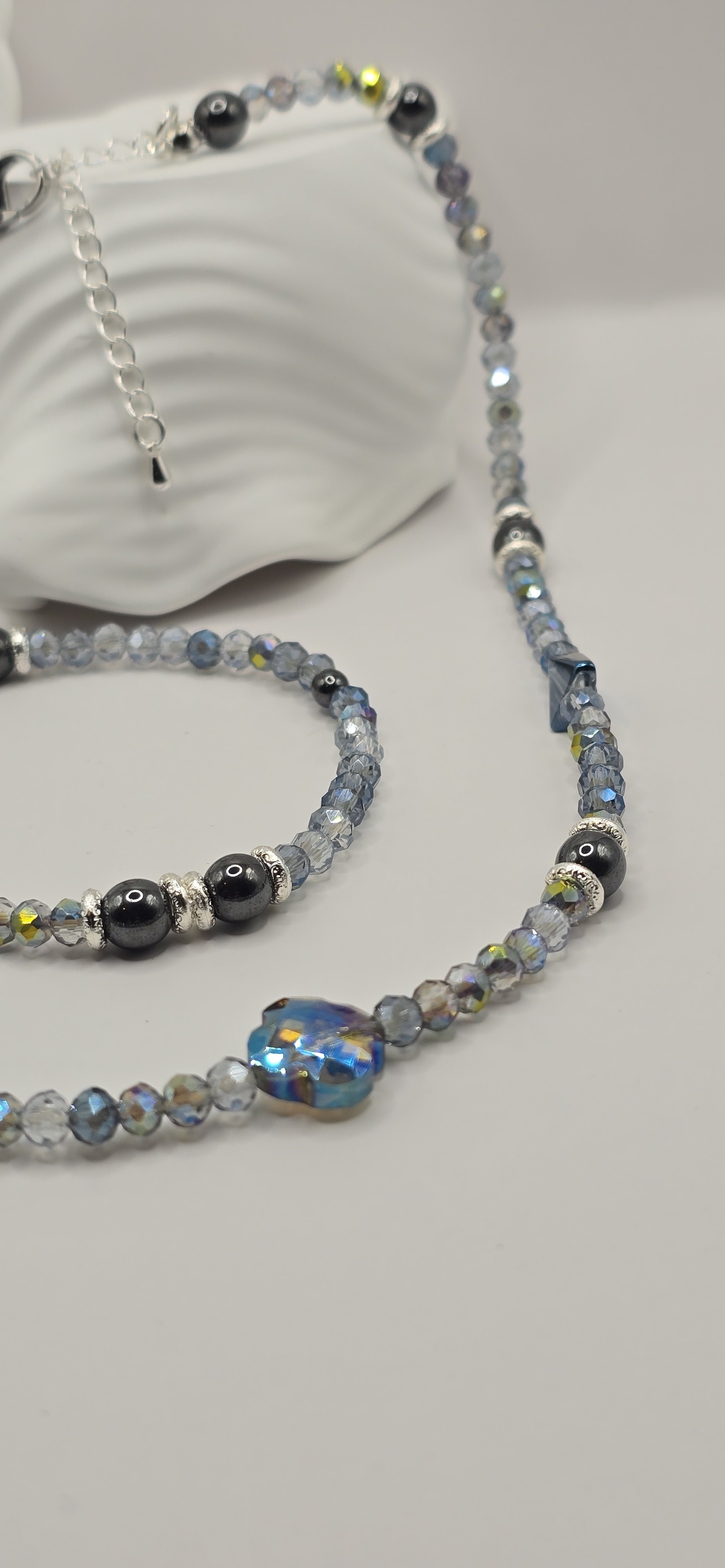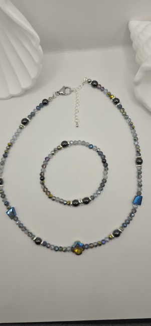 Ajoutez une touche de lumière à votre style avec cet ensemble artisanal aux reflets fascinants. Un mélange élégant de cristaux facettés et d'hématite, sublimé par sa perle centrale irisante, parfait pour briller en toute occasion.
