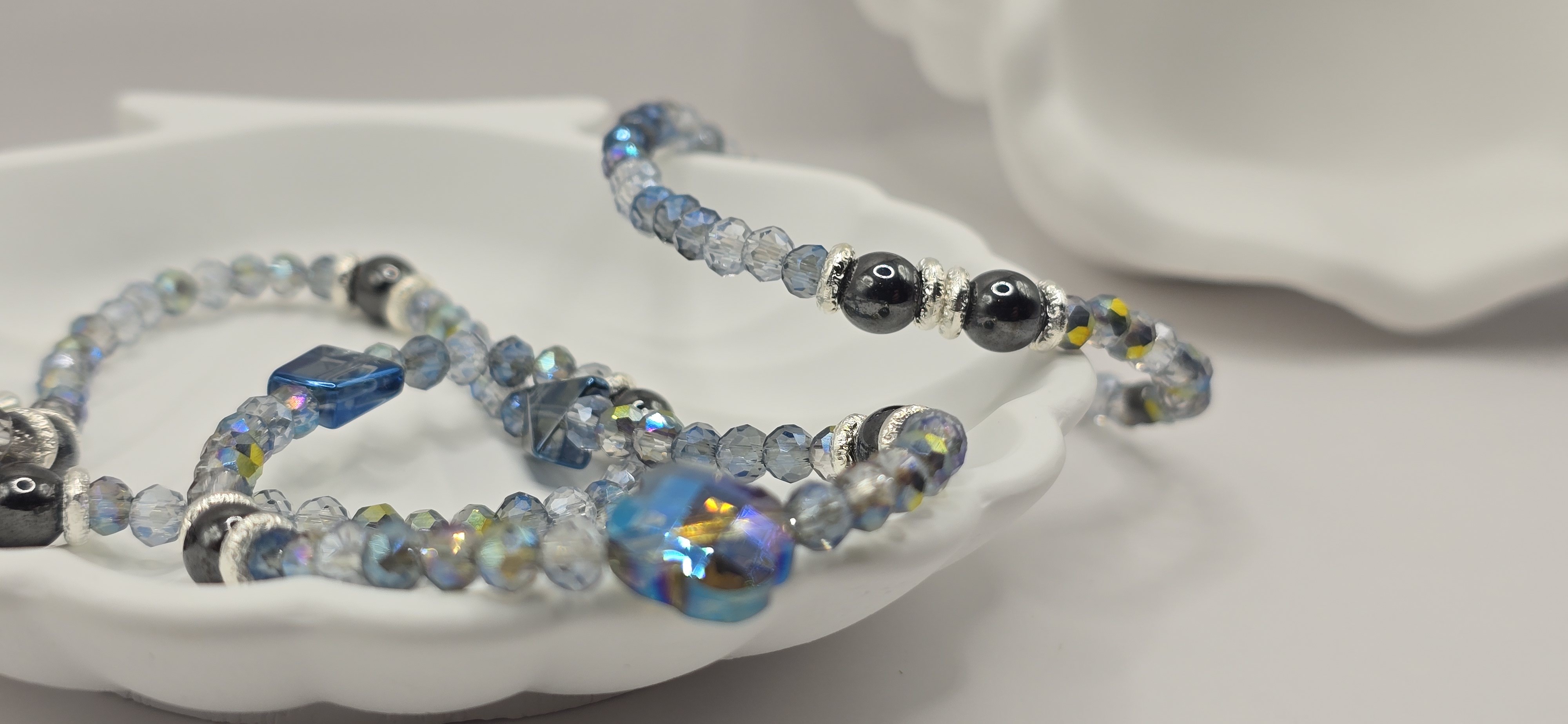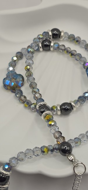 Matériaux : Cristaux bleus irisés et perles d'hématite.