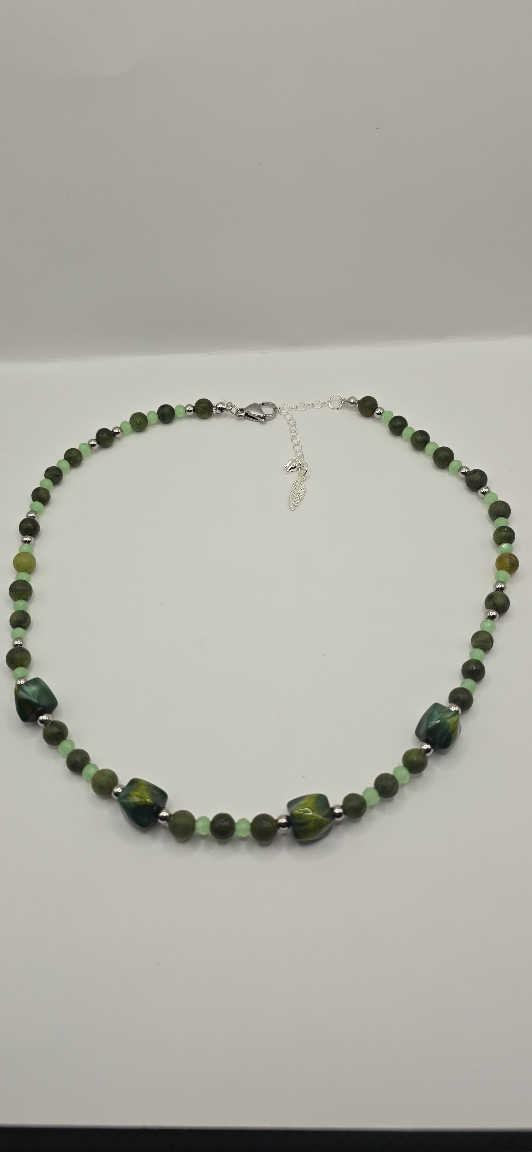 Célébrez la sérénité avec ce collier artisanal mettant à l'honneur le Jade véritable. Cette création unique joue sur les contrastes entre la douceur des perles de Jade rondes et l'aspect moderne des perles géométriques aux reflets forêt.