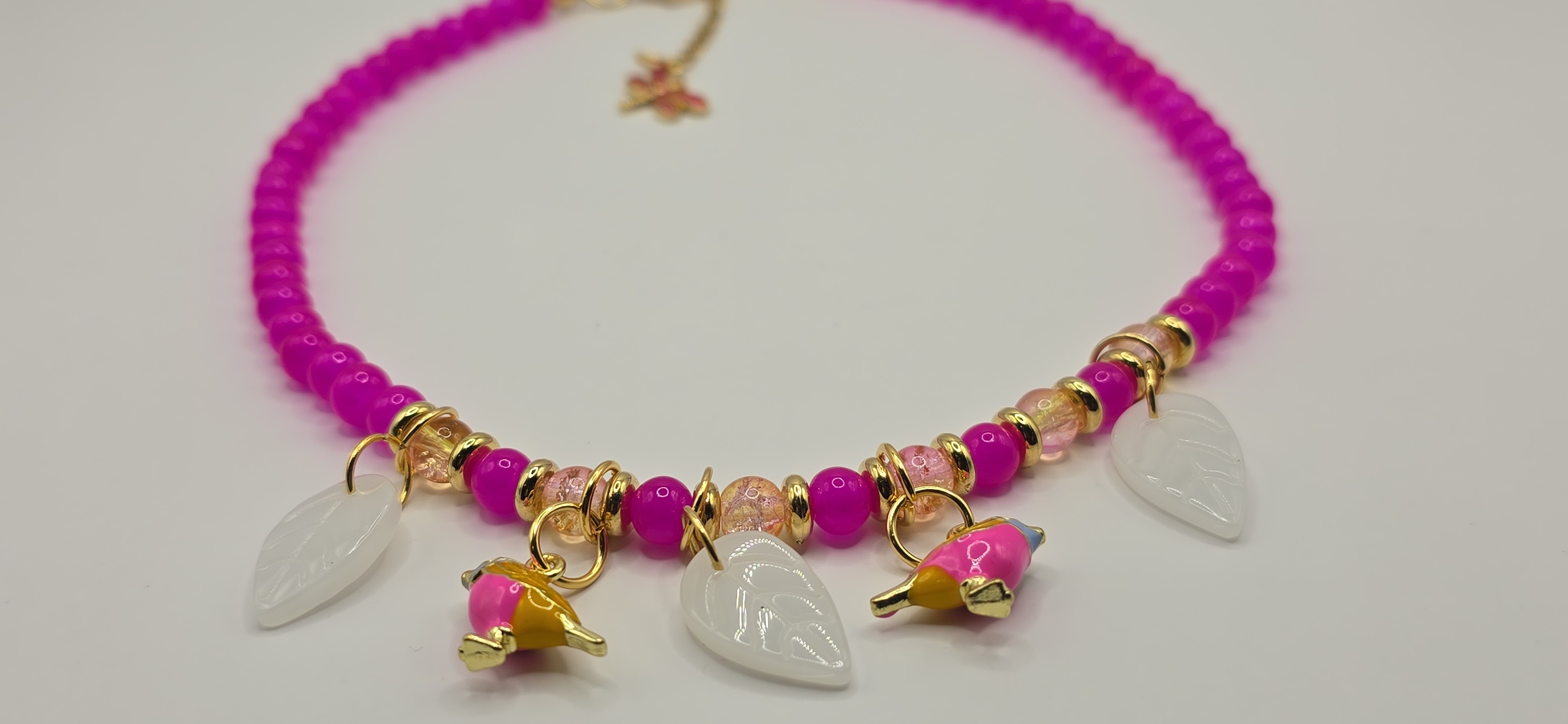 Évadez-vous avec cet ensemble "pep's" aux couleurs tropicales. Un mélange vibrant de perles fuchsia et de charms exotiques pour un look solaire et audacieux que vous seule porterez.