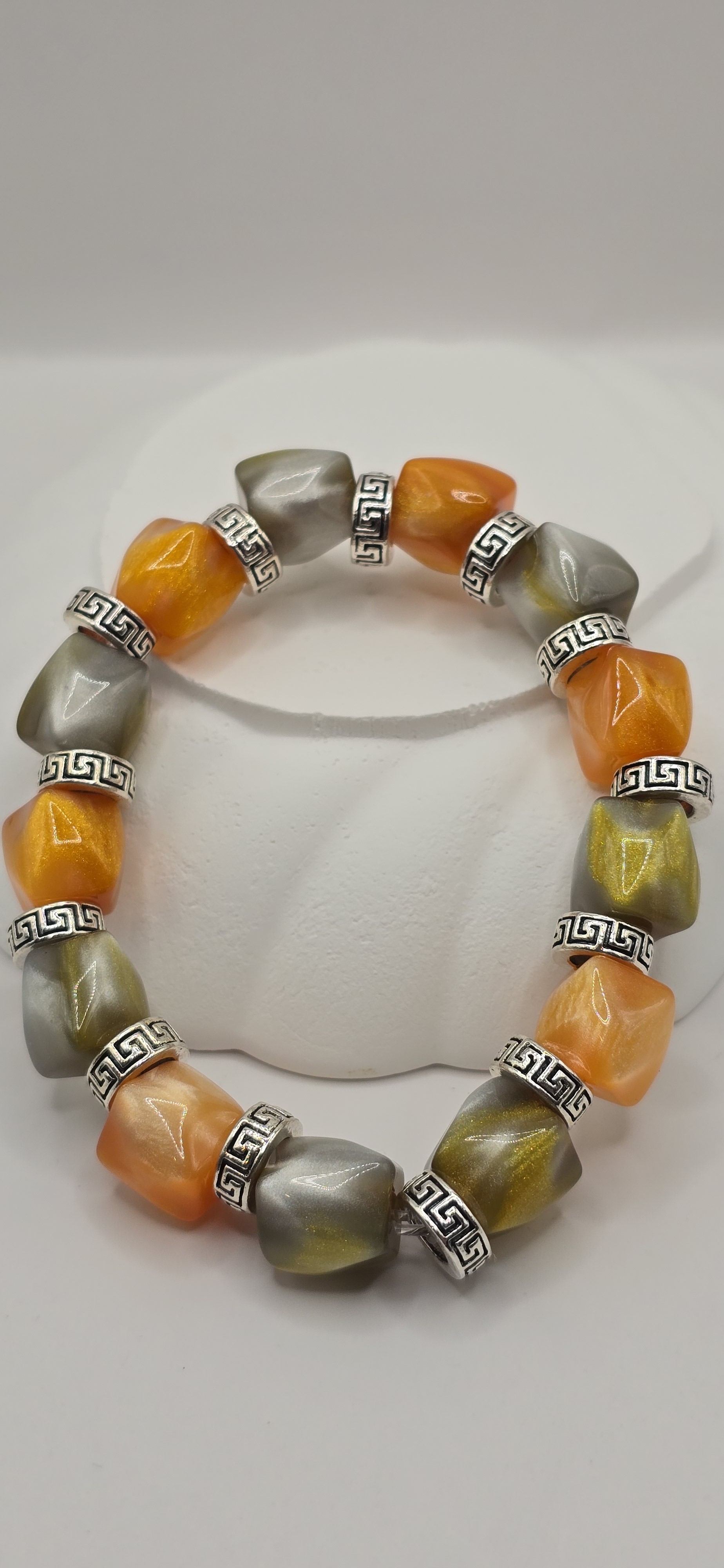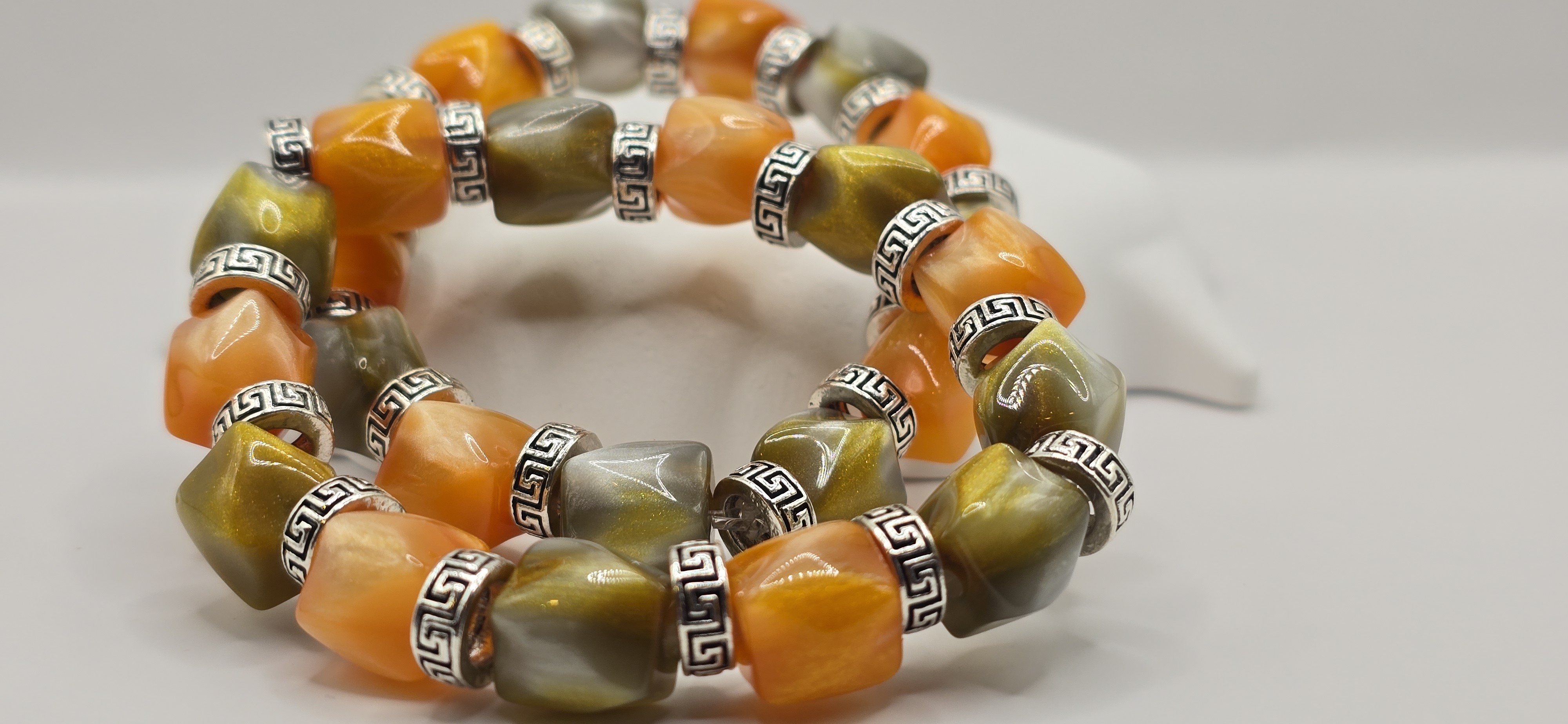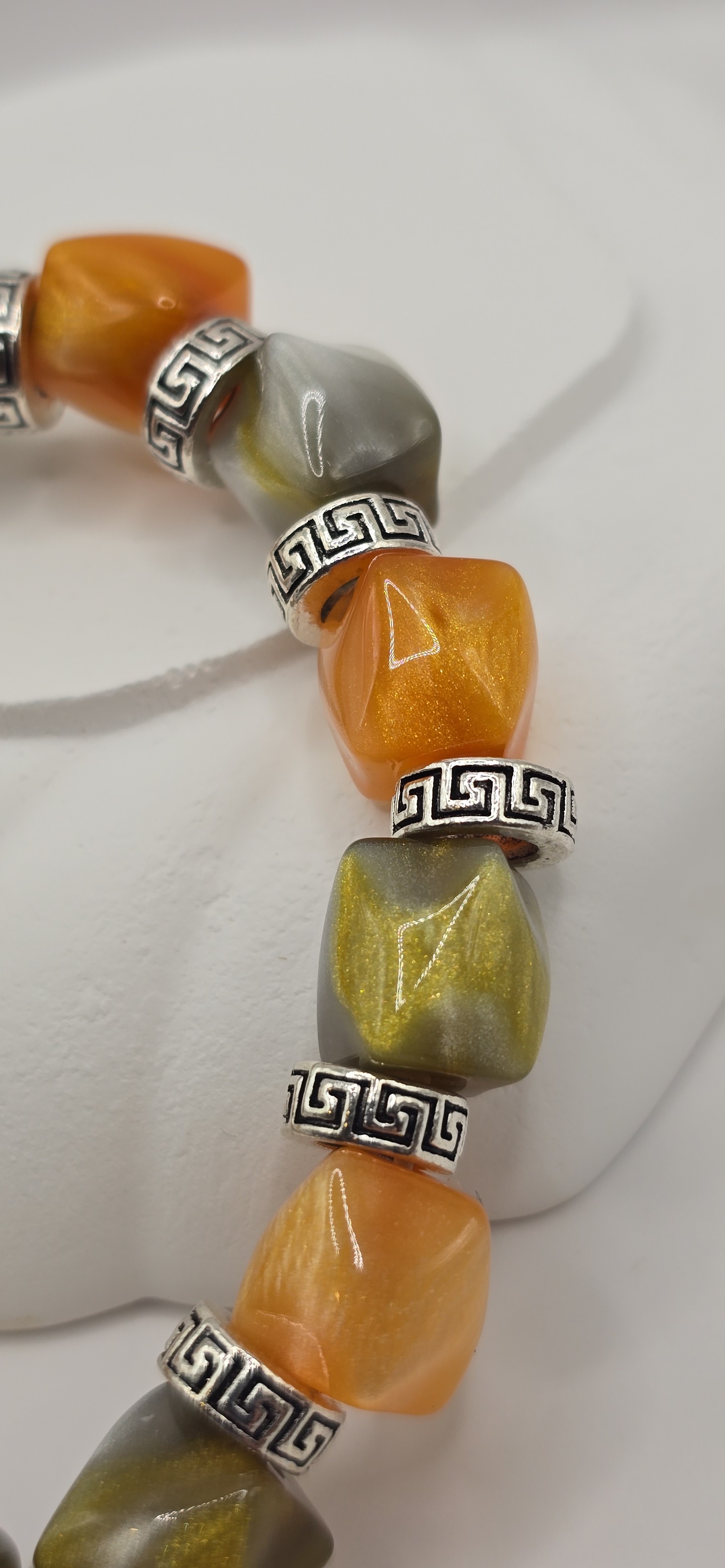 Un bijou solaire et protecteur alliant l'orange vibrant à des perles grises nacrées. Les anneaux ciselés portent des mantras sacrés pour un style spirituel et "pep's".