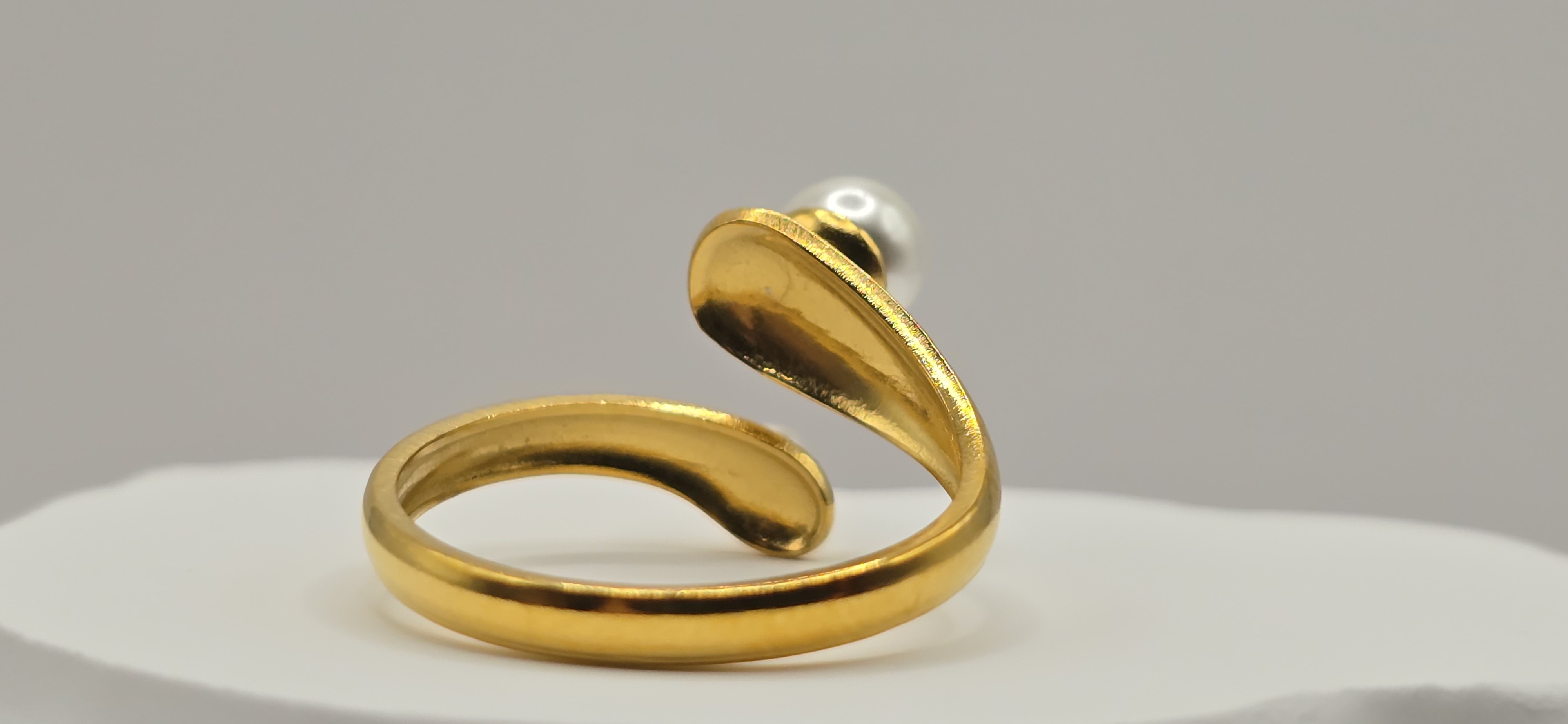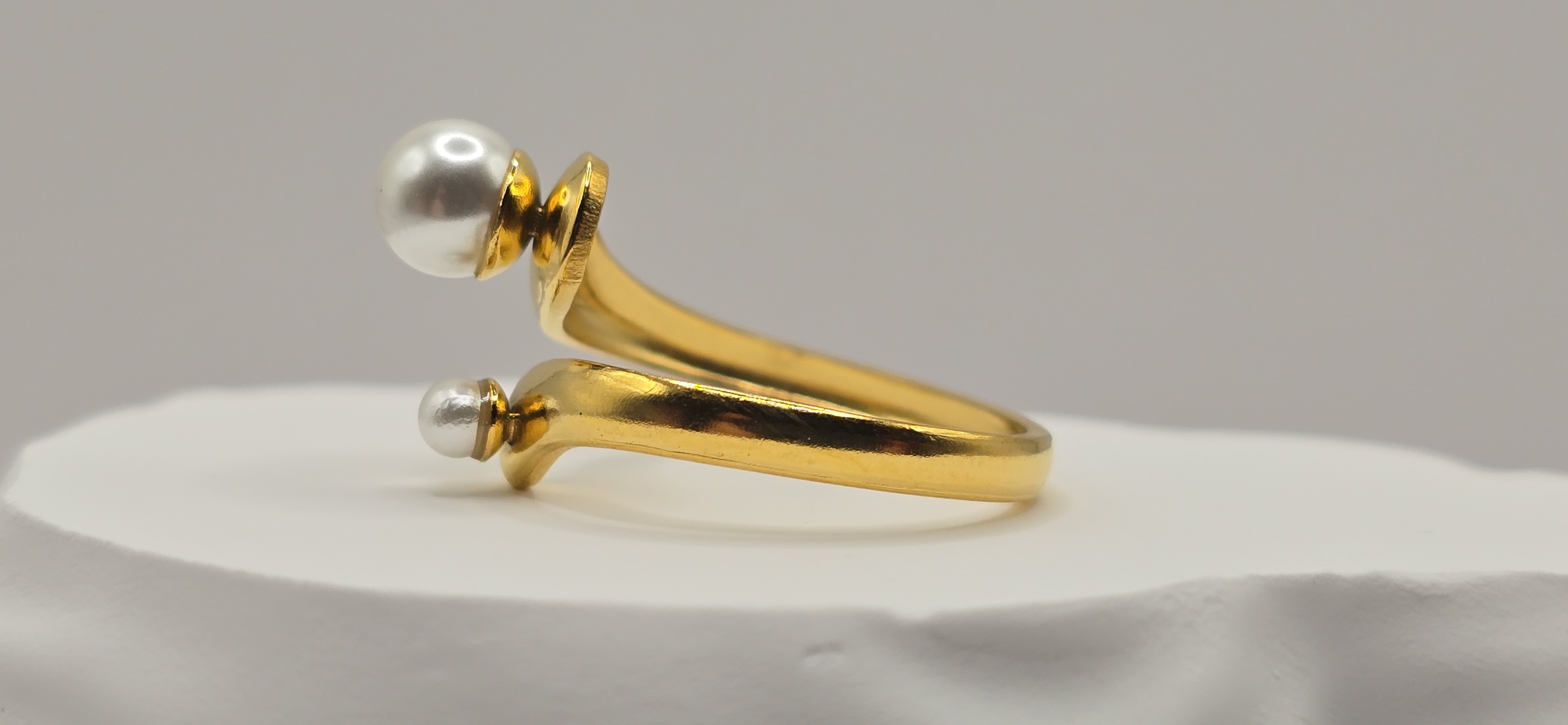 Sublimez vos mains avec la bague Riviera. Ce bijou allie la brillance de l’or à la finesse de deux perles nacrées asymétriques. Son design ouvert et ajustable garantit un confort parfait pour tous les doigts.