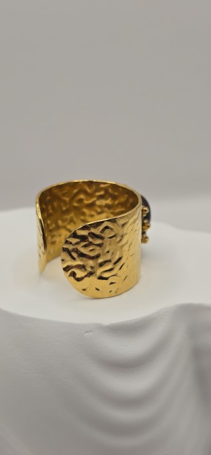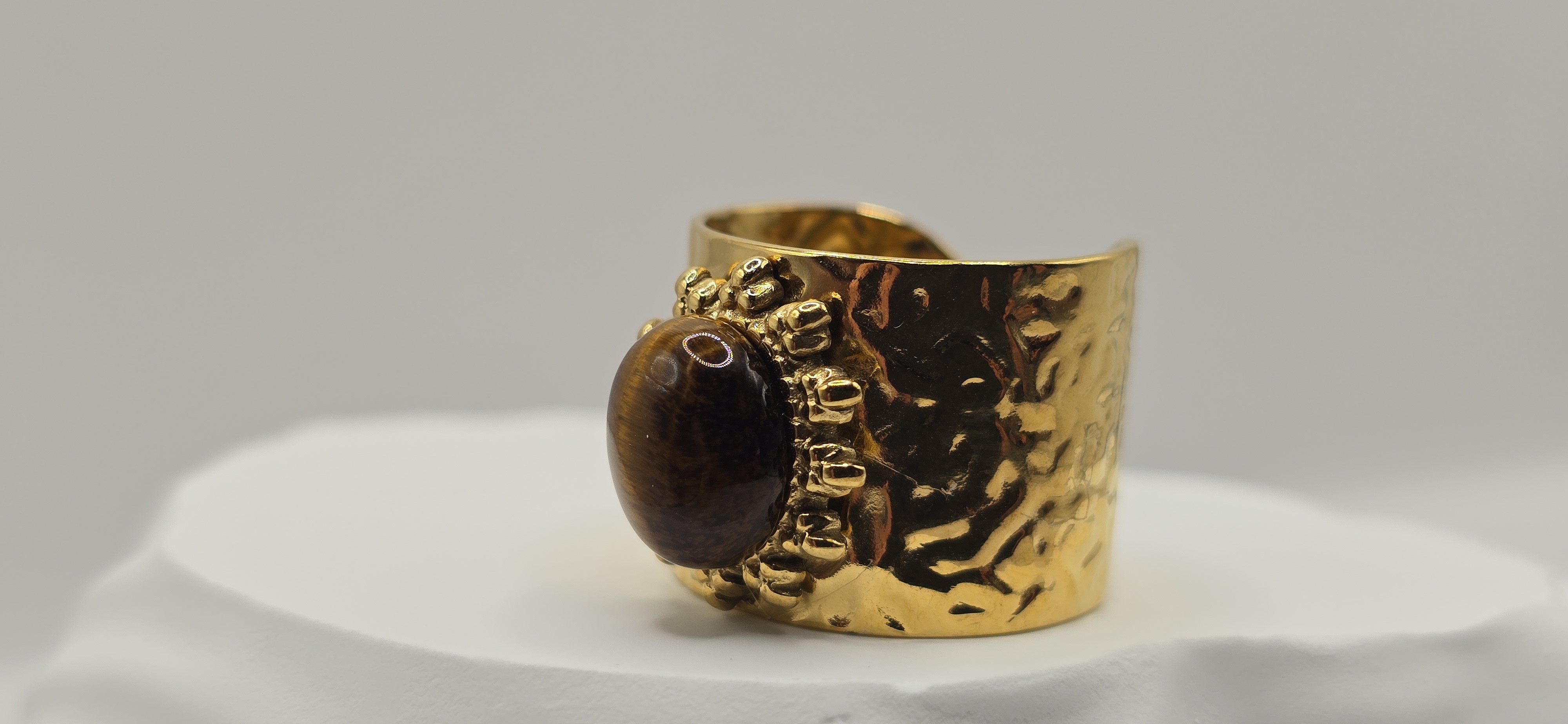Un bijou de caractère qui fusionne l'éclat solaire et la force sauvage. Cette manchette large, avec sa texture martelée et son œil de tigre naturel, est une pièce d’affirmation indispensable à votre collection.