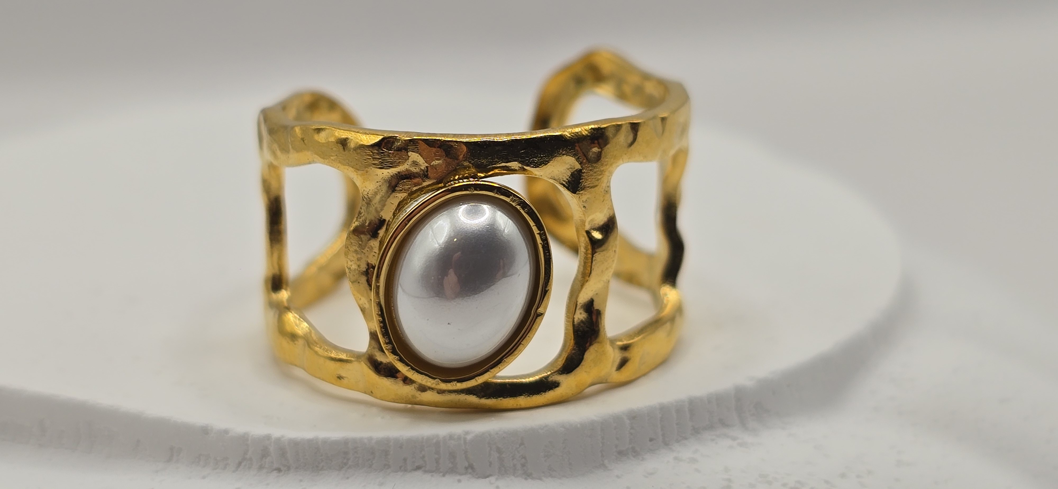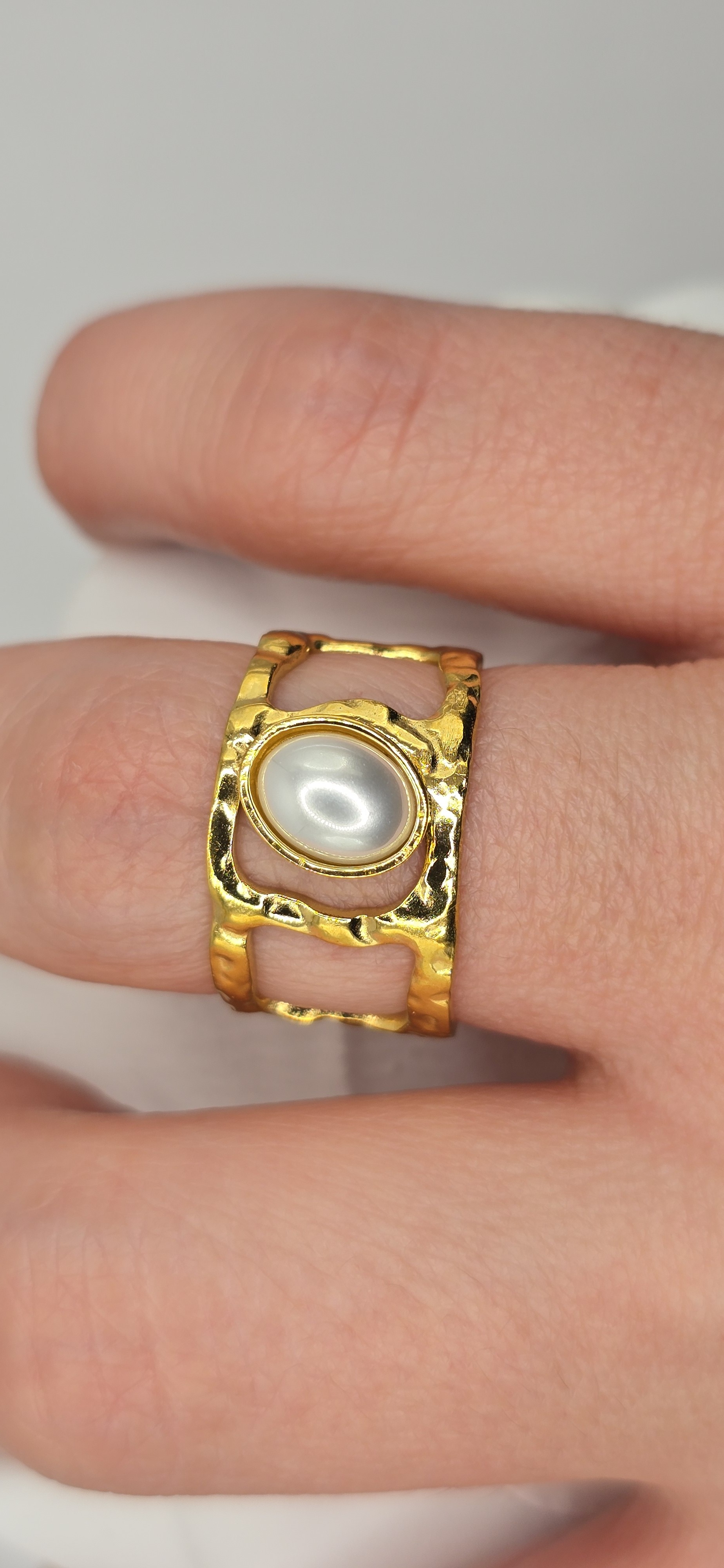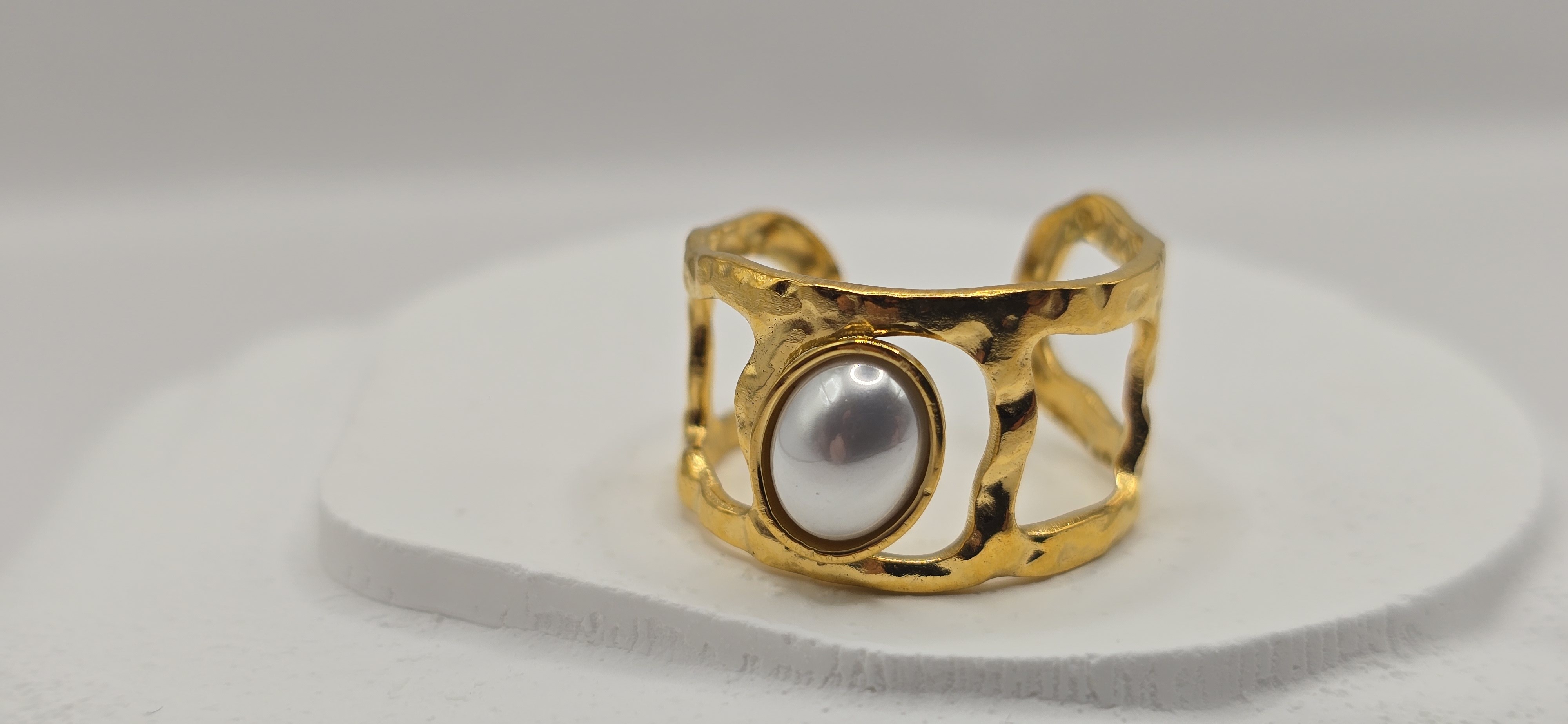 Inspirée de l’esthétique joaillière, cette bague large en plaqué or 18k se distingue par son travail de métal martelé et ajouré. En son centre, une perle aux reflets nacrés apporte un contraste élégant et intemporel.