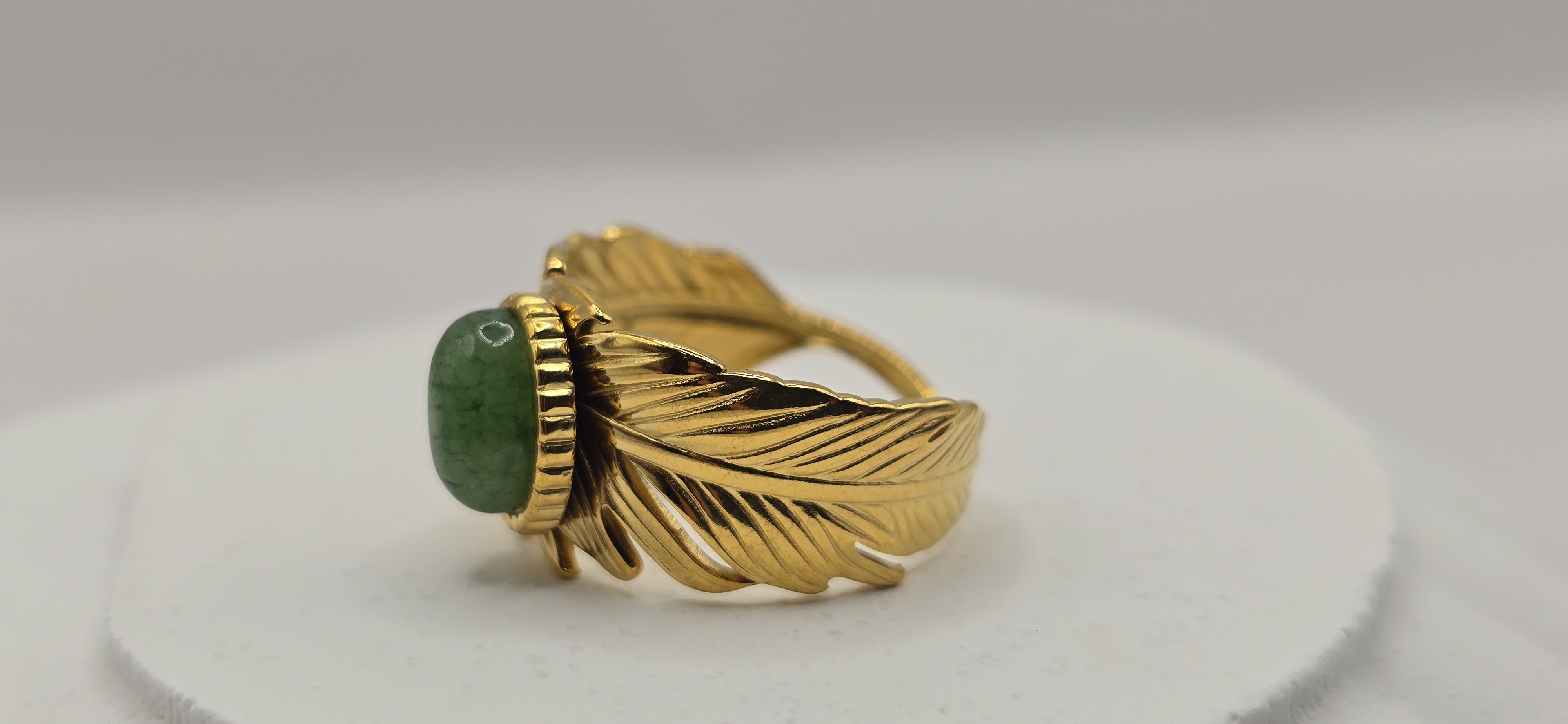Une bague de caractère au style bohème-vintage qui allie la finesse d'une plume sculptée à la profondeur d'un cabochon vert forêt. Un bijou intemporel, conçu pour durer.