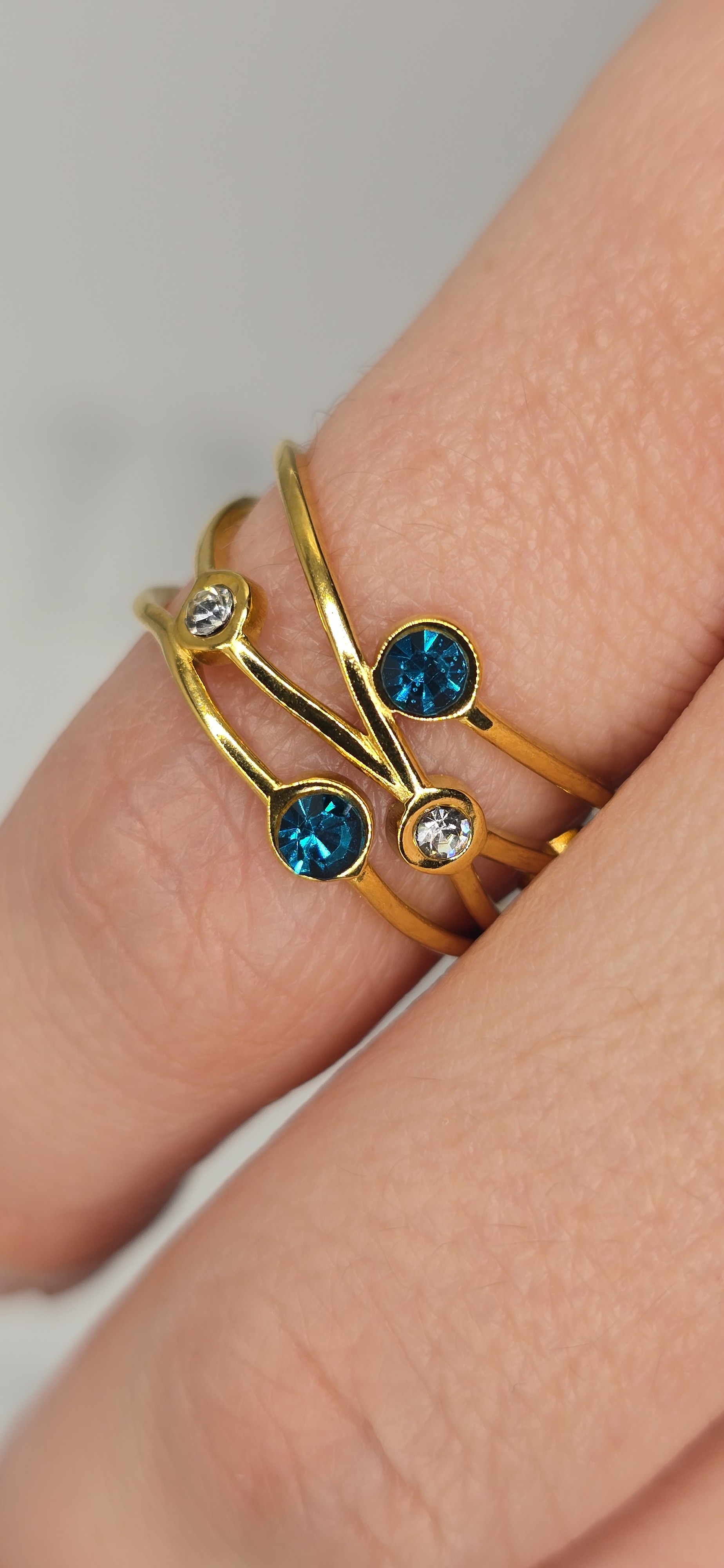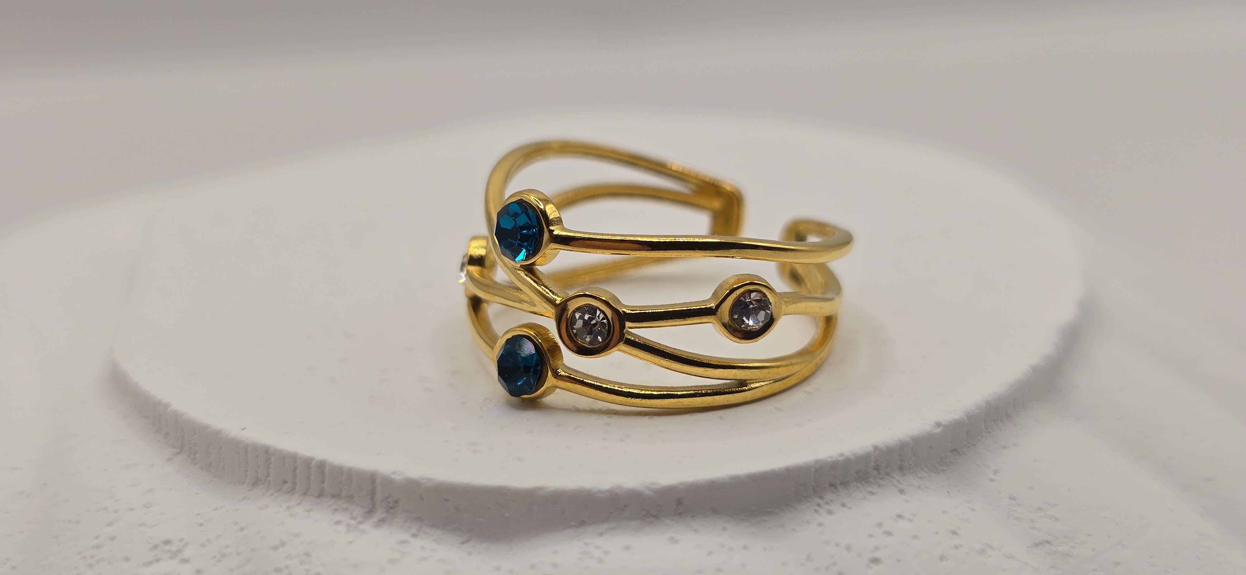 La bague Océane capture l'élégance des fonds marins. Son design unique simule l'accumulation de plusieurs anneaux fins entrelacés, parsemés de cristaux étincelants évoquant la pureté des saphirs et des diamants.