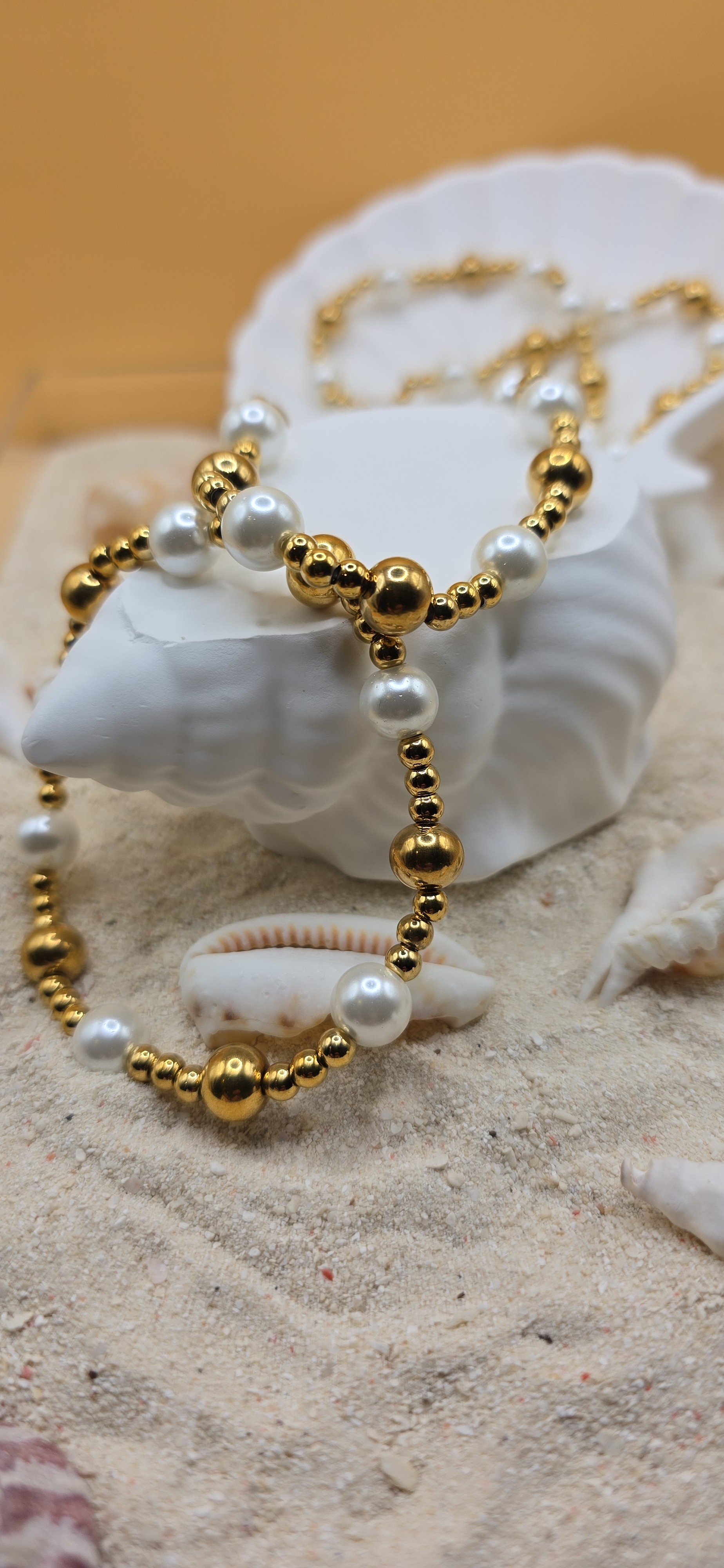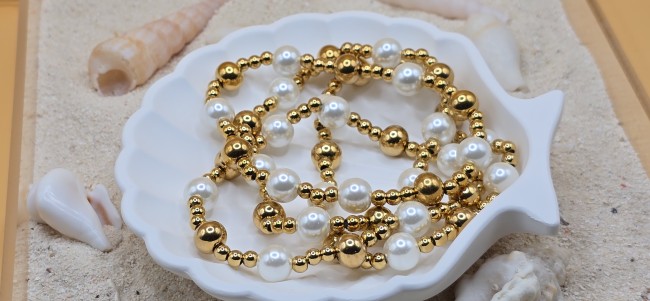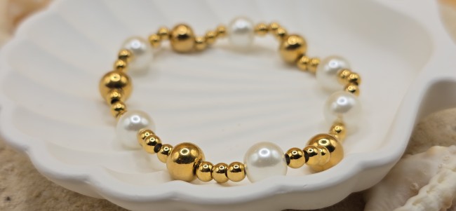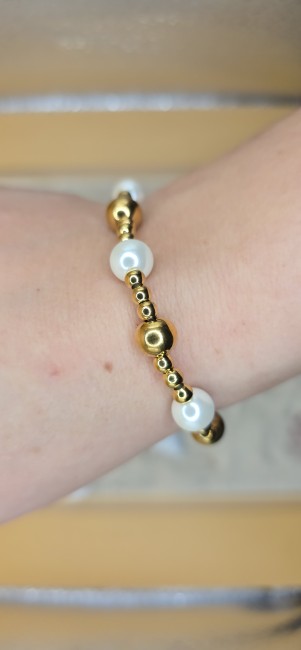 Le bracelet Naïs allie la douceur lumineuse des perles d’eau douce à l’éclat raffiné des perles dorées en acier inoxydable 304.