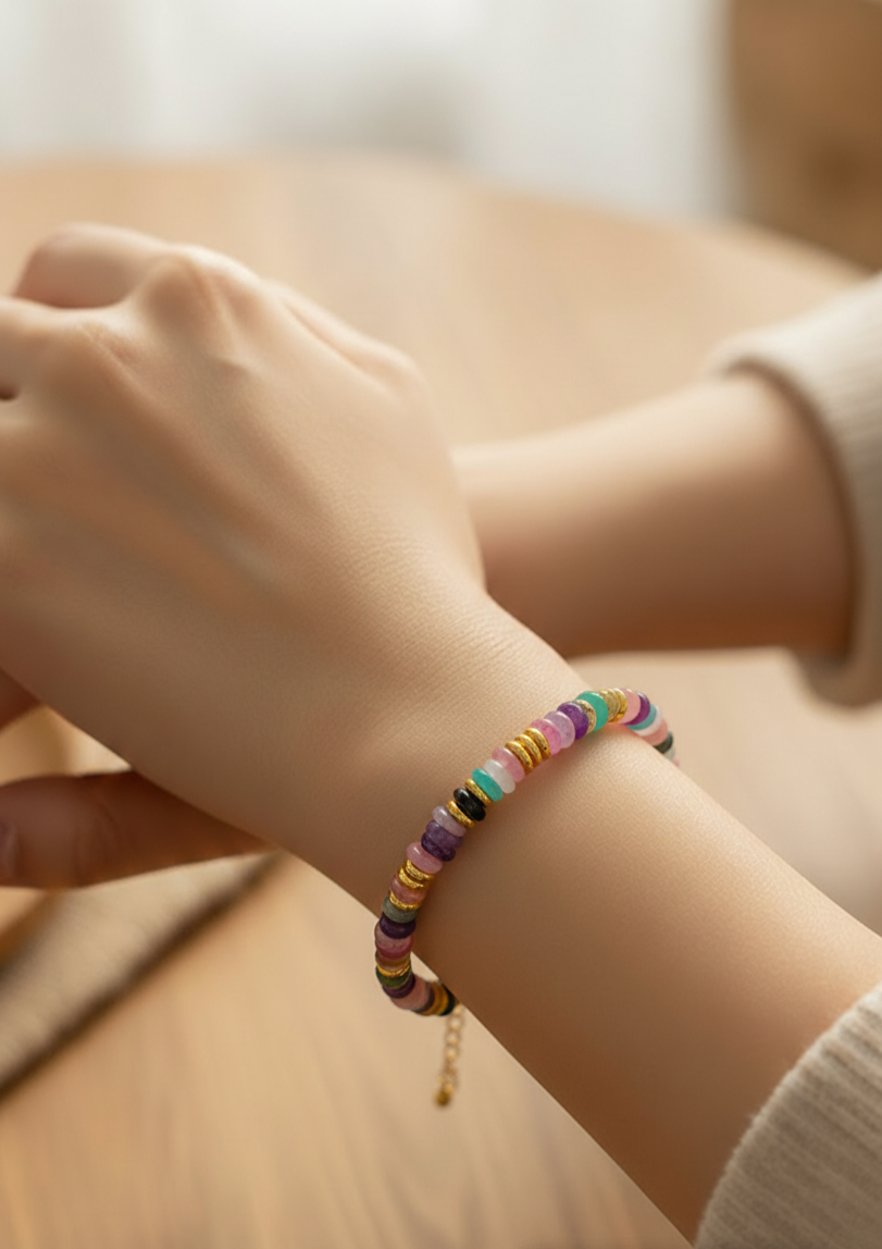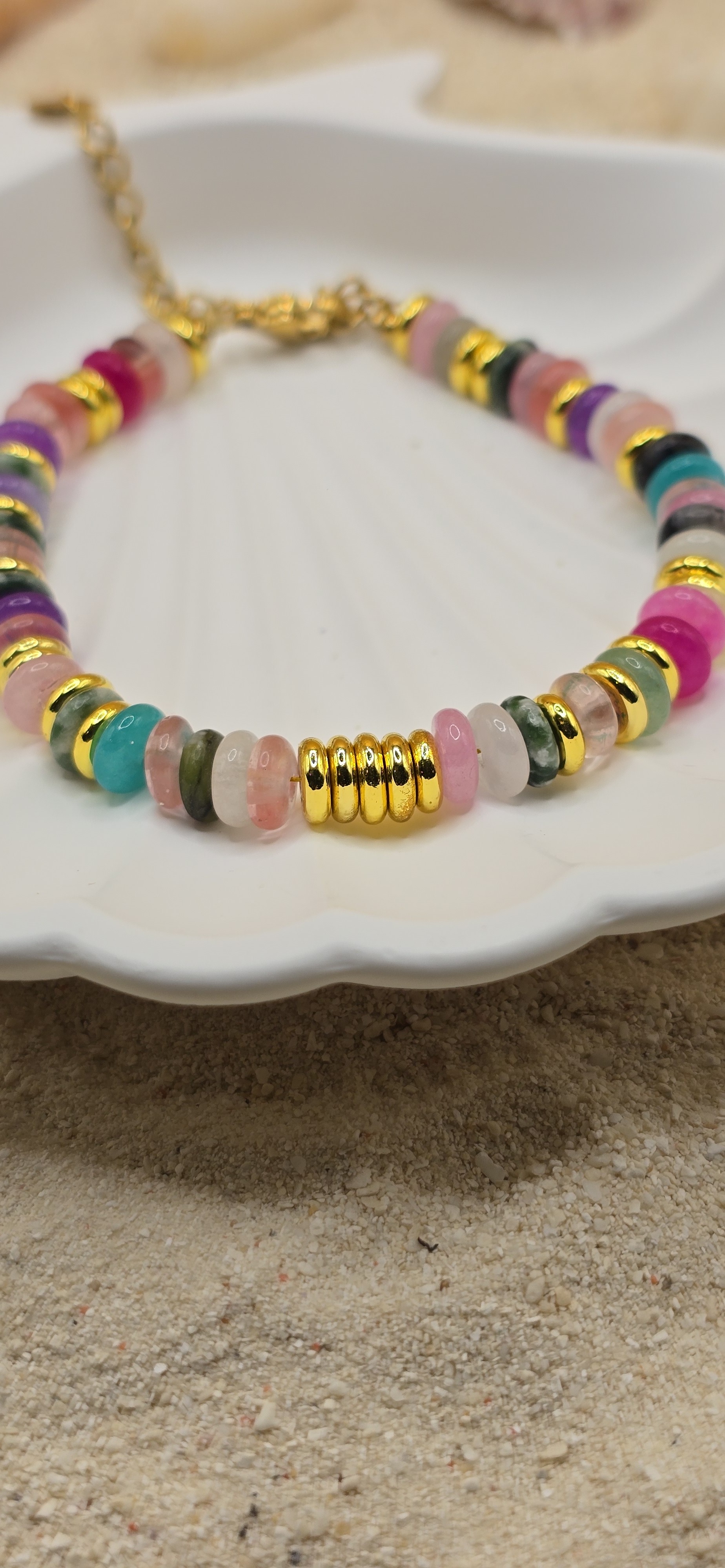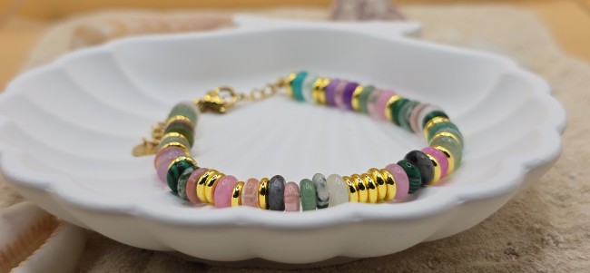 Les perles colorées sont sublimées par des intercalaires dorés en acier inoxydable, pour un bijou lumineux et facile à porter au quotidien.