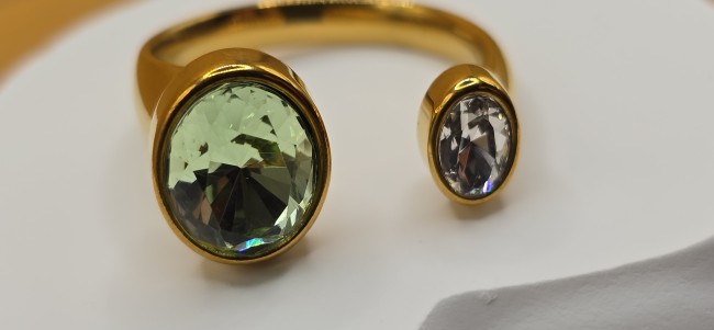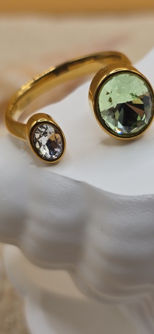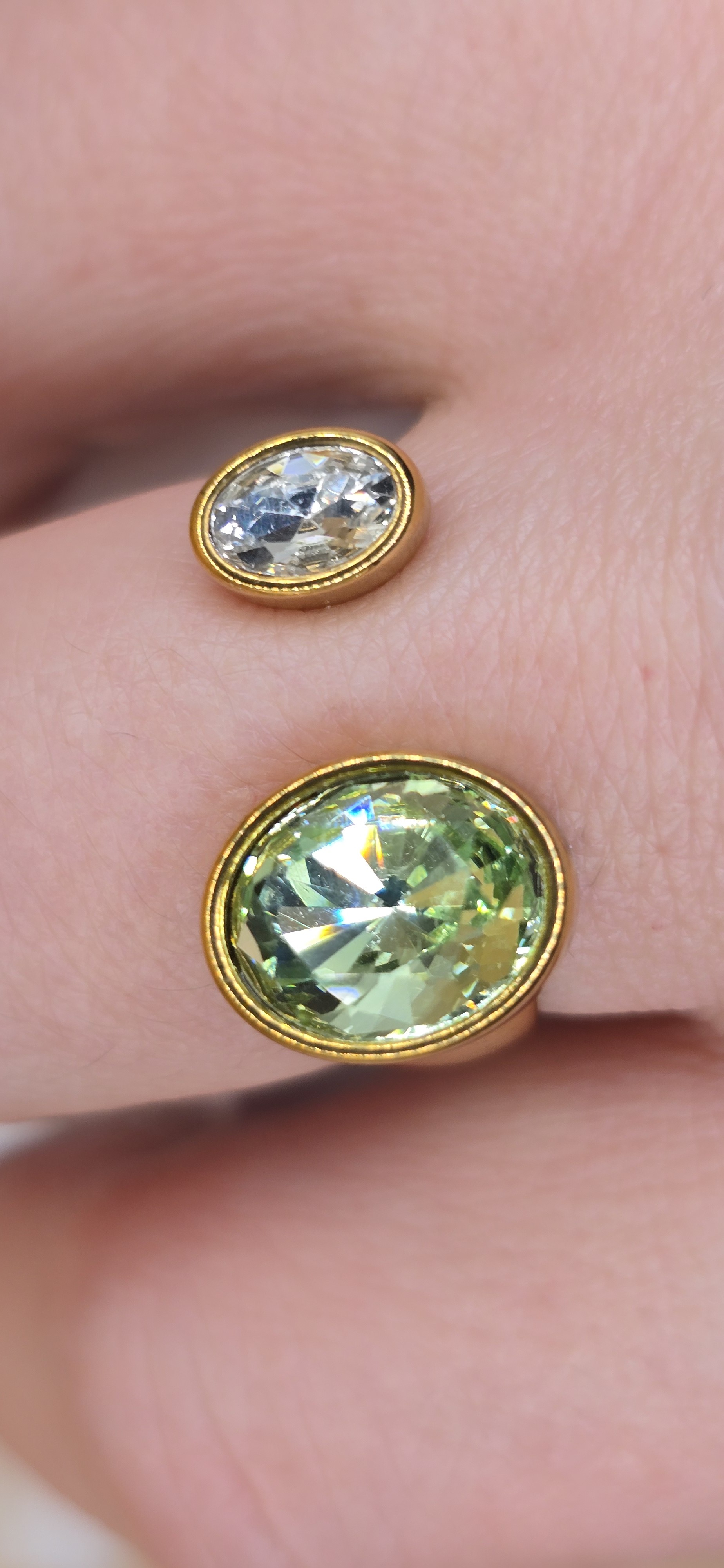 Deux pierres se font face : l’une vert doux, l’autre transparente aux reflets subtils.