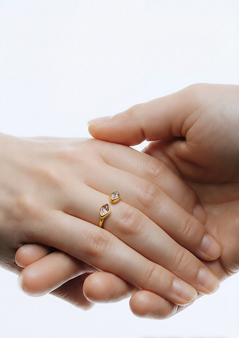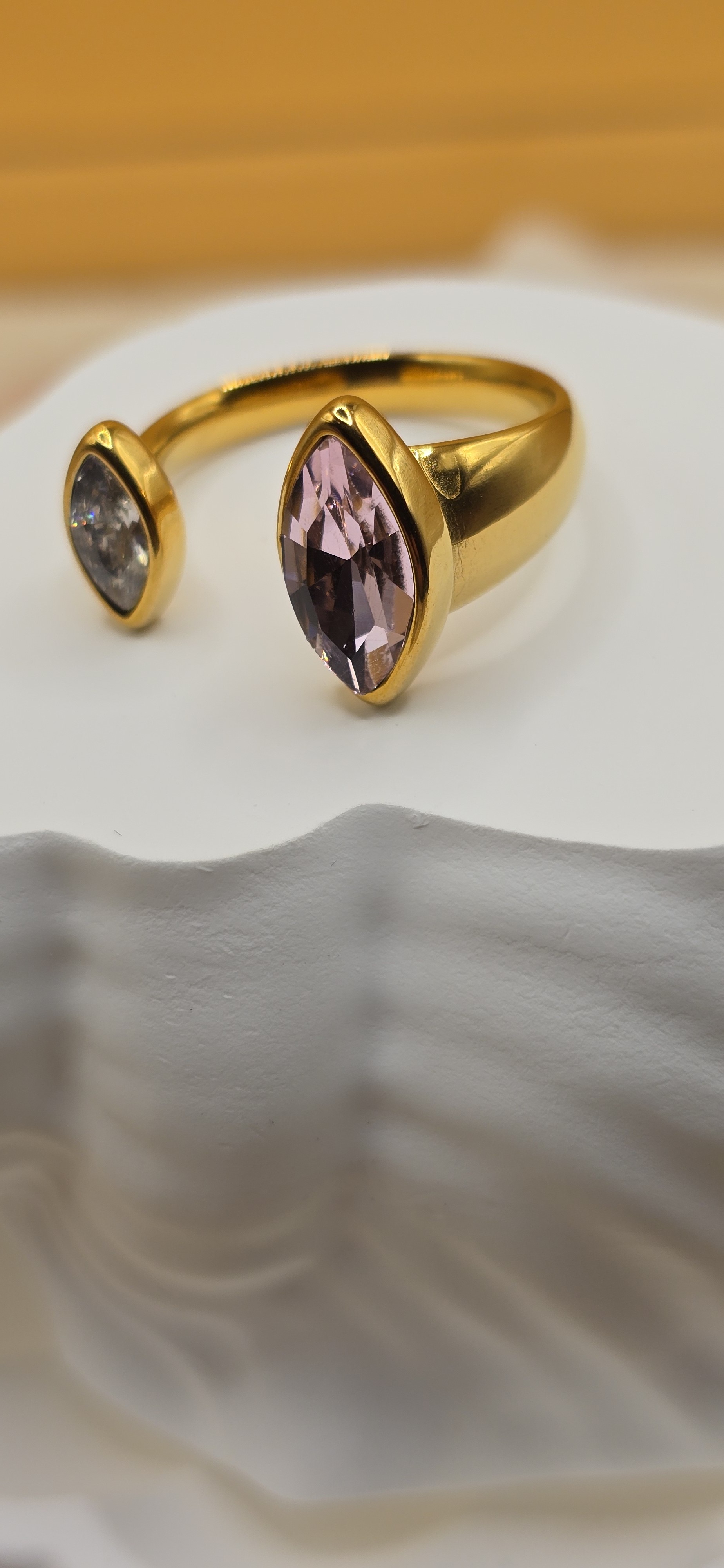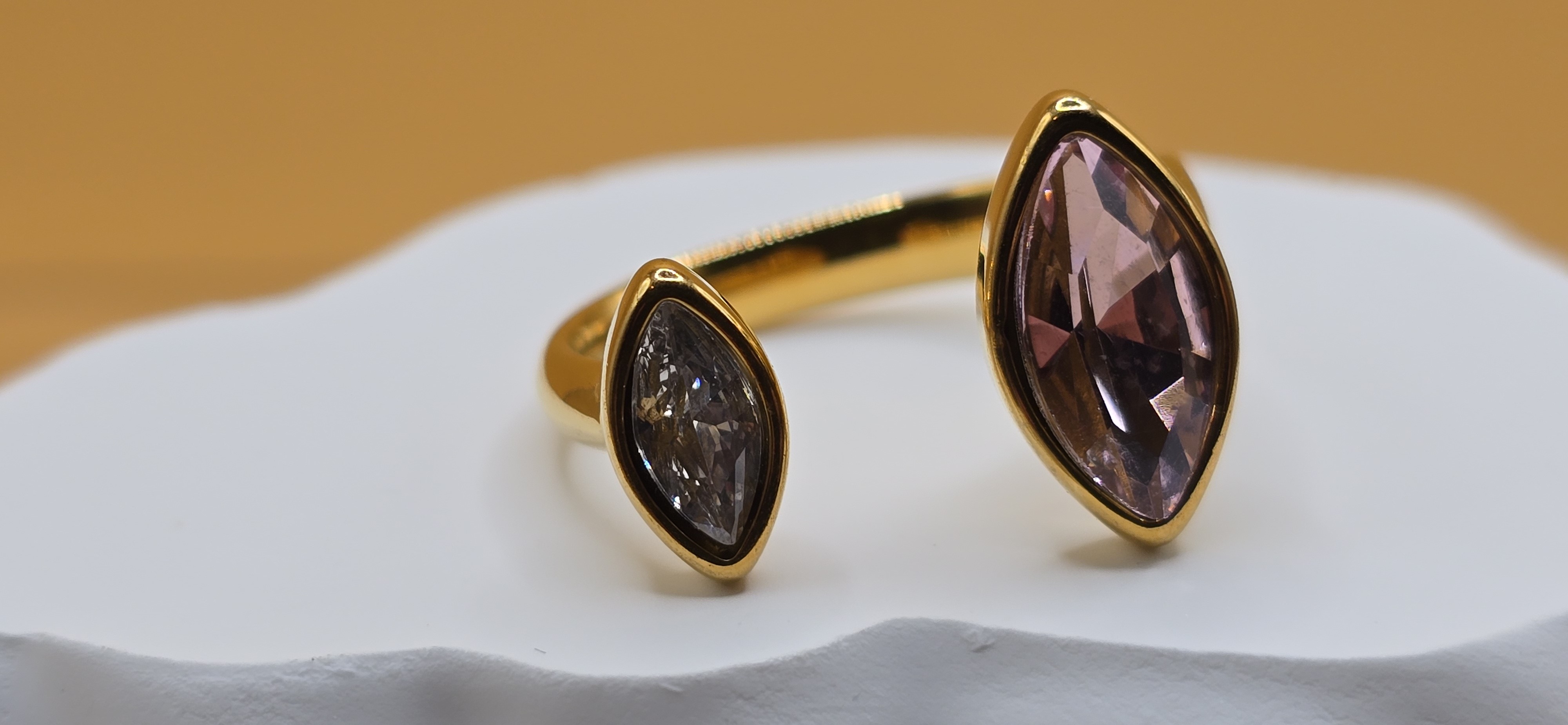 L'élégance à fleur de peau. Découvrez la bague Alba, une création au design ouvert alliant modernité et éclat. Ses deux pierres facettées taille marquise capturent la lumière pour sublimer votre main avec finesse. Une pièce sélectionnée avec soin pour son allure sculpturale et intemporelle.