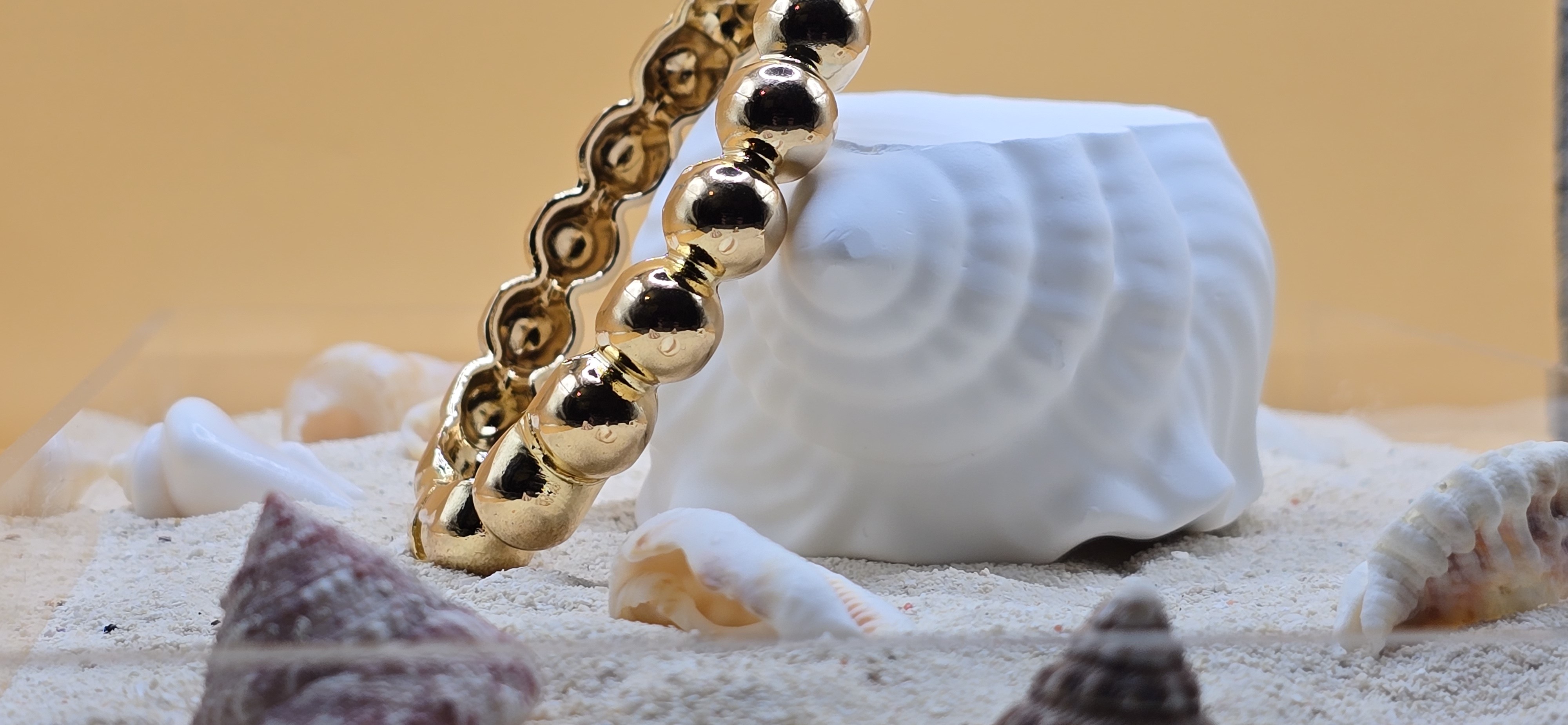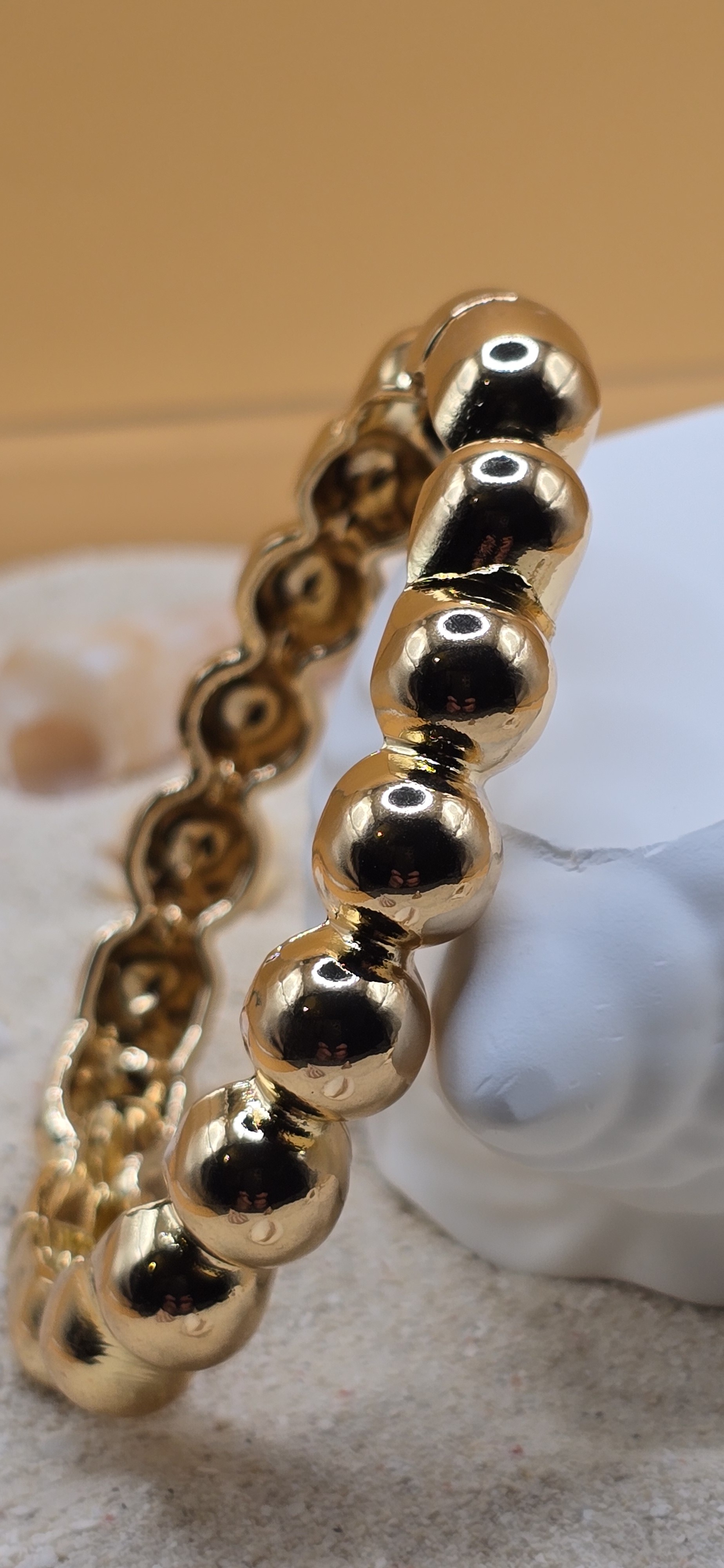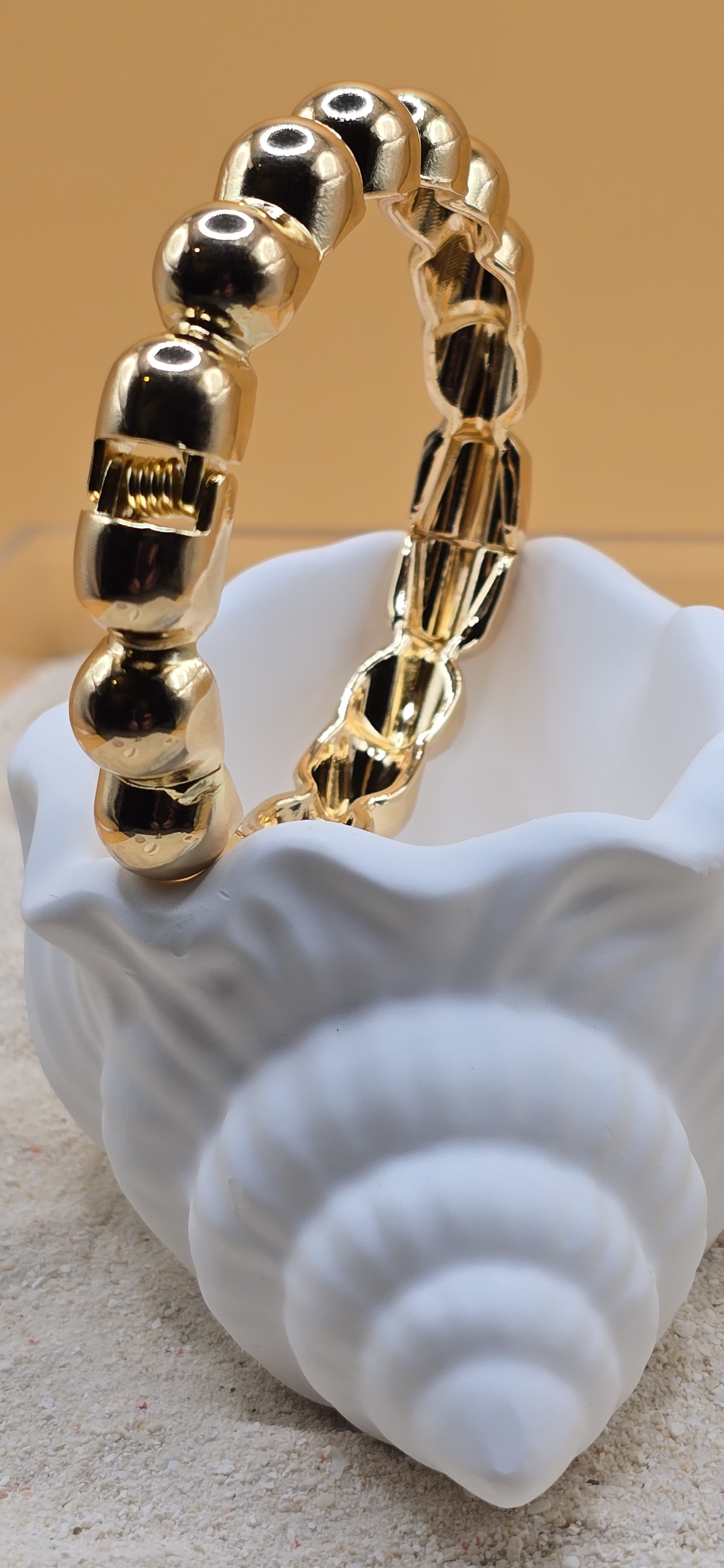 Jouez avec la lumière grâce à ce jonc aux courbes sphériques. Conçu en acier inoxydable, ce bracelet résiste à l’eau et garde son éclat doré sans jamais ternir. Un design graphique et luxueux pour un style affirmé au quotidien. ✨