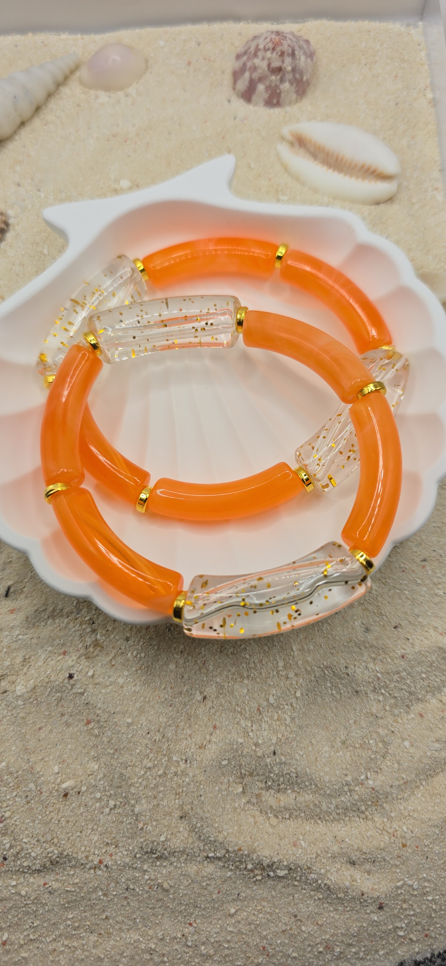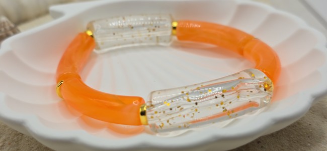 ​Design : Tubes incurvés alternant orange opaque et transparent pailleté.