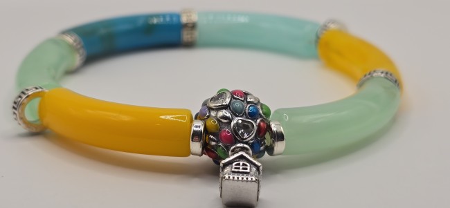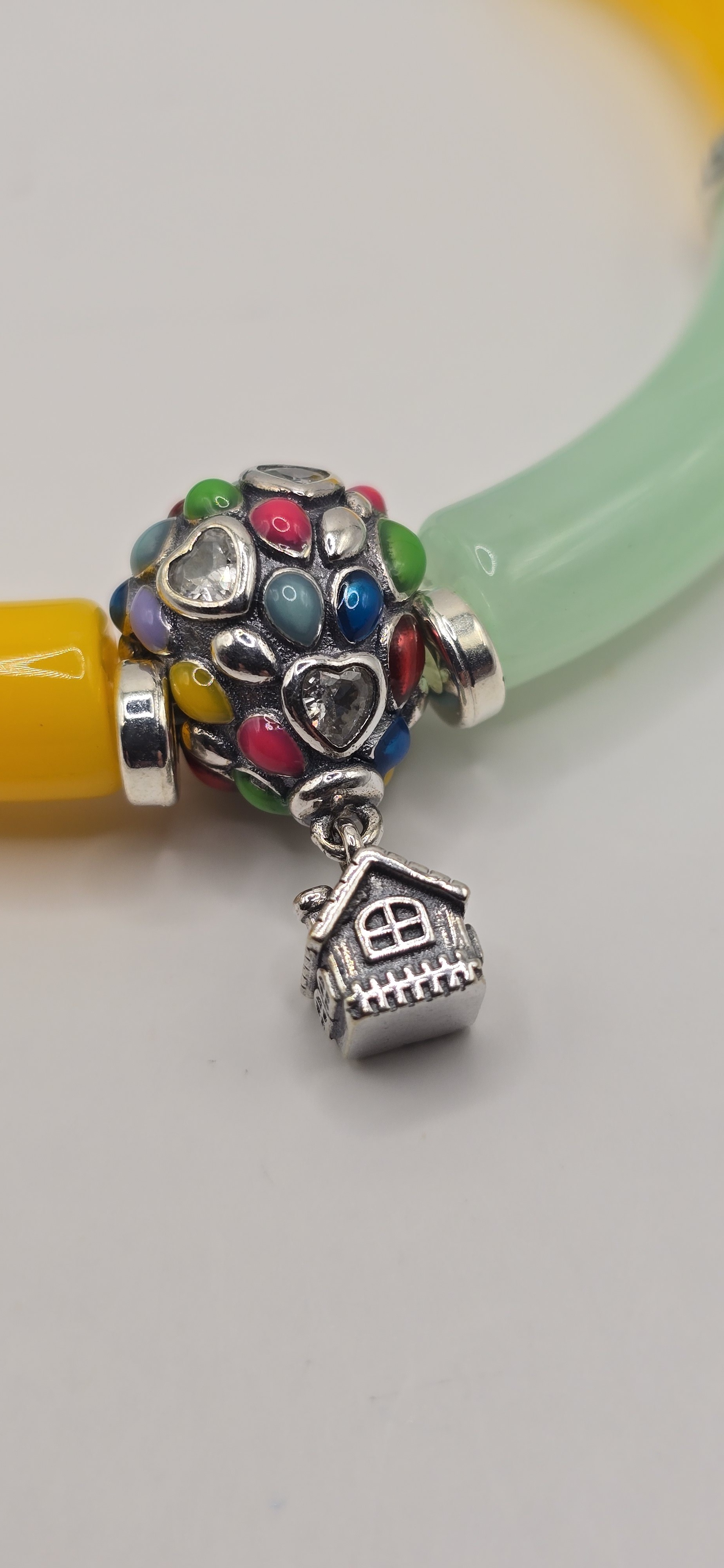 🎈 Détails Magiques : Perle centrale sertie de cœurs brillants et d'émaux multicolores avec son charm maison suspendu.