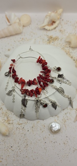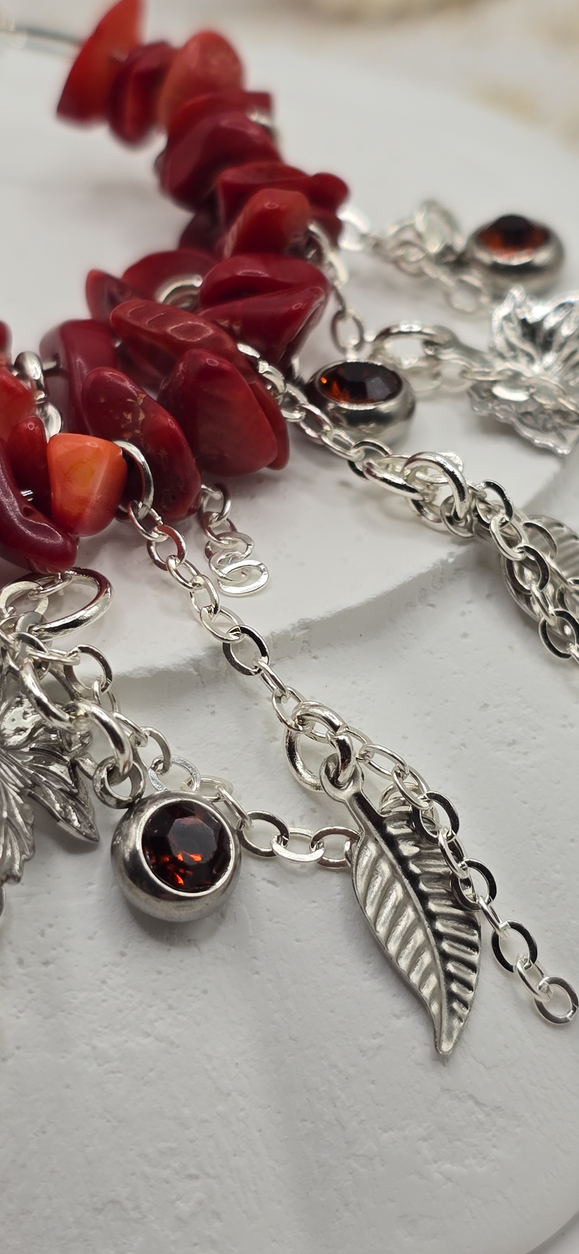 âMatières : Pierres naturelles rouges, feuilles ciselées argentées, cristaux facettés.